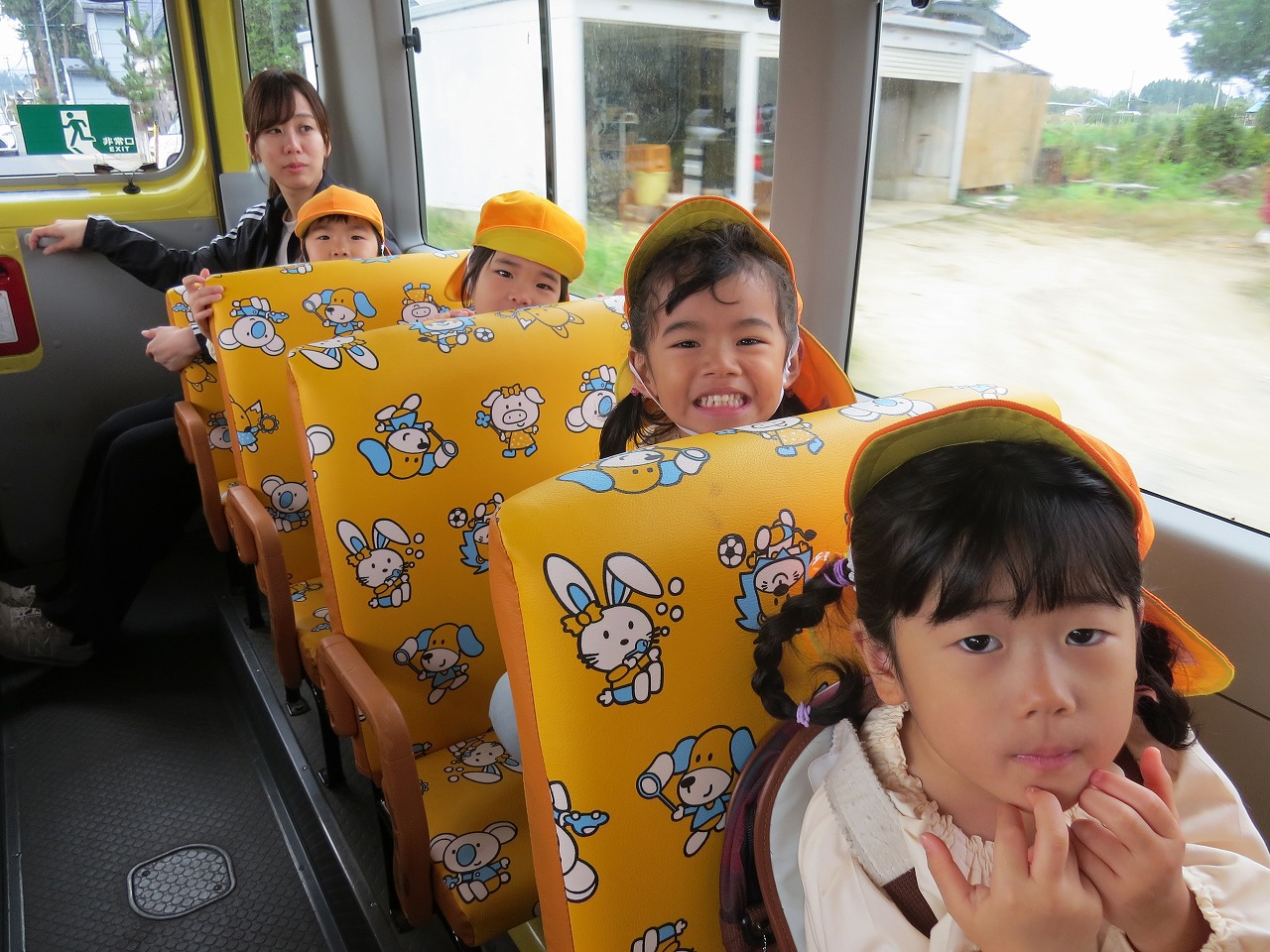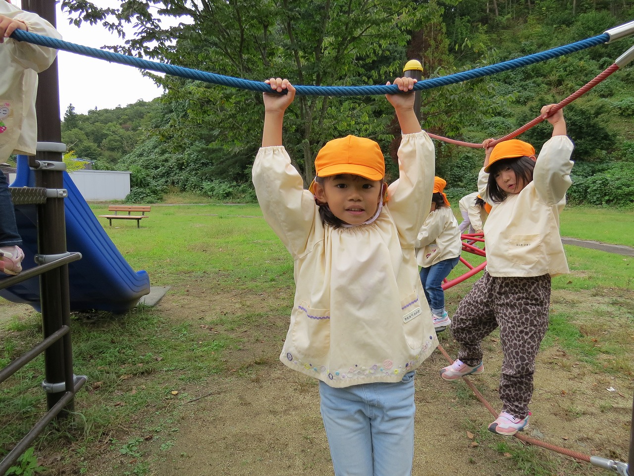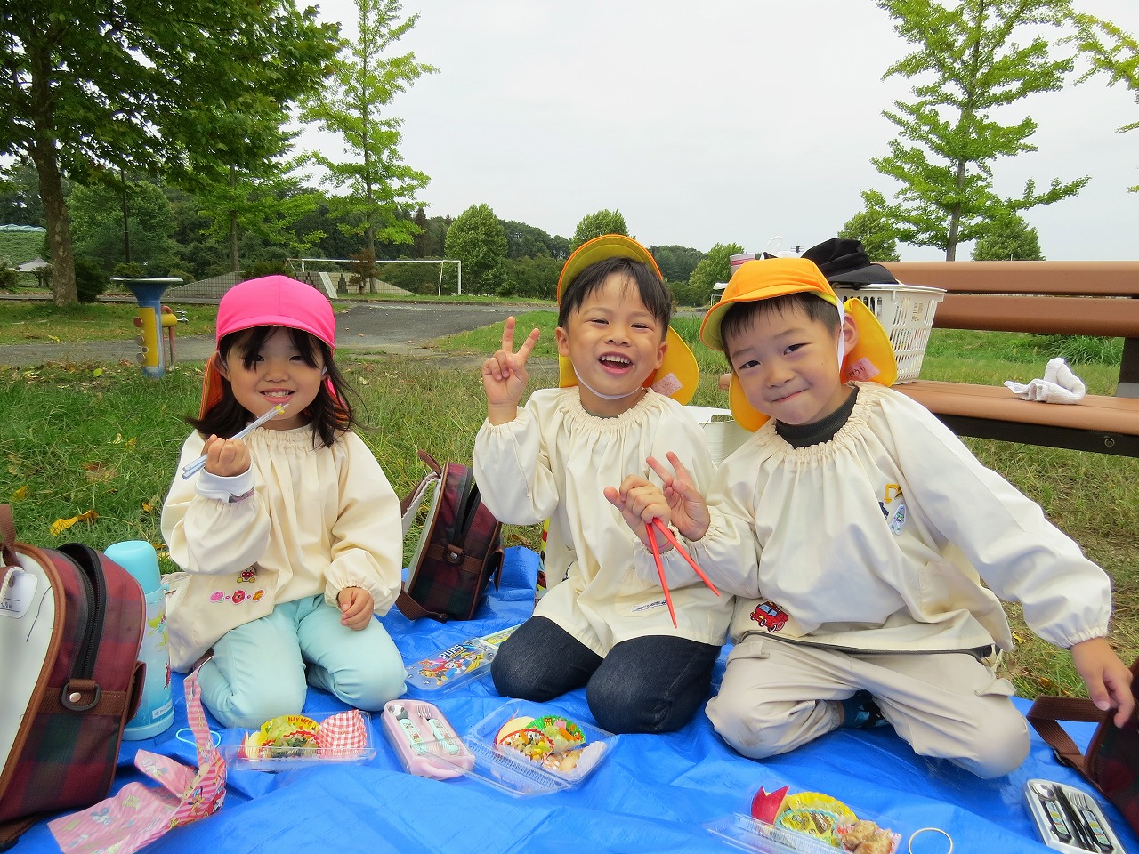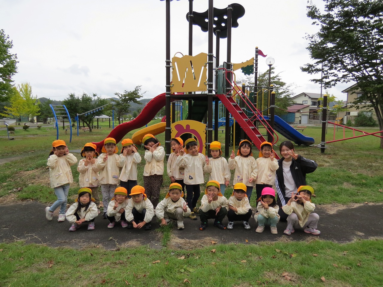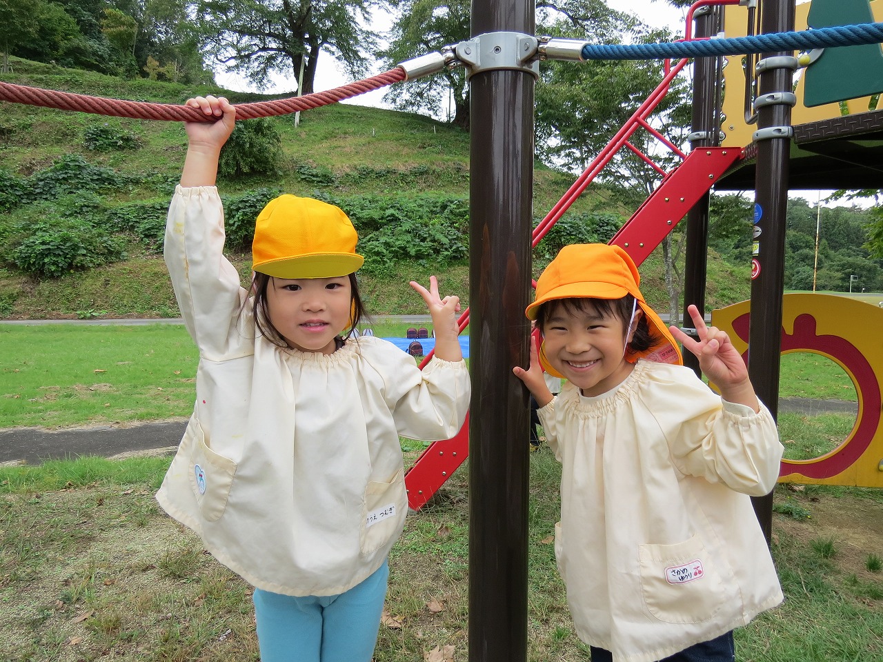 10月14日(火)は、すみれ組で園外保育に出かけました。目的地は高畠中央公園です。子どもたちもワクワクしながらバスに乗り込み出かけました。公園では、何度も長い滑り台を滑ることを楽しんだり、アスレチック遊具での遊びを楽しみました。たくさん体を動かして遊び、「お腹すいたー!」と給食の先生に作ってもらったお弁当はあっという間に完食でした。昼食に入った頃にパラパラと雨が落ちてきて心配しましたが、すぐに降りやみホッと一安心。楽しい時間を過ごしてくることができました。