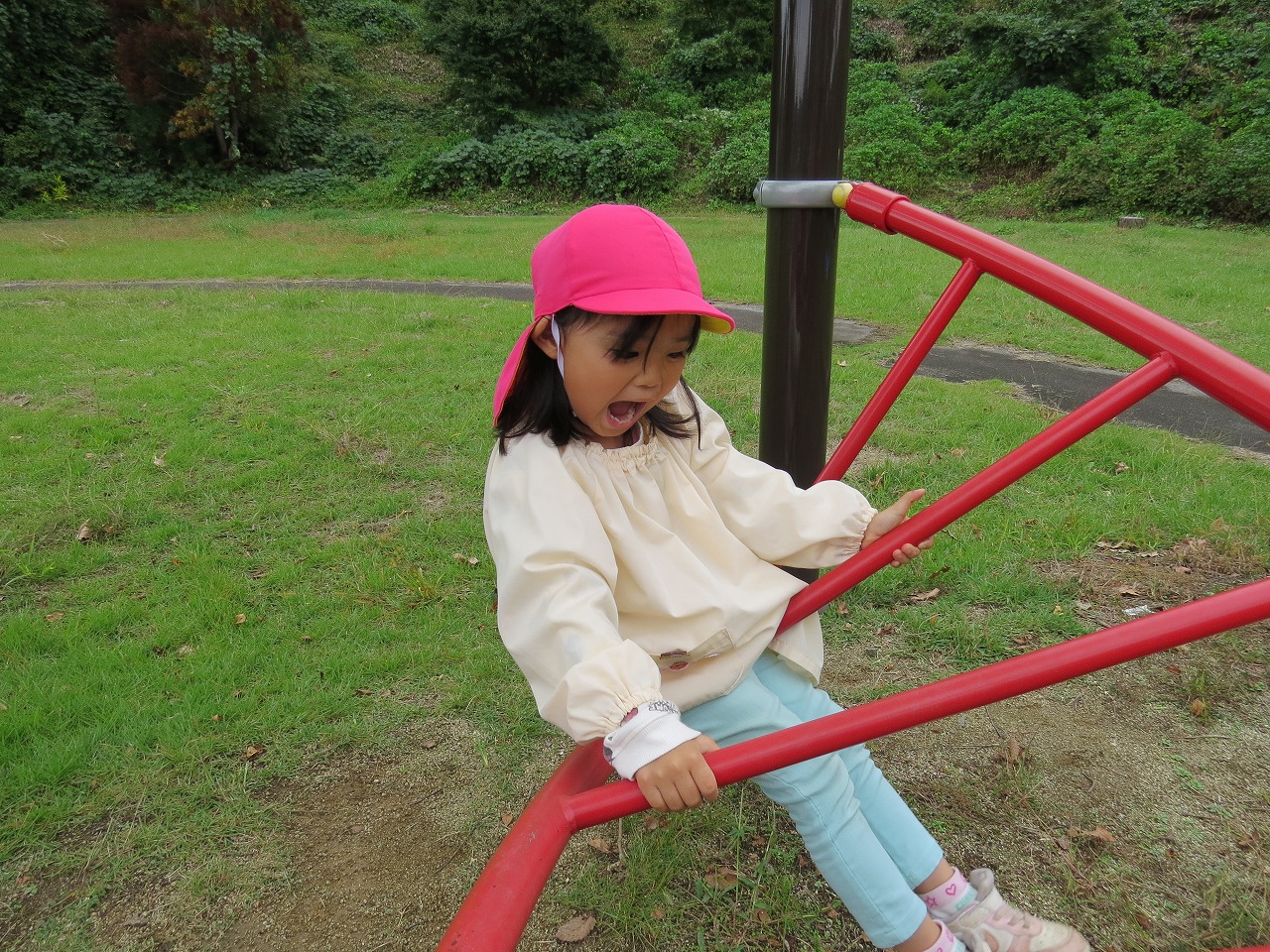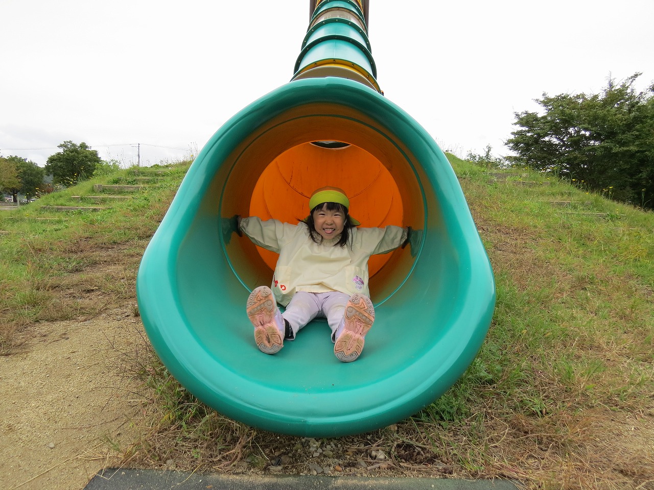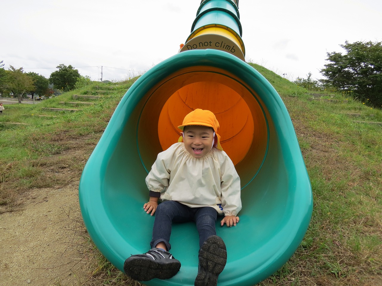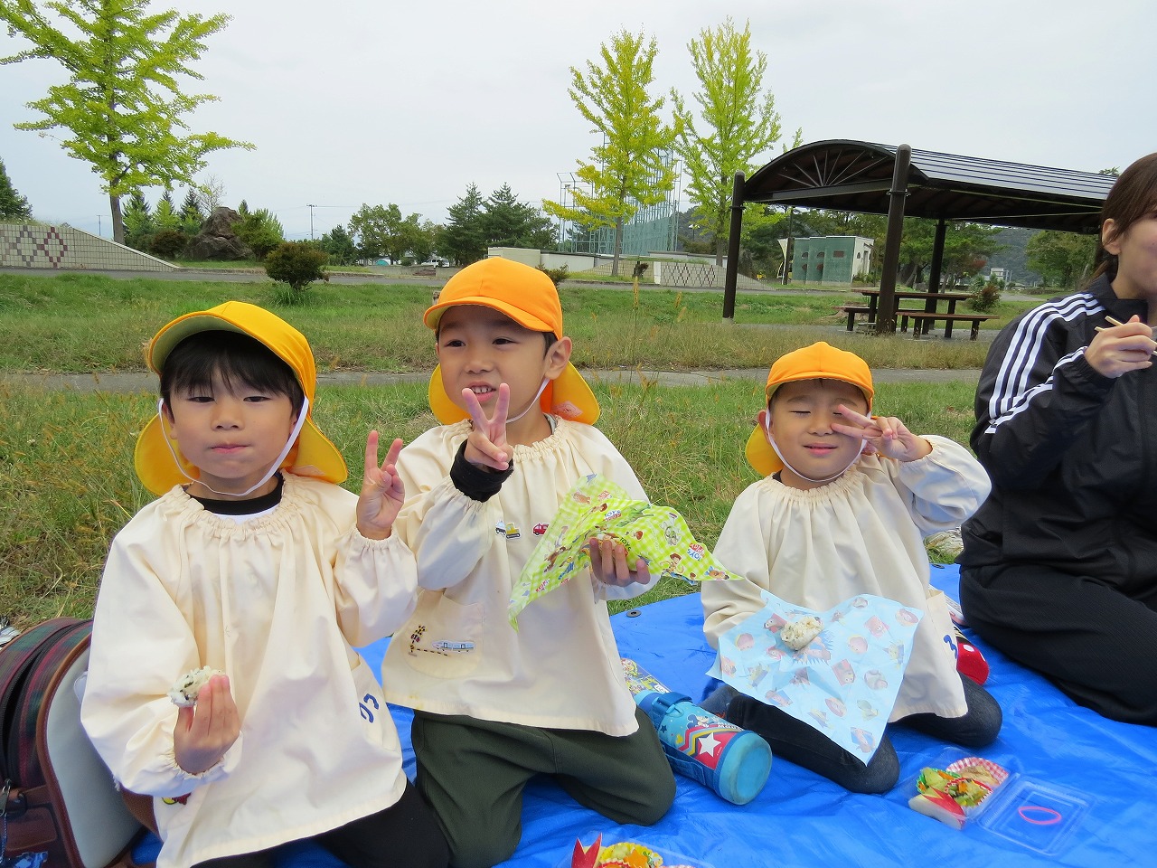 10月14日(火)は、すみれ組で園外保育に出かけました。目的地は高畠中央公園です。子どもたちもワクワクしながらバスに乗り込み出かけました。公園では、何度も長い滑り台を滑ることを楽しんだり、アスレチック遊具での遊びを楽しみました。たくさん体を動かして遊び、「お腹すいたー!」と給食の先生に作ってもらったお弁当はあっという間に完食でした。昼食に入った頃にパラパラと雨が落ちてきて心配しましたが、すぐに降りやみホッと一安心。楽しい時間を過ごしてくることができました。