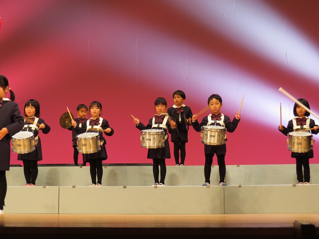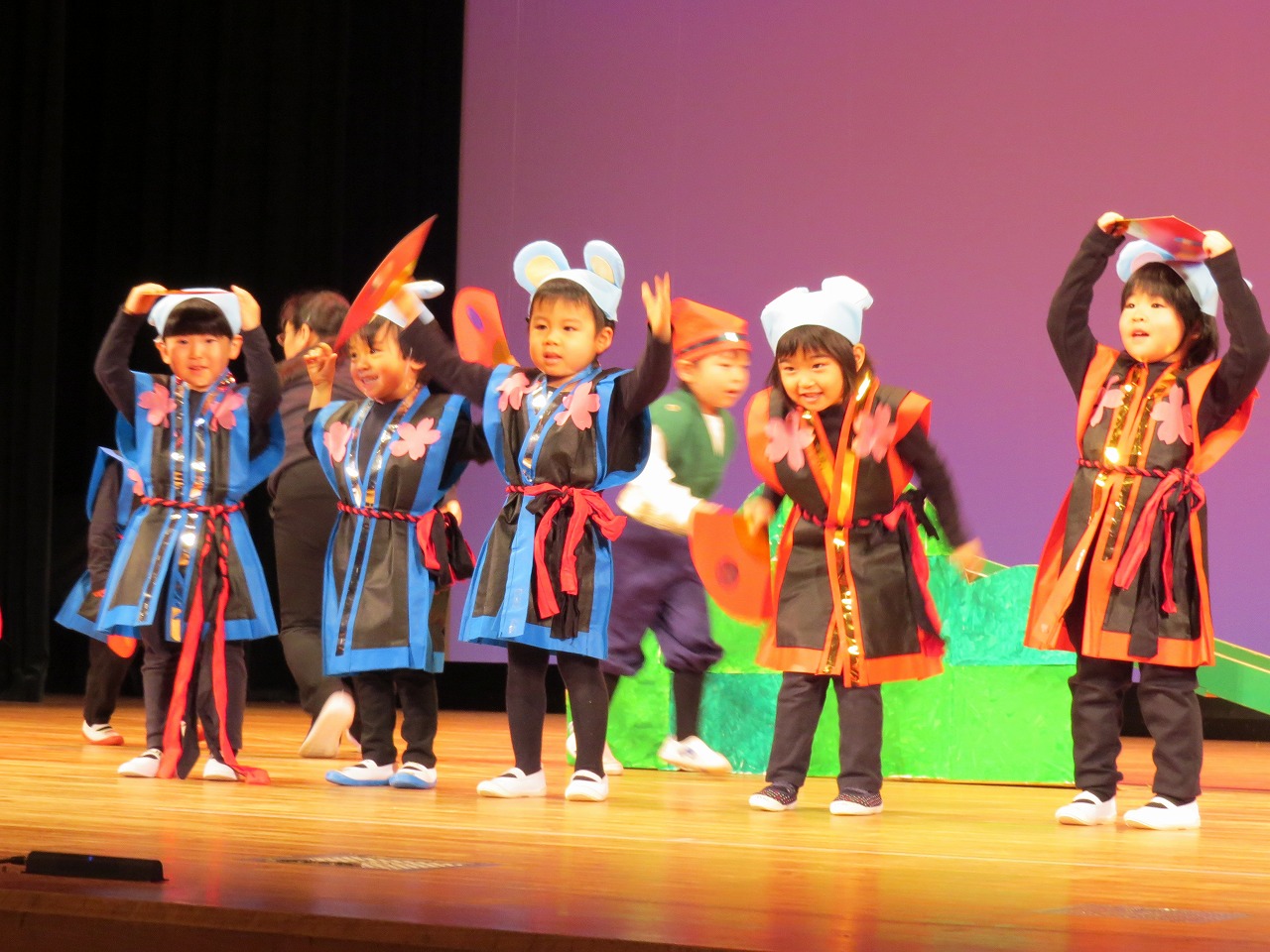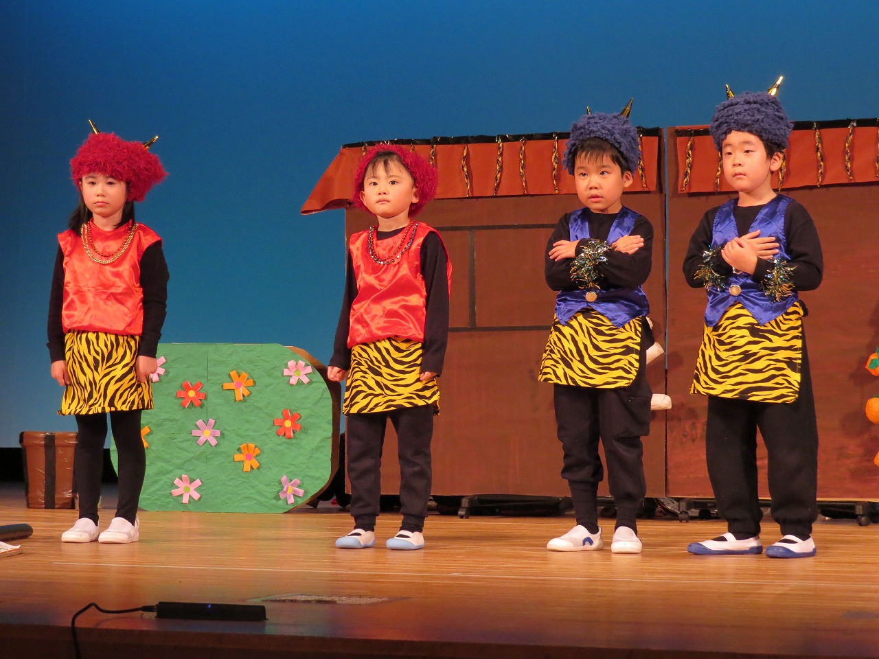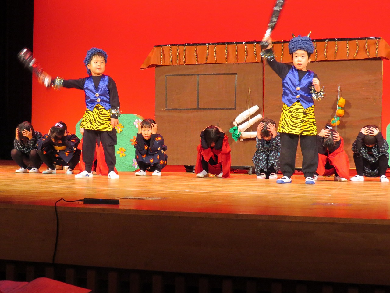 12月18日(木)は発表会を行いました。今年一年こどもたちが頑張ってきたことを保護者の方にも見て頂けるよう、それぞれのクラスが工夫しながら取り組んできました。さくら組さんは合奏や歌、オペレッタ「おむすびころりん」に挑戦!すみれ組さんは鼓隊演奏とミュージカル「シンデレラ」に挑戦しました。そして、ふじ組さんはアンサンブル奏「ディズニーメドレー」と劇「泣いたあかおに」を年長児らしく発表してくれました!本番の舞台裏では、「緊張するー」とドキドキする子どもたちの様子が見られましたが、いざ舞台の上に立つと、みんな一生懸命に笑顔で演じることができました!発表が終わると「楽しかったー!!」という声がたくさん聞こえ、達成感や喜びを感じ、大きな自信へと繋がったようです。「また発表会やりたい!」という子もいた程、一人ひとり輝くことができました。