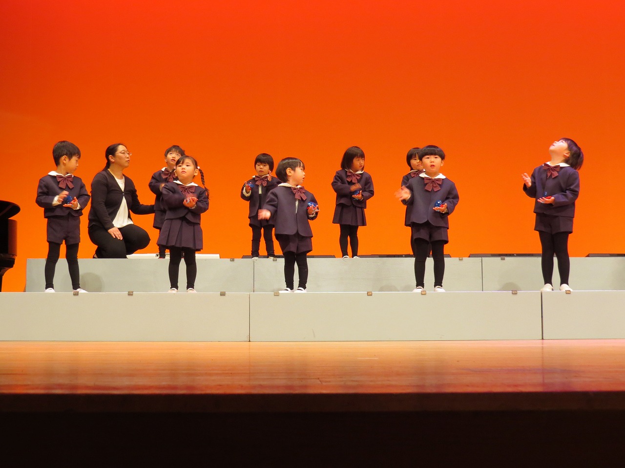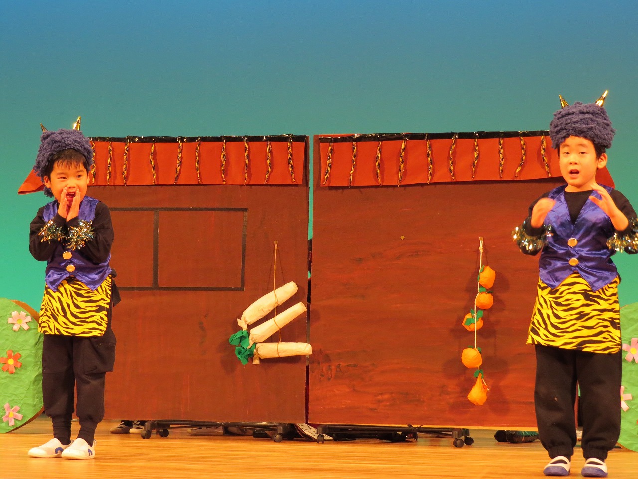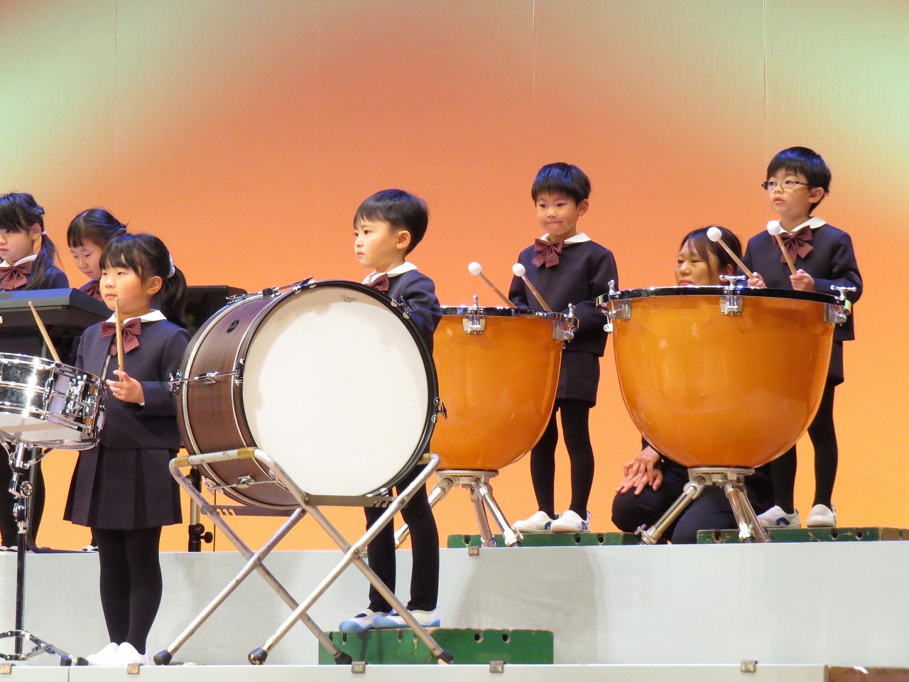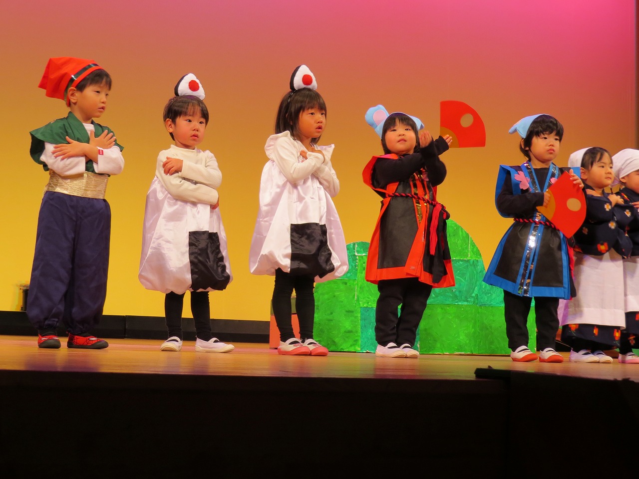 12月18日(木)は発表会を行いました。今年一年こどもたちが頑張ってきたことを保護者の方にも見て頂けるよう、それぞれのクラスが工夫しながら取り組んできました。さくら組さんは合奏や歌、オペレッタ「おむすびころりん」に挑戦!すみれ組さんは鼓隊演奏とミュージカル「シンデレラ」に挑戦しました。そして、ふじ組さんはアンサンブル奏「ディズニーメドレー」と劇「泣いたあかおに」を年長児らしく発表してくれました!本番の舞台裏では、「緊張するー」とドキドキする子どもたちの様子が見られましたが、いざ舞台の上に立つと、みんな一生懸命に笑顔で演じることができました!発表が終わると「楽しかったー!!」という声がたくさん聞こえ、達成感や喜びを感じ、大きな自信へと繋がったようです。「また発表会やりたい!」という子もいた程、一人ひとり輝くことができました。