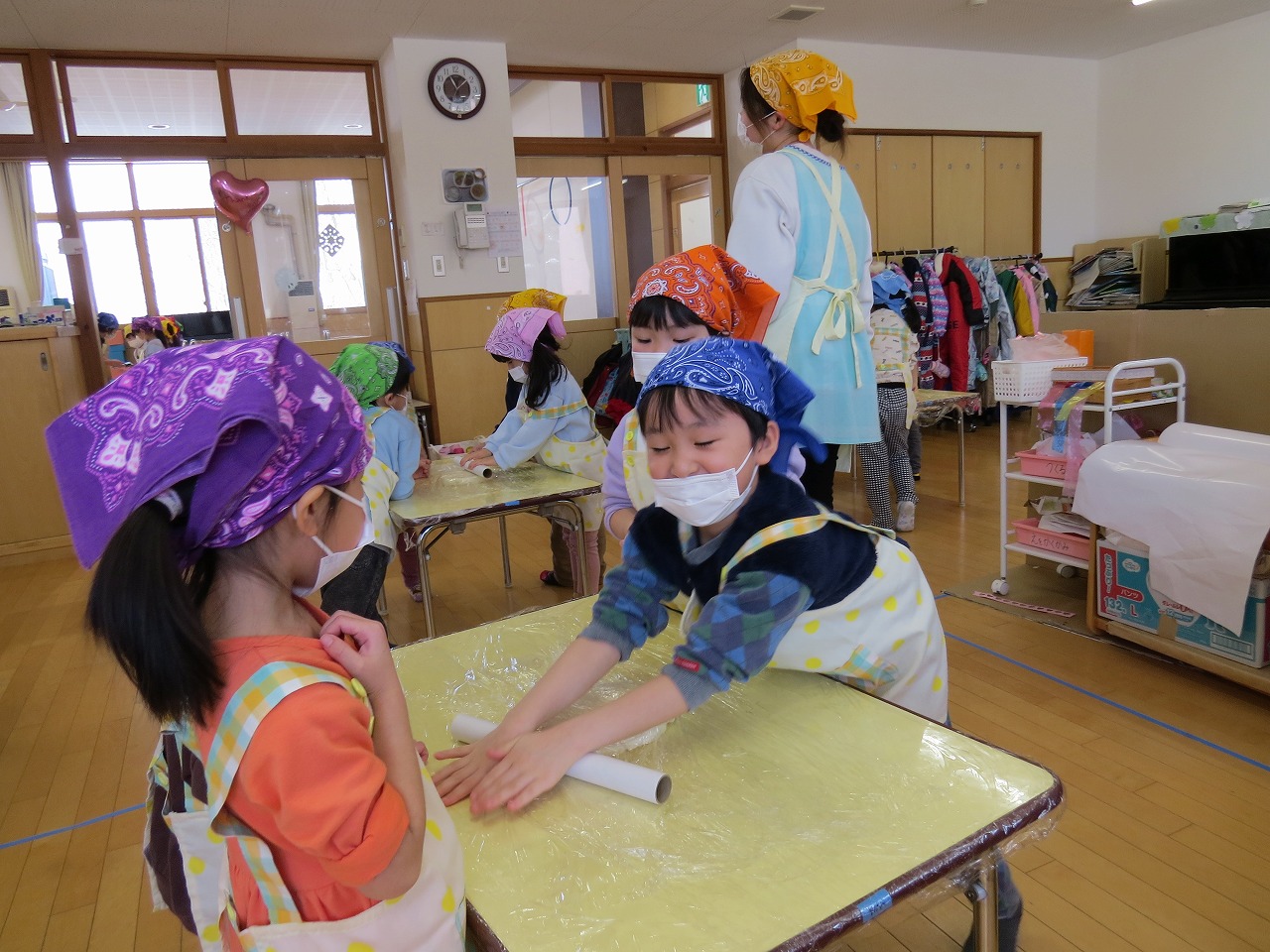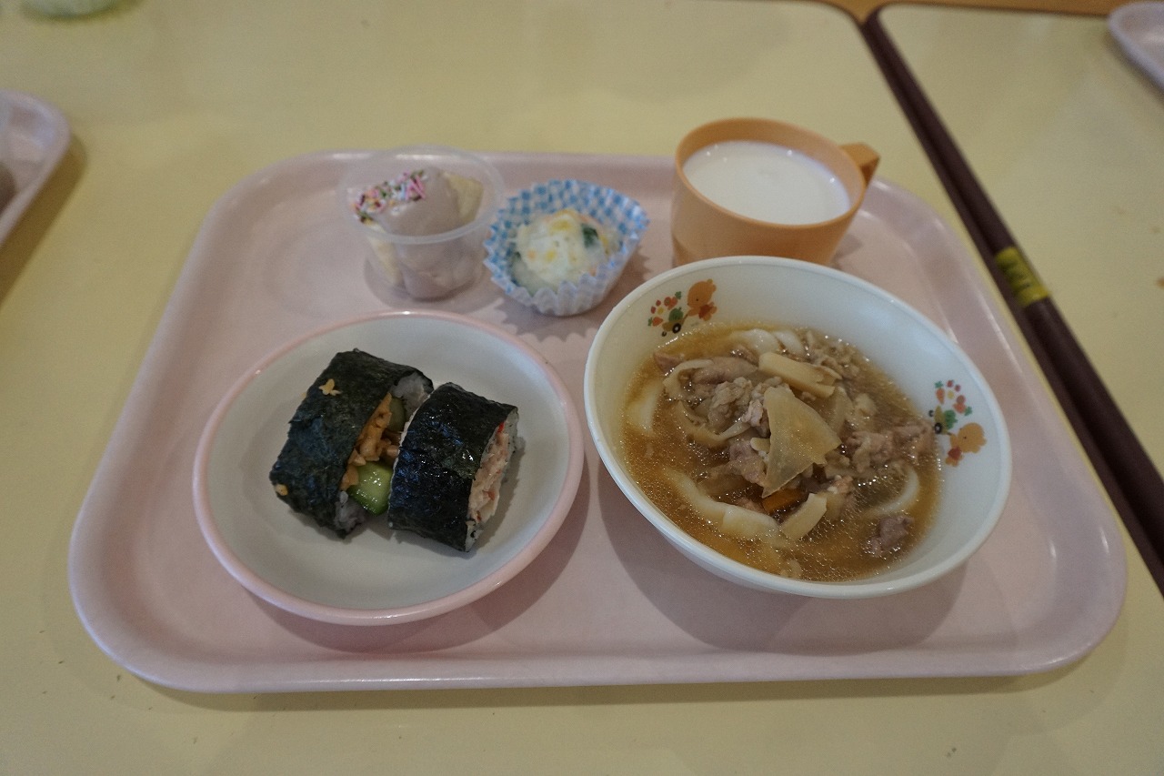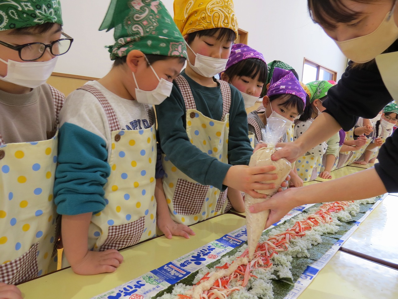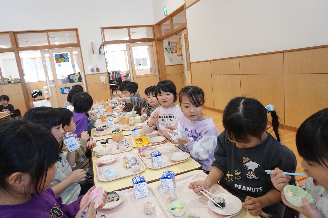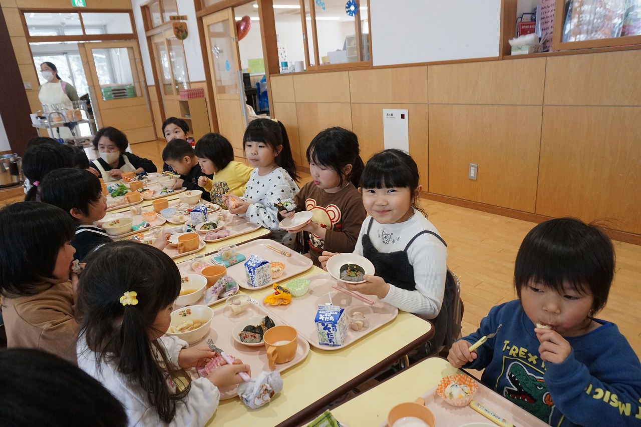 2月20日(金)はランチパーティーをしました!ふじ組はのり巻き、すみれ組は豚汁うどん、さくら組とぱんだ組はポテトサラダを作りみんなで食べることにしました。大きなのり巻きは息を合わせて巻くのことが難しかったようですが、みんなで協力して完成!うどんも一生懸命足でふみふみ、手でこねこねして伸ばし、こしのあるうどんになりました。ポテトサラダやデザートも愛情込めて美味しくでき、自分たちで作ったごはんに大満足の子どもたちでした。