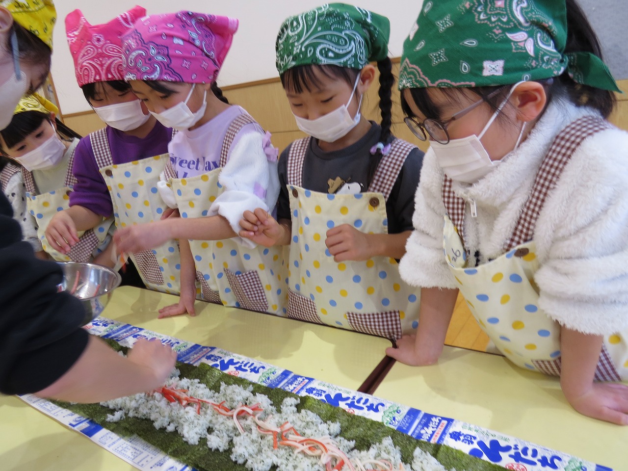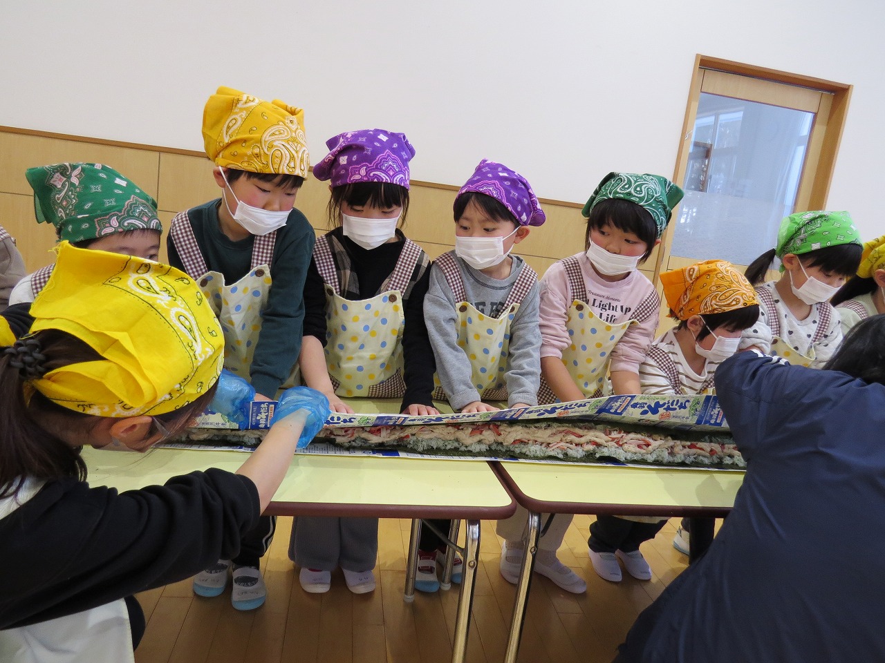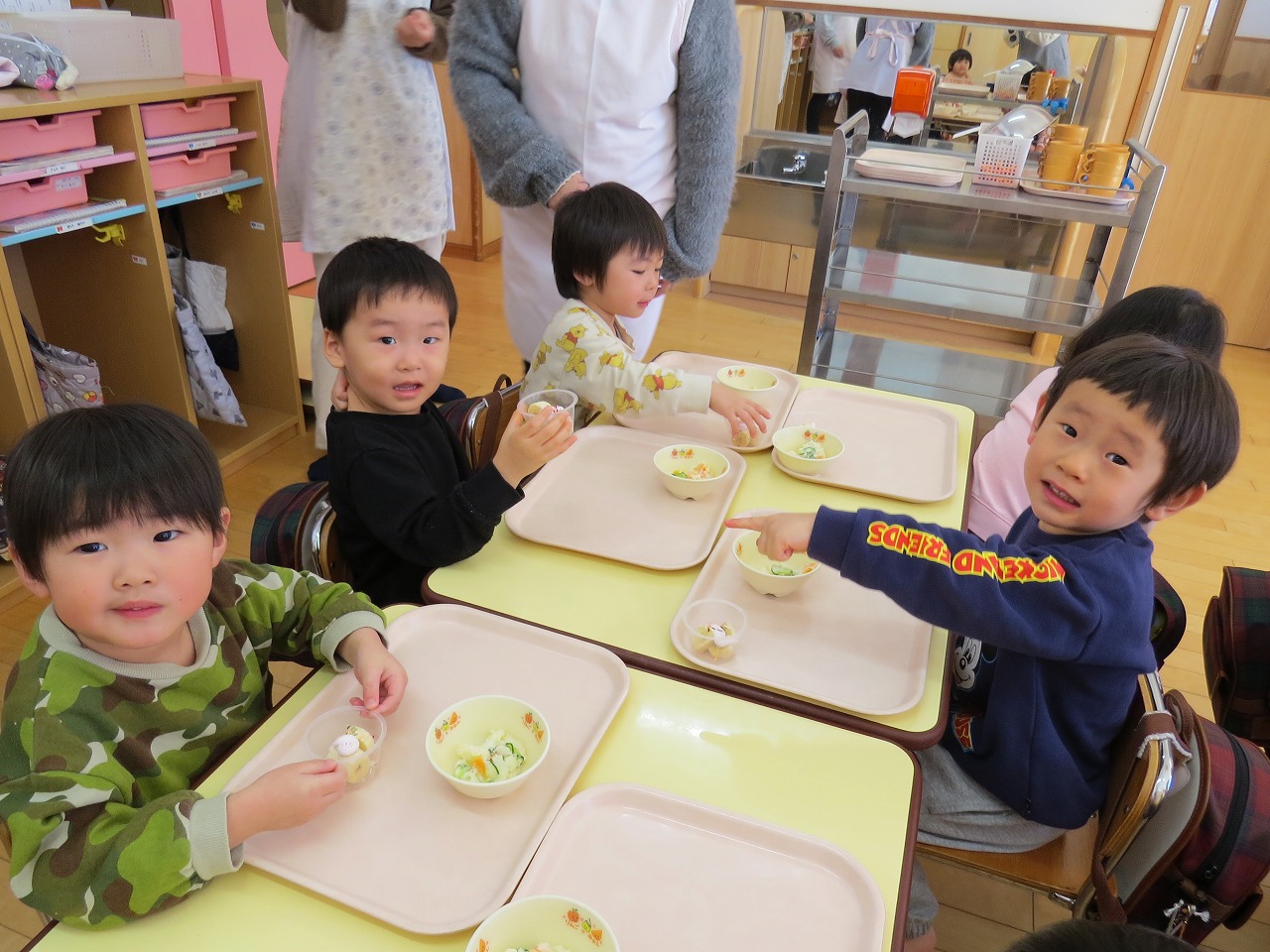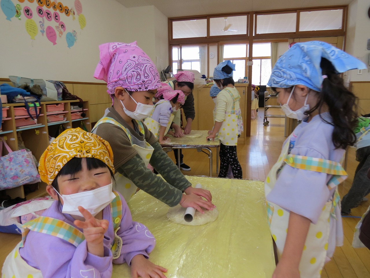 2月20日(金)はランチパーティーをしました!ふじ組はのり巻き、すみれ組は豚汁うどん、さくら組とぱんだ組はポテトサラダを作りみんなで食べることにしました。大きなのり巻きは息を合わせて巻くのことが難しかったようですが、みんなで協力して完成!うどんも一生懸命足でふみふみ、手でこねこねして伸ばし、こしのあるうどんになりました。ポテトサラダやデザートも愛情込めて美味しくでき、自分たちで作ったごはんに大満足の子どもたちでした。