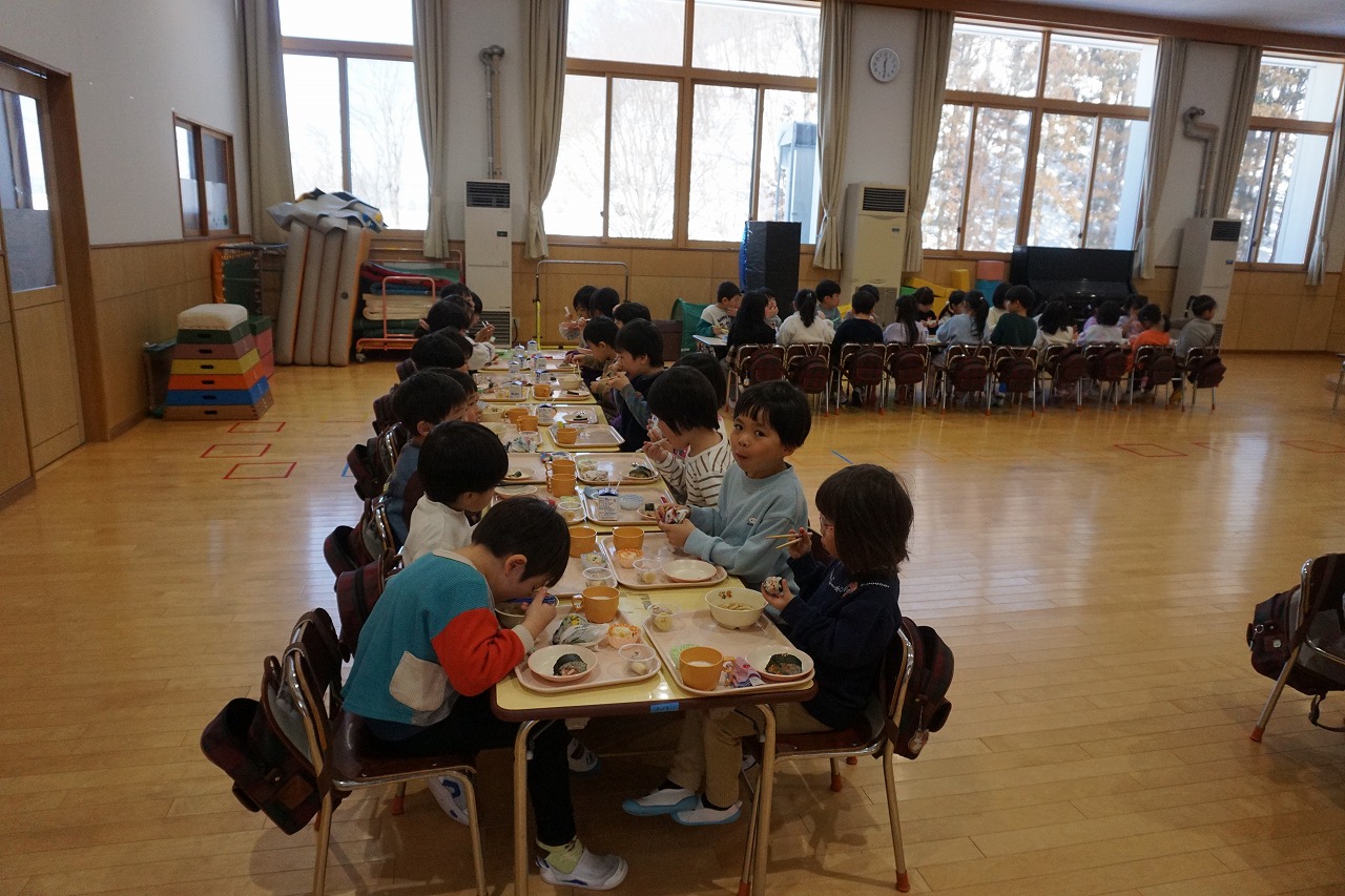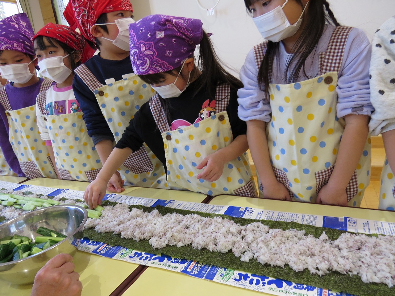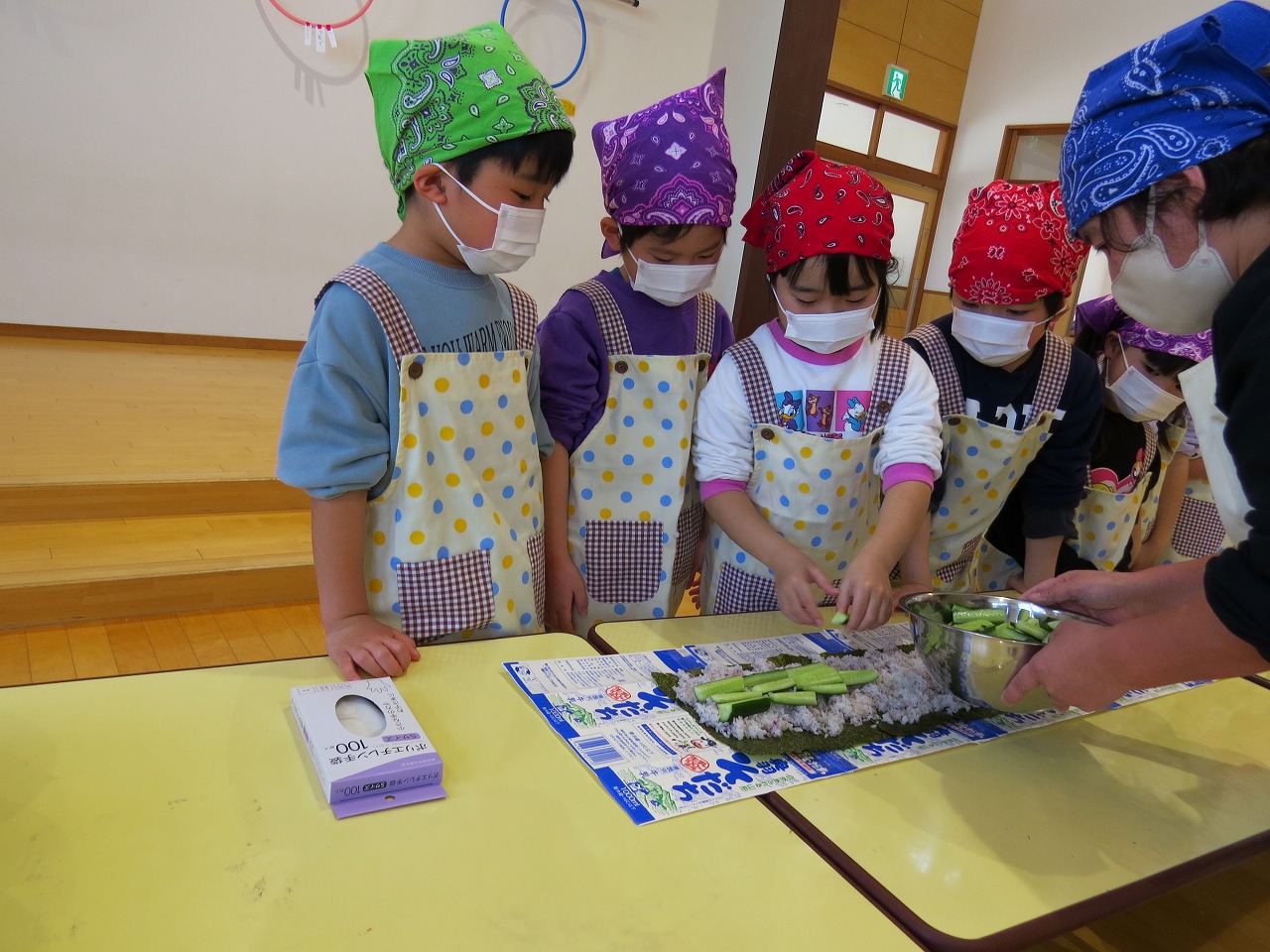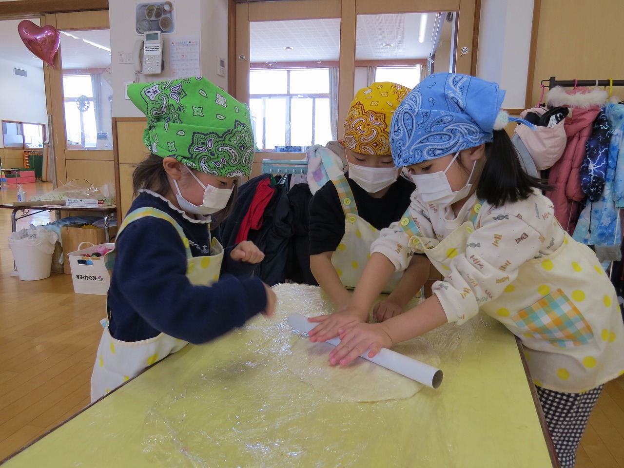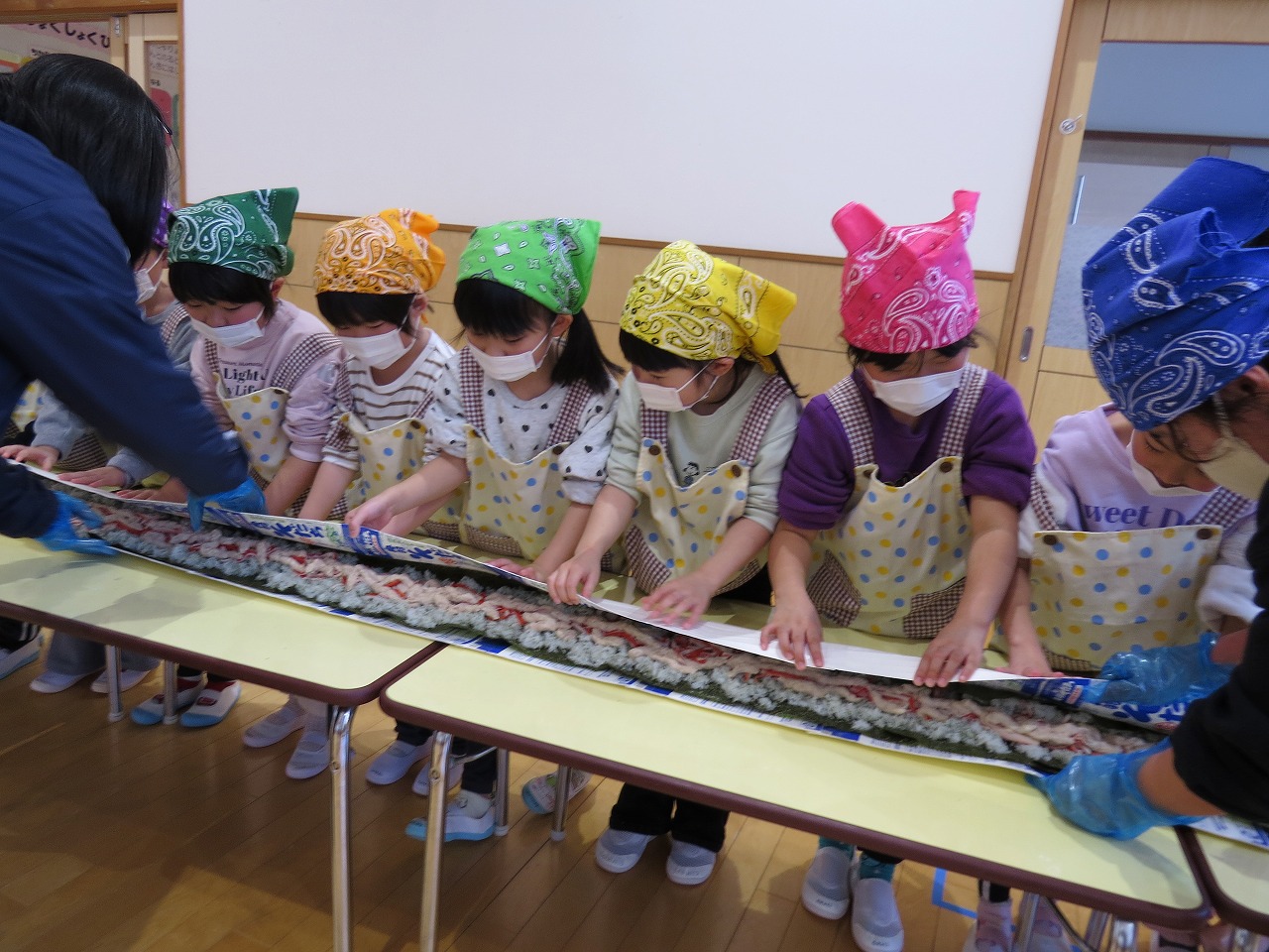 2月20日(金)はランチパーティーをしました!ふじ組はのり巻き、すみれ組は豚汁うどん、さくら組とぱんだ組はポテトサラダを作りみんなで食べることにしました。大きなのり巻きは息を合わせて巻くのことが難しかったようですが、みんなで協力して完成!うどんも一生懸命足でふみふみ、手でこねこねして伸ばし、こしのあるうどんになりました。ポテトサラダやデザートも愛情込めて美味しくでき、自分たちで作ったごはんに大満足の子どもたちでした。