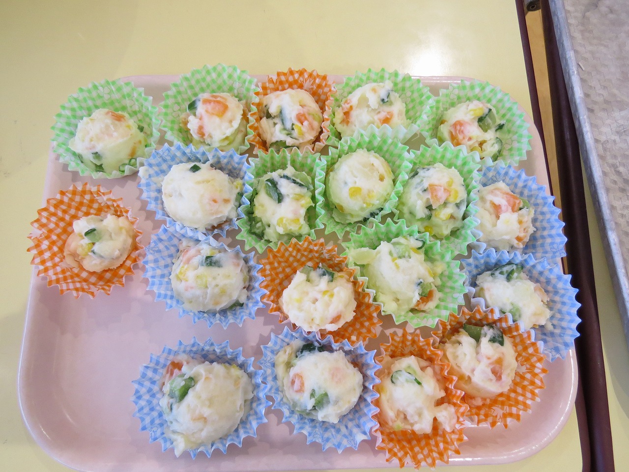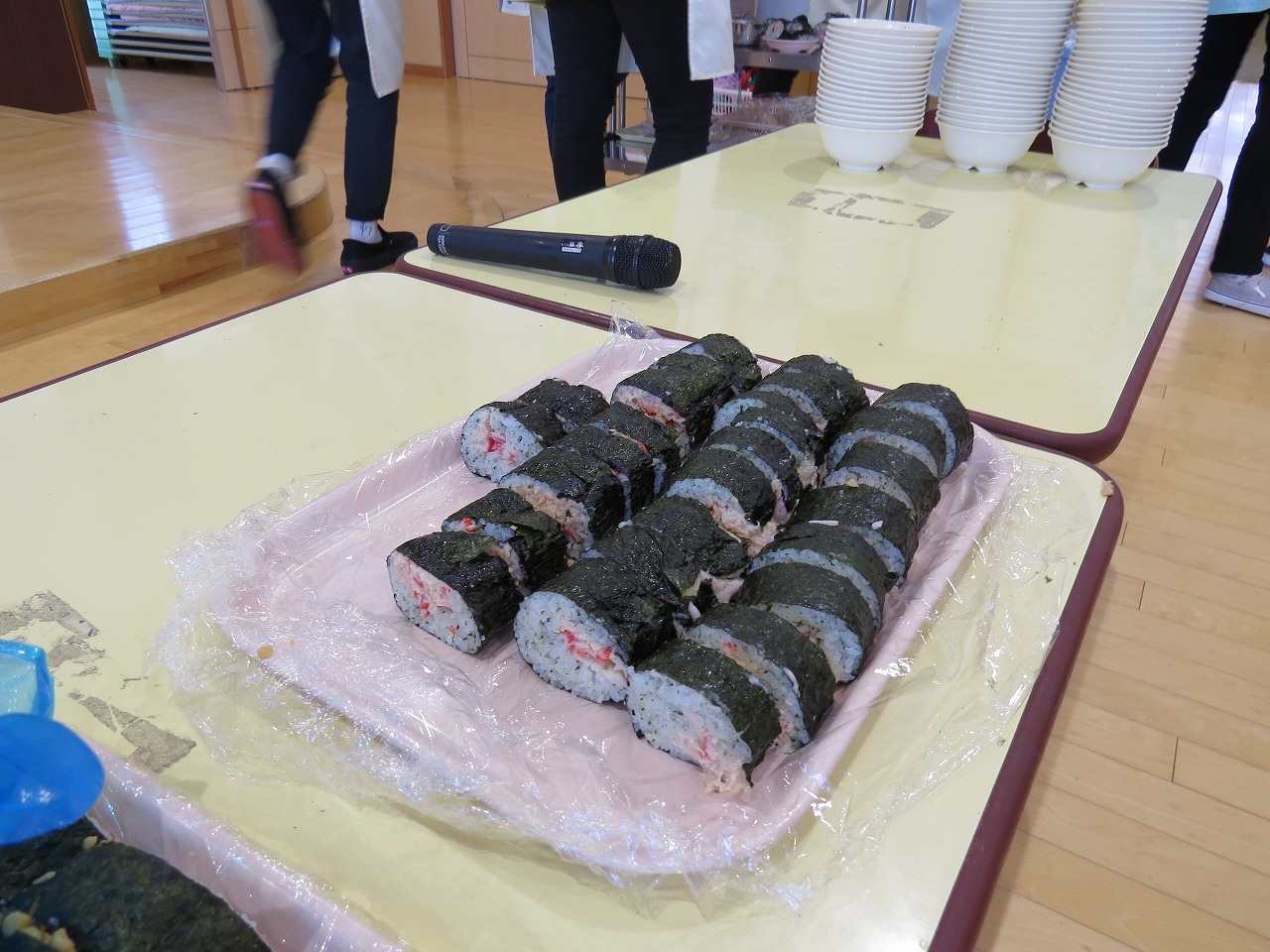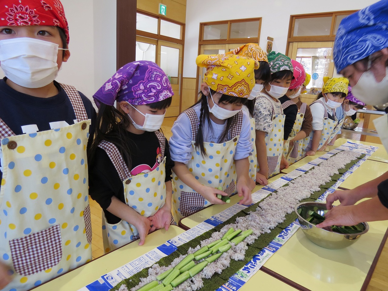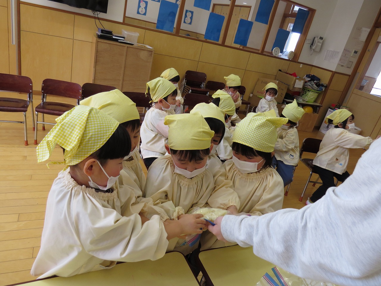 2月20日(金)はランチパーティーをしました!ふじ組はのり巻き、すみれ組は豚汁うどん、さくら組とぱんだ組はポテトサラダを作りみんなで食べることにしました。大きなのり巻きは息を合わせて巻くのことが難しかったようですが、みんなで協力して完成!うどんも一生懸命足でふみふみ、手でこねこねして伸ばし、こしのあるうどんになりました。ポテトサラダやデザートも愛情込めて美味しくでき、自分たちで作ったごはんに大満足の子どもたちでした。