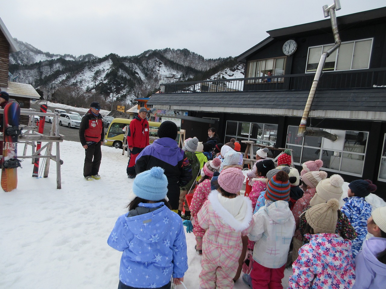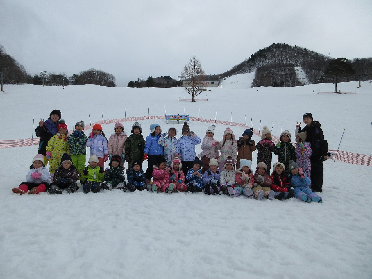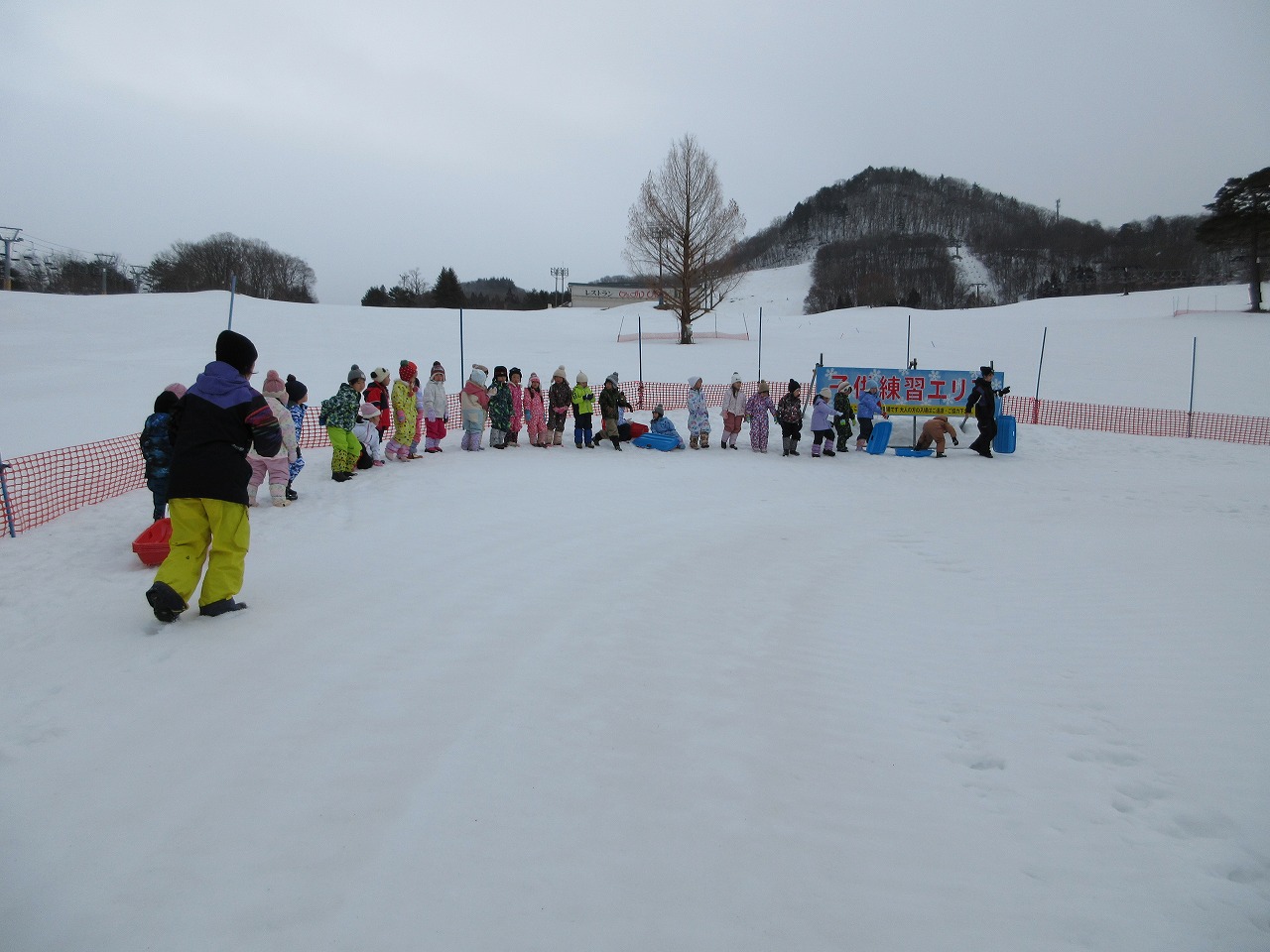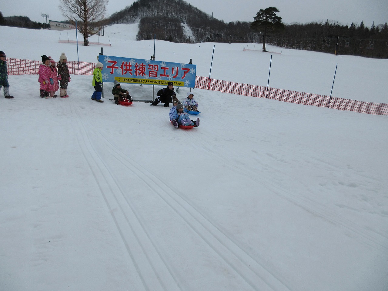 ふじ組さんで米沢スキー場に行き、そり滑りを楽しんできました。今年は雪解けが早く、スキー場のそり乗り場は雪がなくなってしまったので、特別にスキーの練習エリアをお借りして遊びました!初めてスキー場に来た子もいれば、お家の方と一緒に遊びにきたことがあると教えてくれた子もいました。お友だちと一緒に、何度も繰り返しそり滑りを楽しむことができ、残り少ない園生活での思い出がまた一つ増えました。