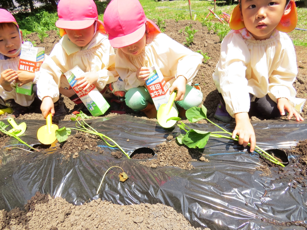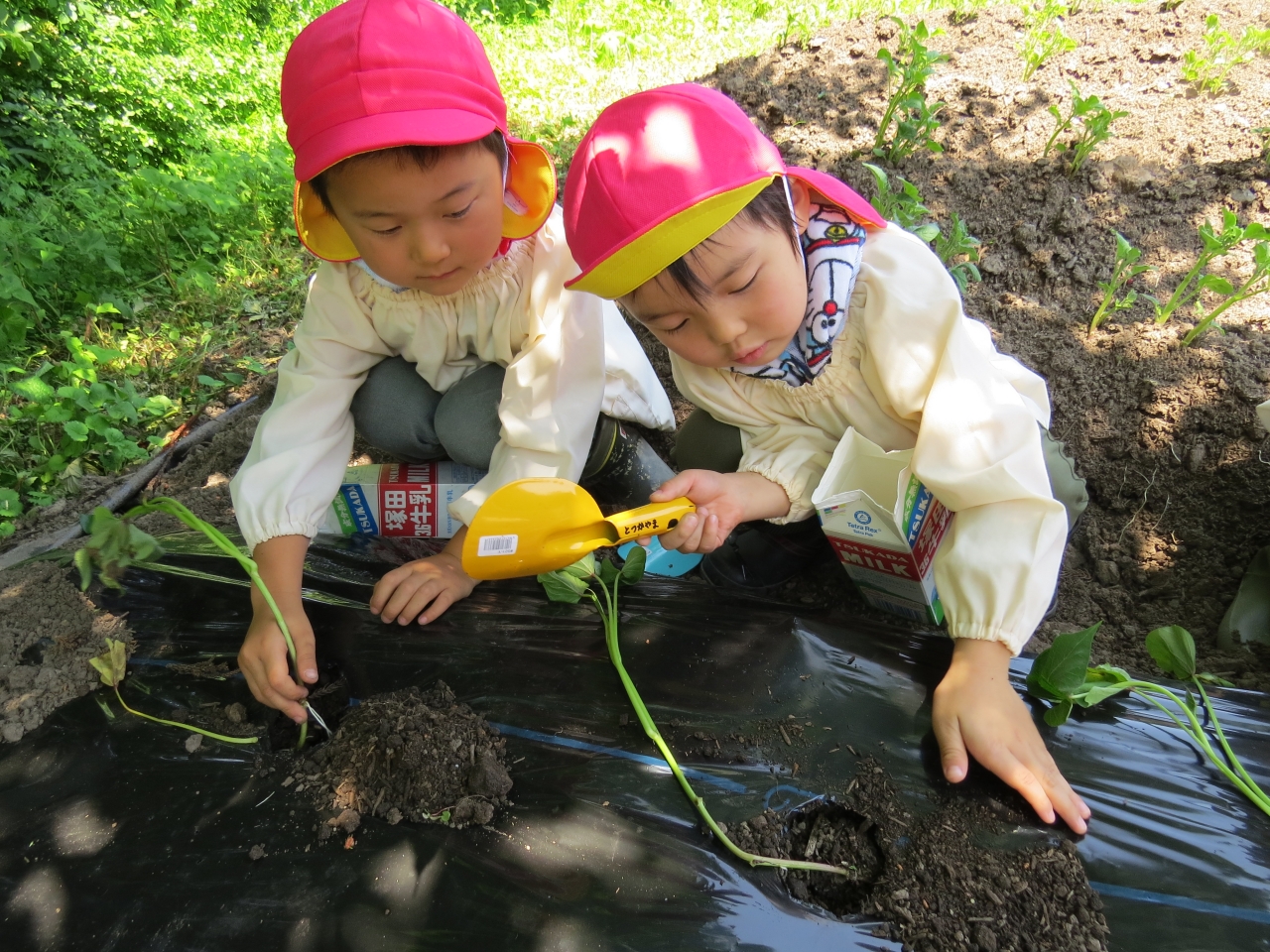 6月7日(木)、年長児ふじ組が園の畑にさつまいもの苗を植えました。
