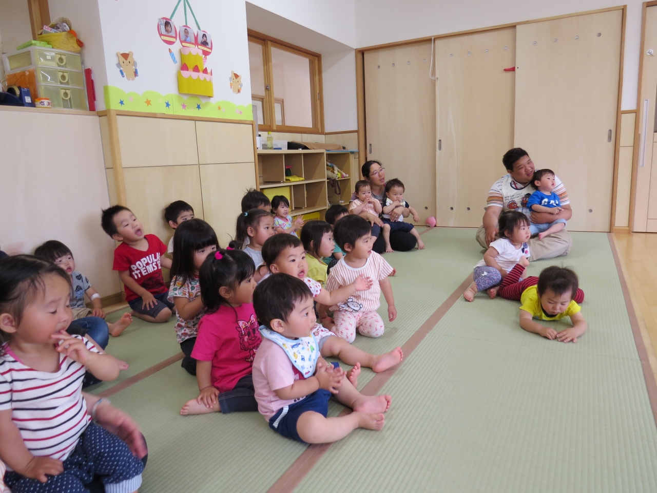 乳児組さん、幼児組さんに分かれてお祝いをします。今回は、乳児組さんの誕生会の様子です。