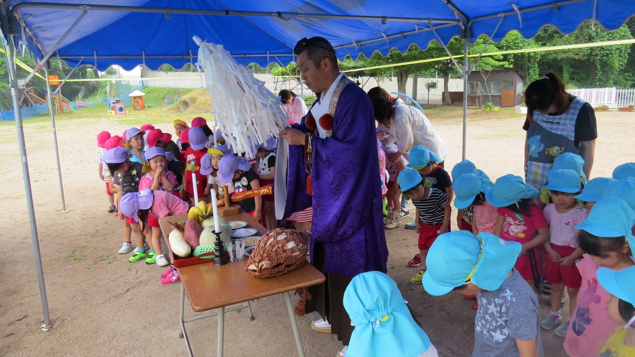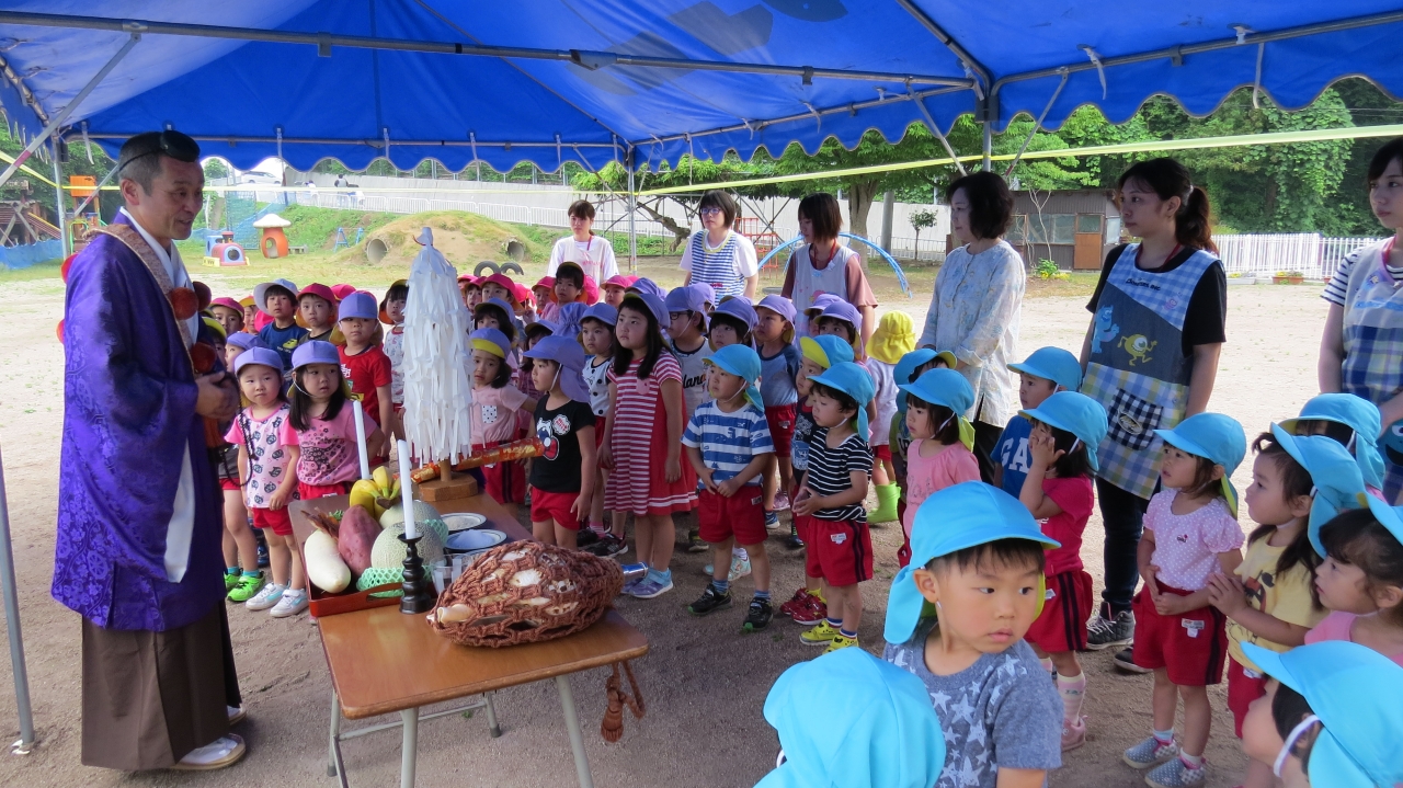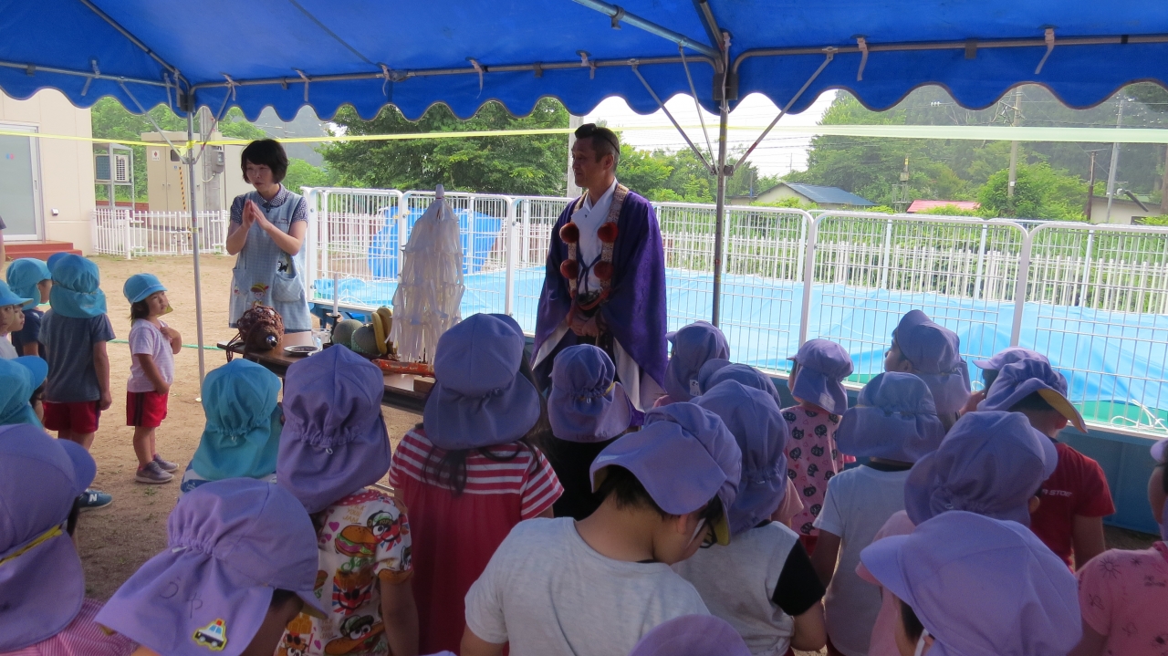 6月27日、全園児が参加し、大覚院の住職さんに水遊びの安全を祈ってご祈祷して頂きました。