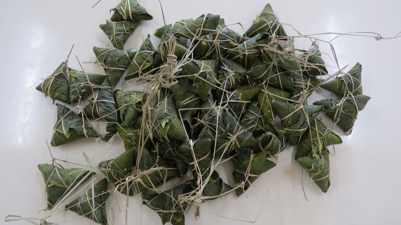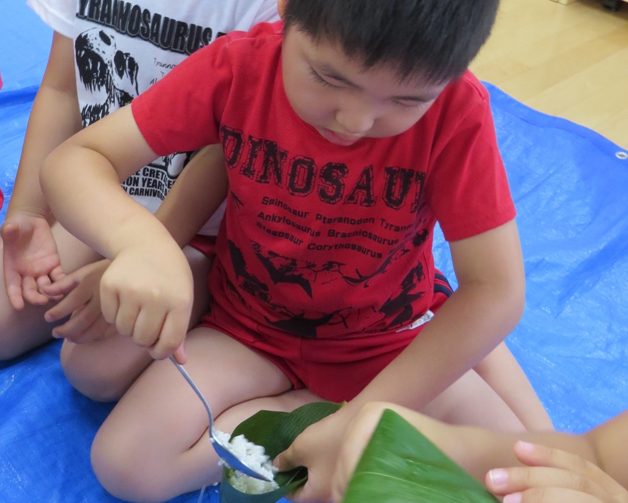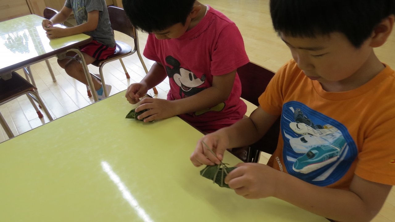 みんなで採った笹を使い、手先を使って笹を巻き、もち米を入れました。難しいと言いながらも、みんな頑張っていました。