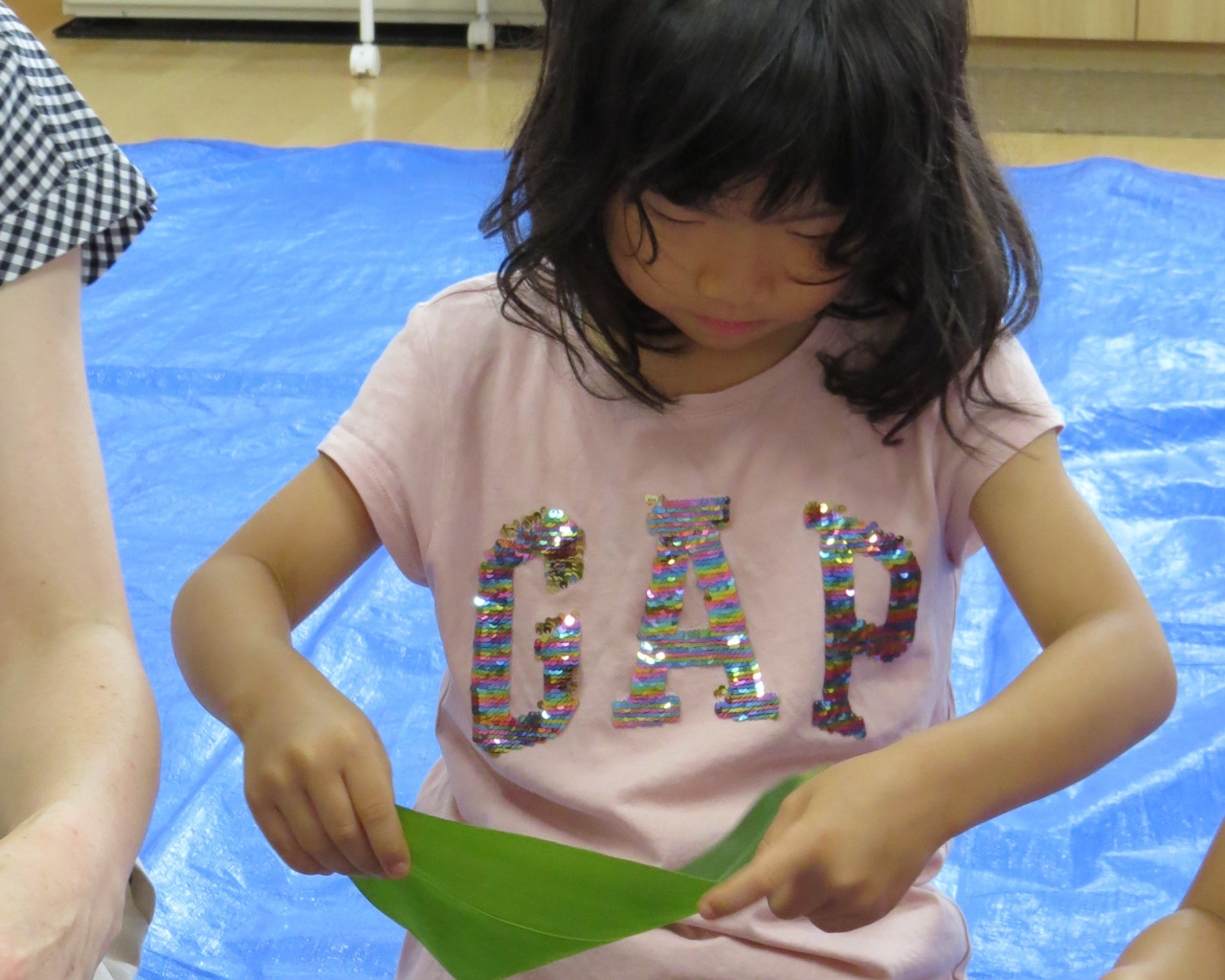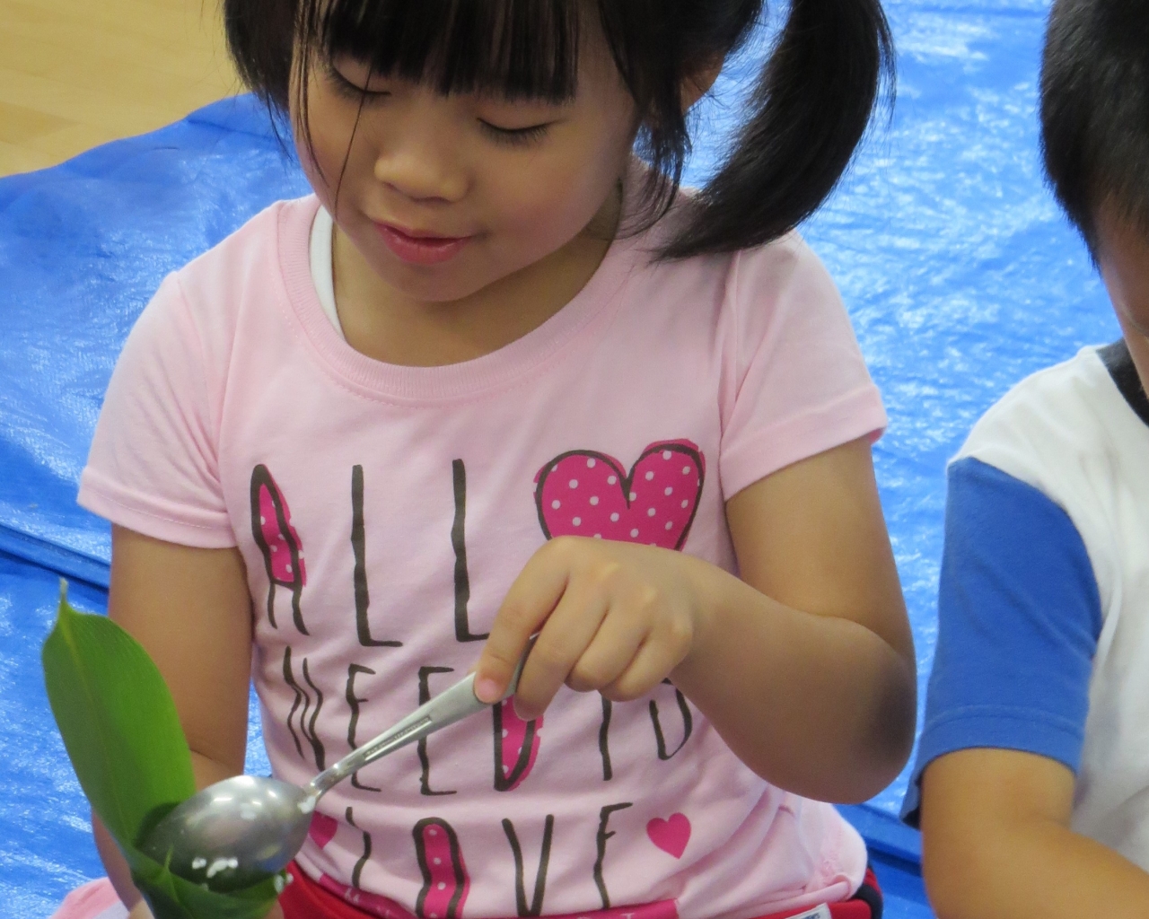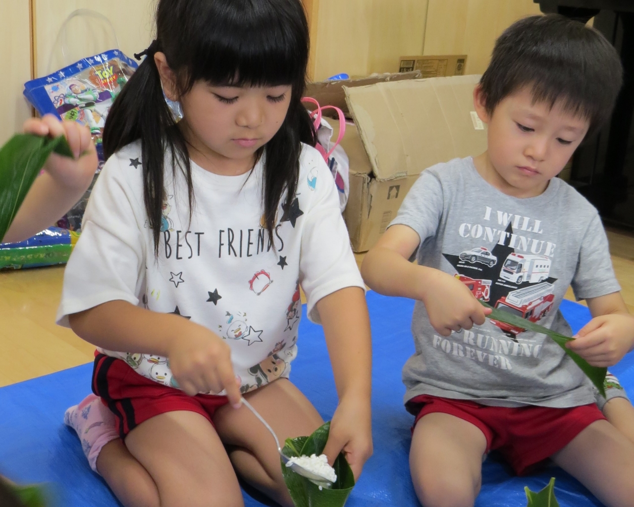 みんなで採った笹を使い、手先を使って笹を巻き、もち米を入れました。難しいと言いながらも、みんな頑張っていました。