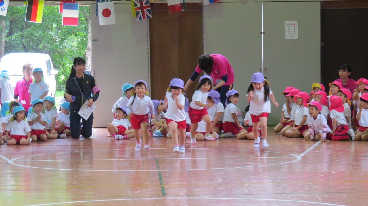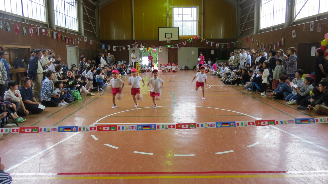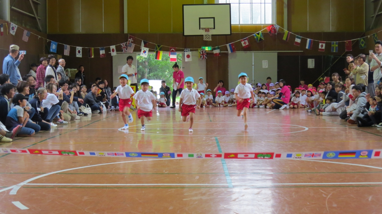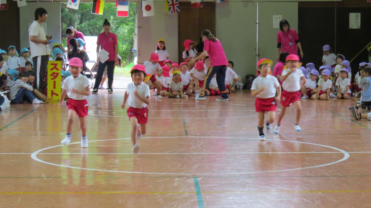 残念ながら雨が降り、室内での運動会となりました。幼児組の開会式・かけっこの様子です。