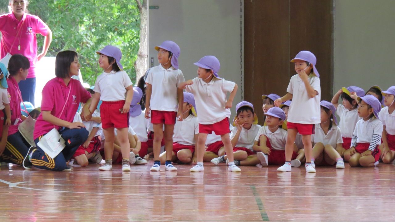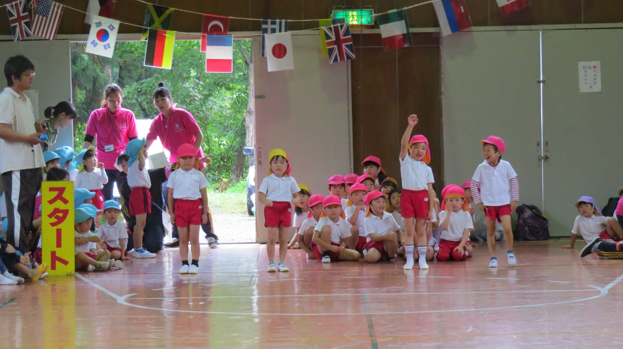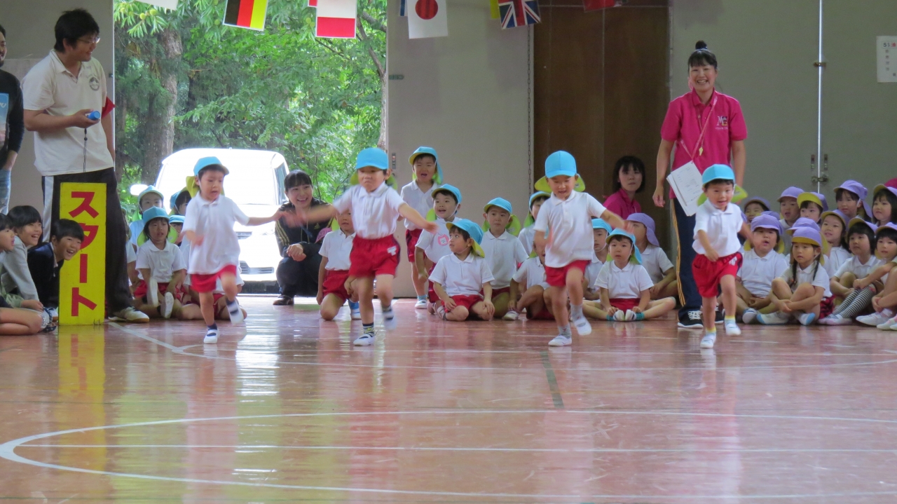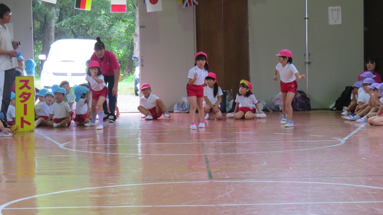 残念ながら雨が降り、室内での運動会となりました。幼児組の開会式・かけっこの様子です。