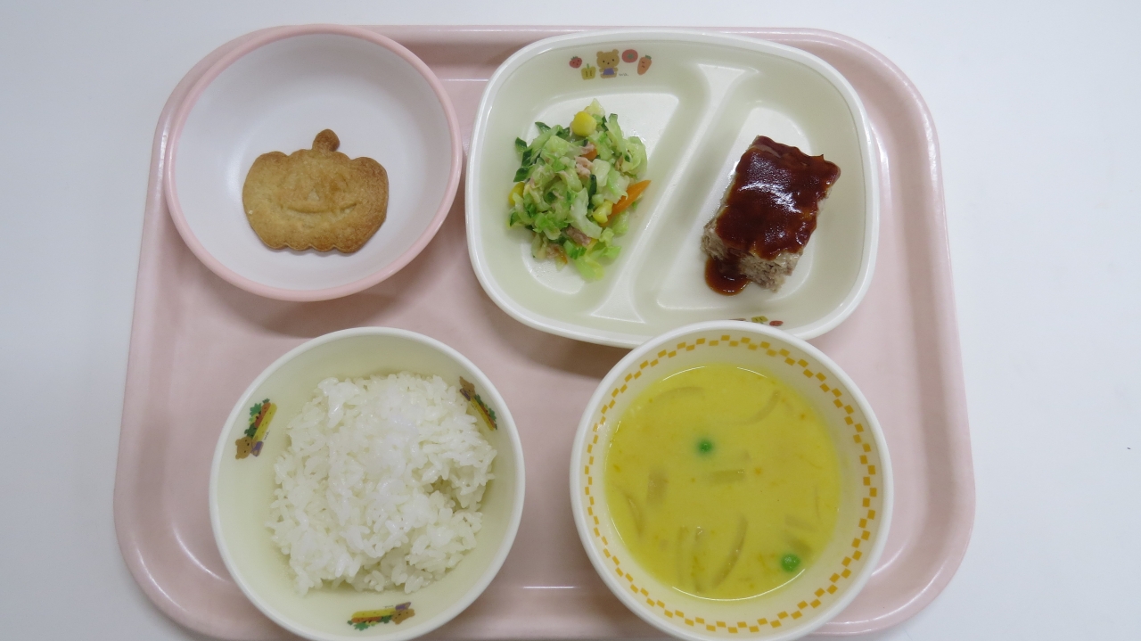ごはん・きのこハンバーグ・ツナサラダ・かぼちゃシチュー・ハロウィンクッキーでした。