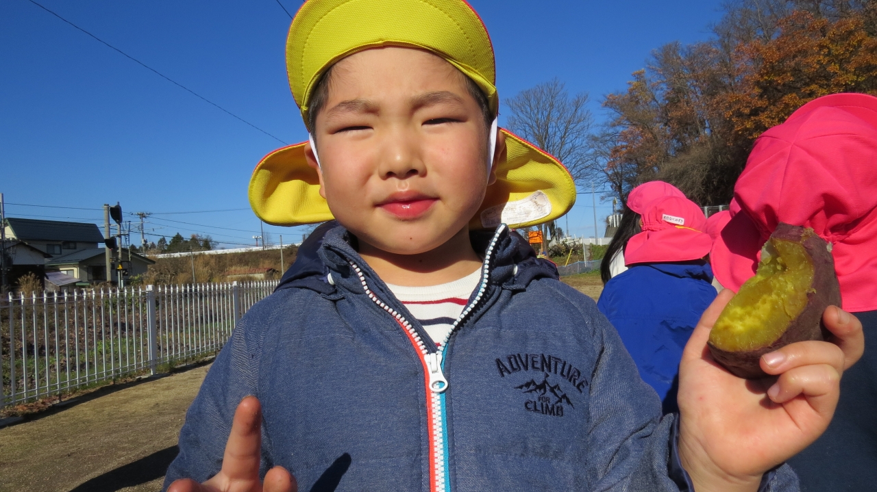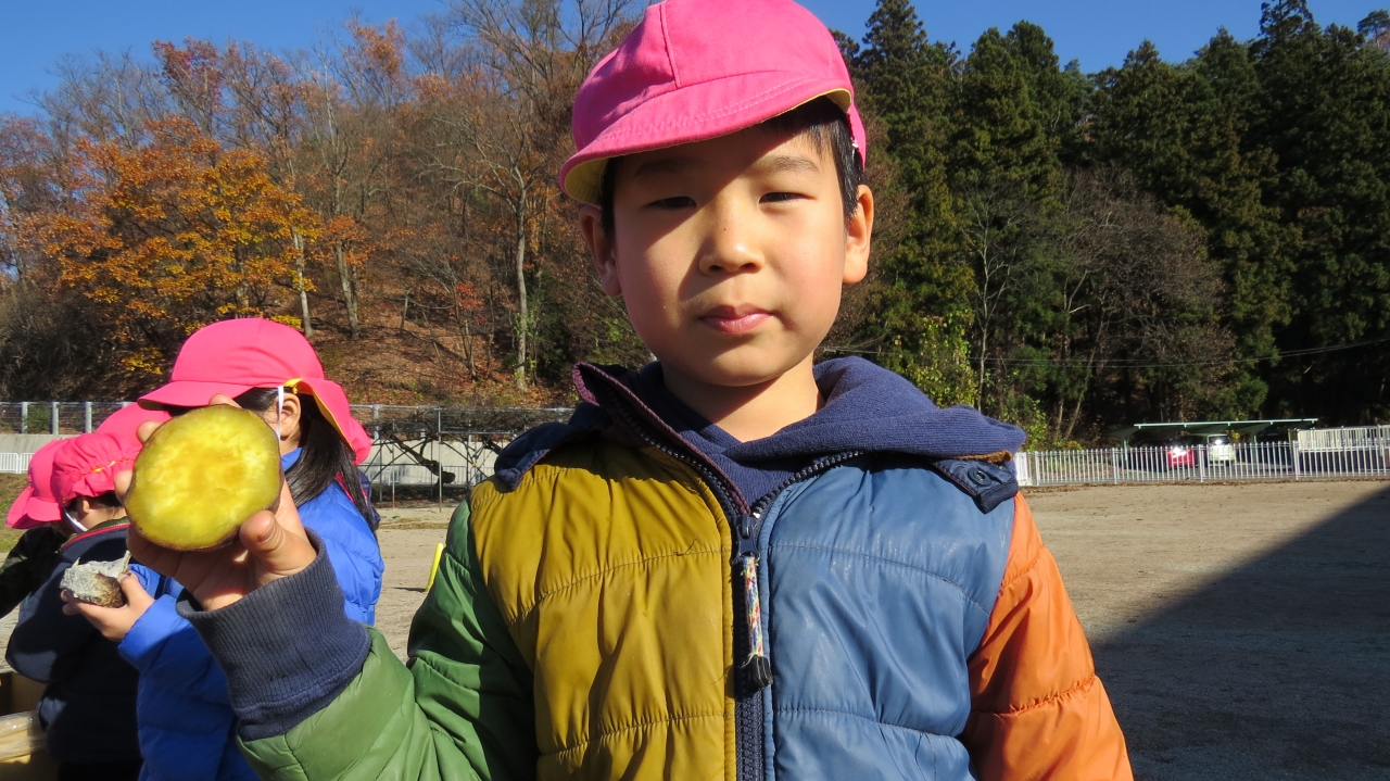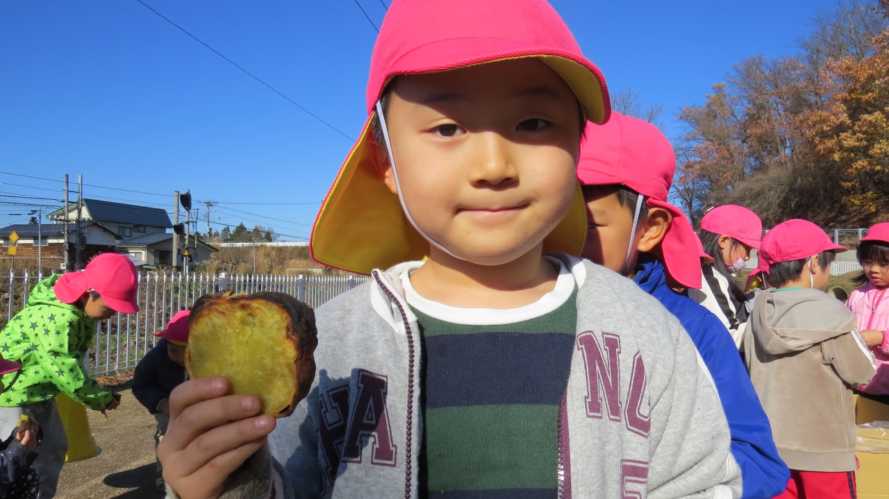 11月26日は、そのおいもを使って焼き芋パーティをしました。落ち葉や杉の葉は自分達で集めました。当日は天候にも恵まれ、焼きあがったホクホクのおいもを外で美味しくいただきました。