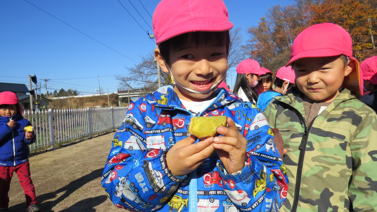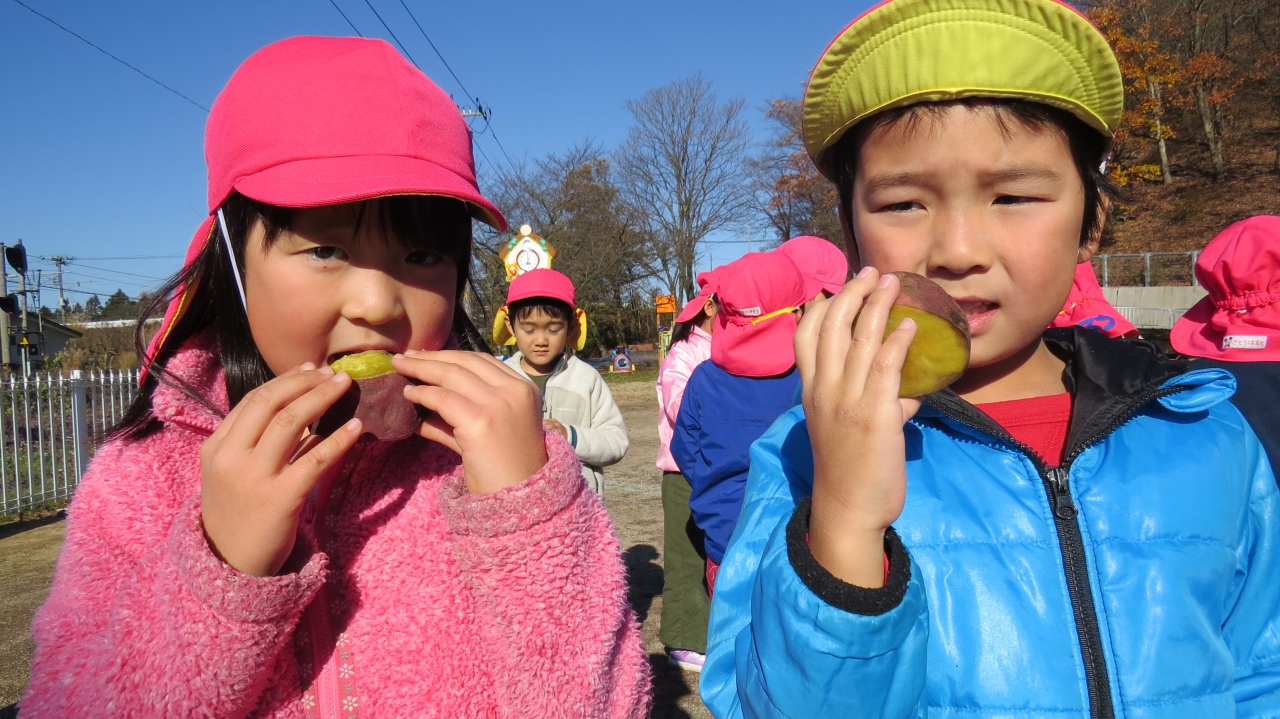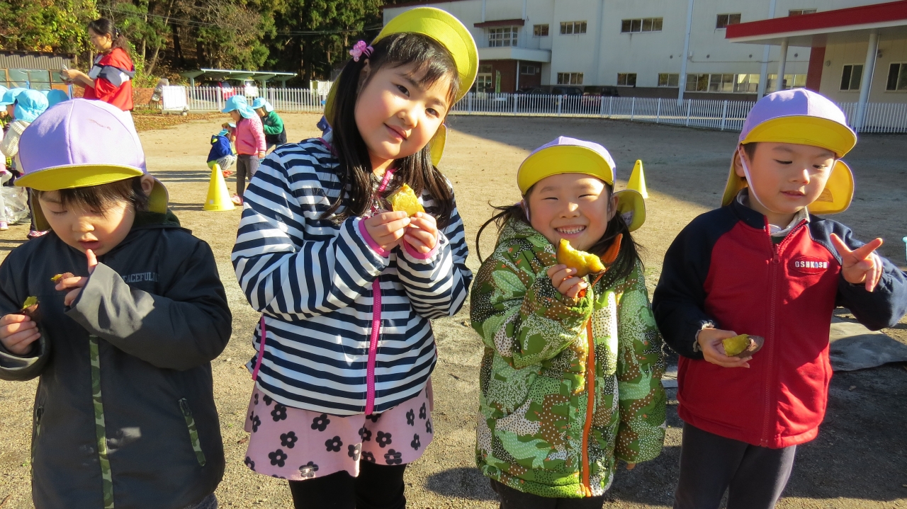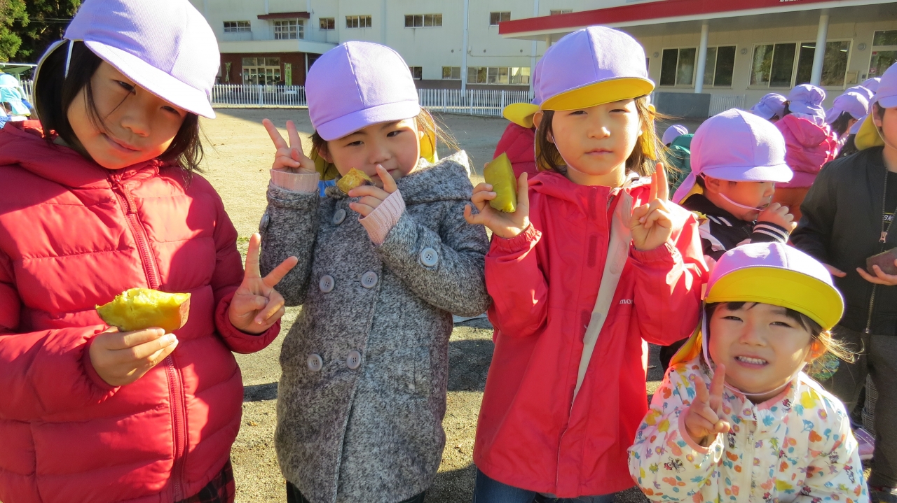11月26日は、そのおいもを使って焼き芋パーティをしました。落ち葉や杉の葉は自分達で集めました。当日は天候にも恵まれ、焼きあがったホクホクのおいもを外で美味しくいただきました。