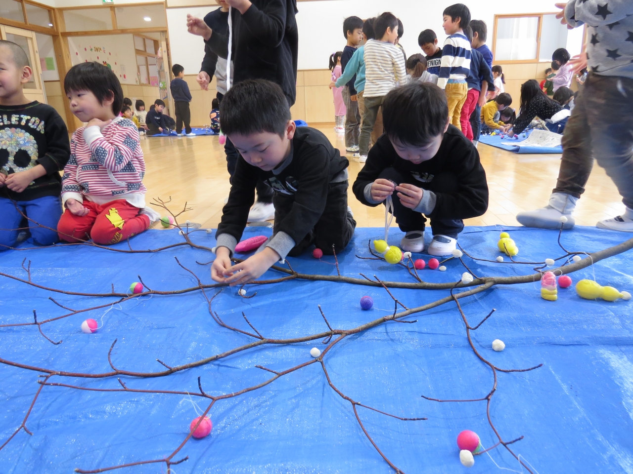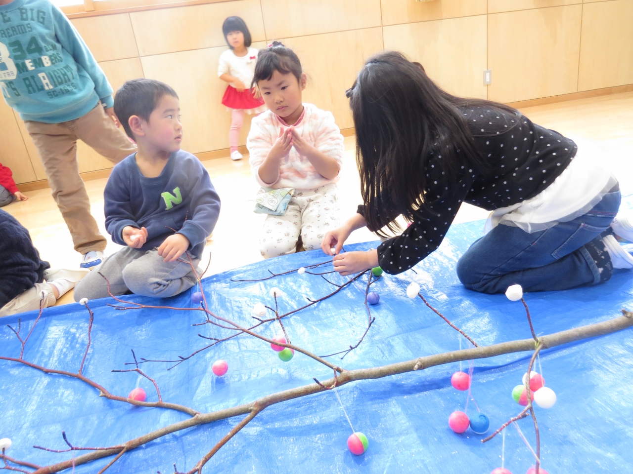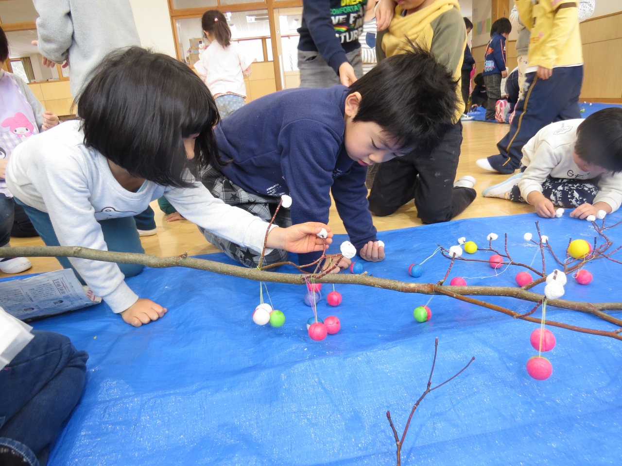 「お団子食べたいね~」と話しながら行う姿もみられ、出来上がっただんごの木を見て子ども達も嬉しそうでした。