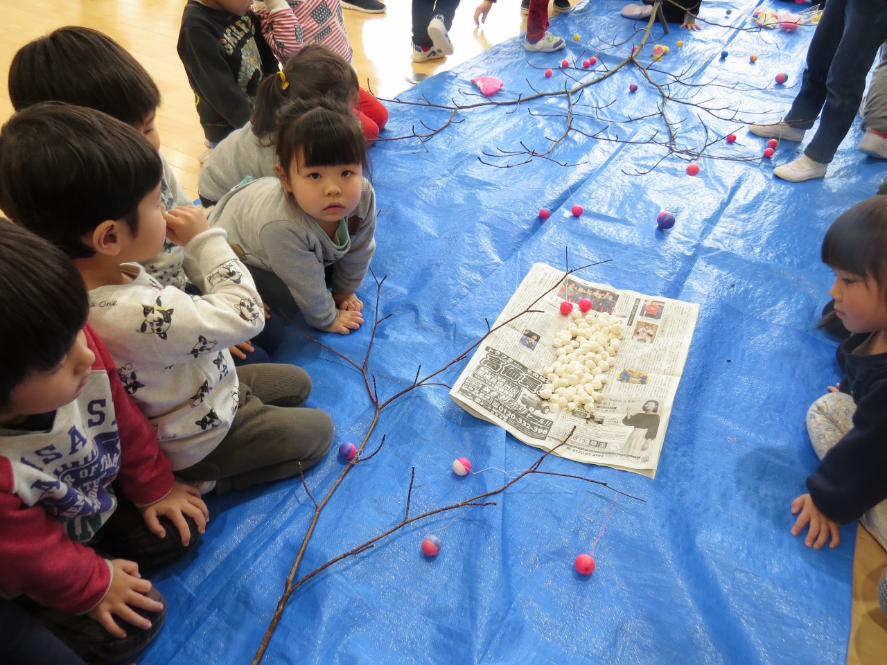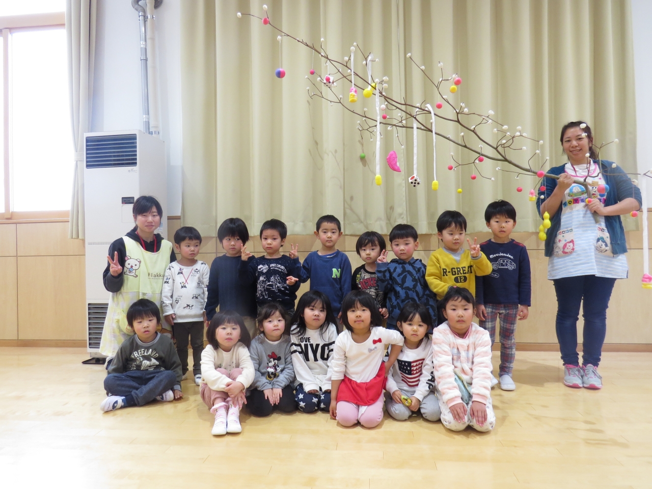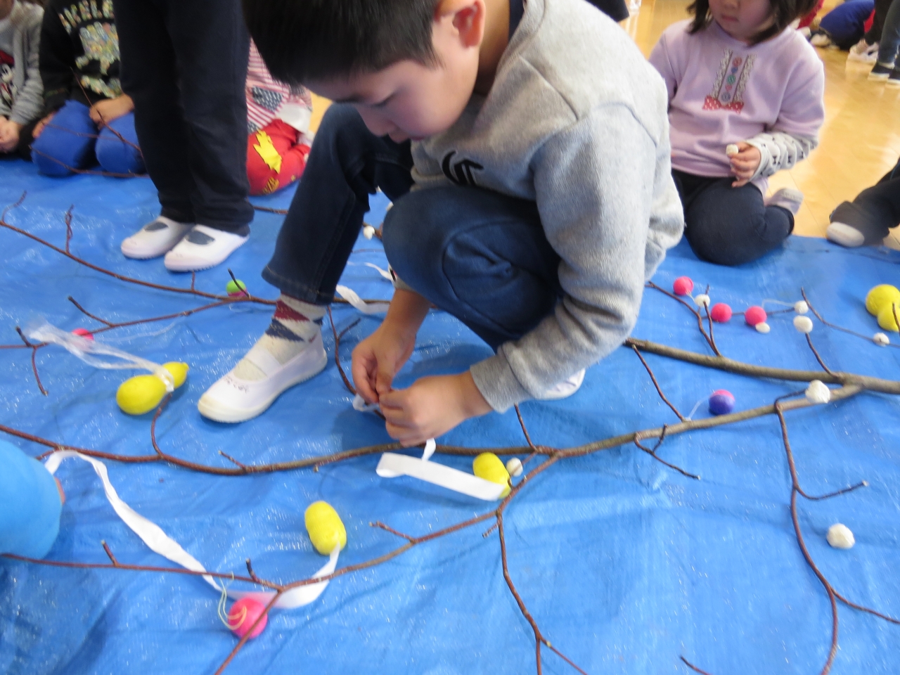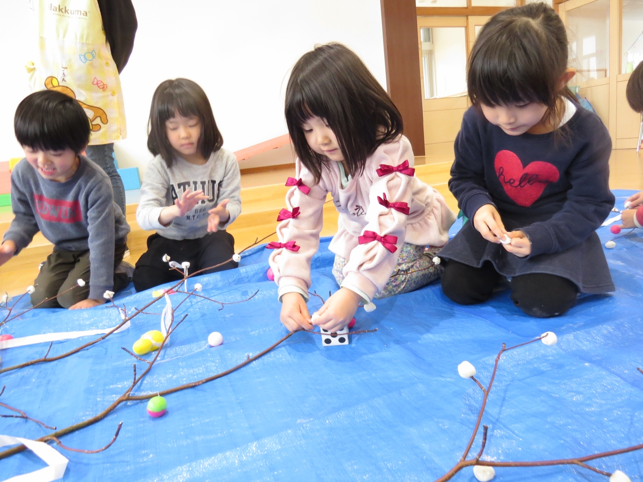「お団子食べたいね~」と話しながら行う姿もみられ、出来上がっただんごの木を見て子ども達も嬉しそうでした。