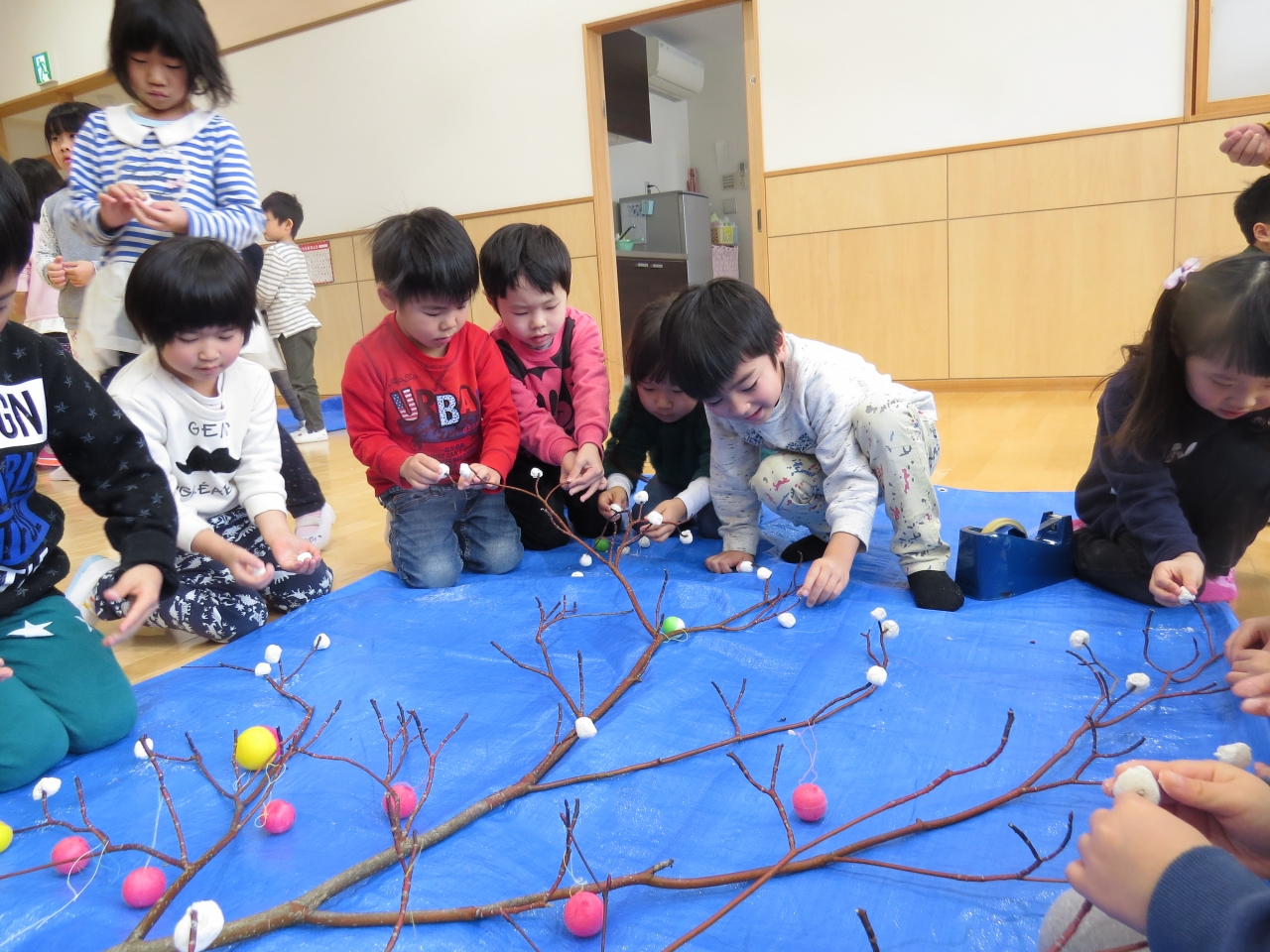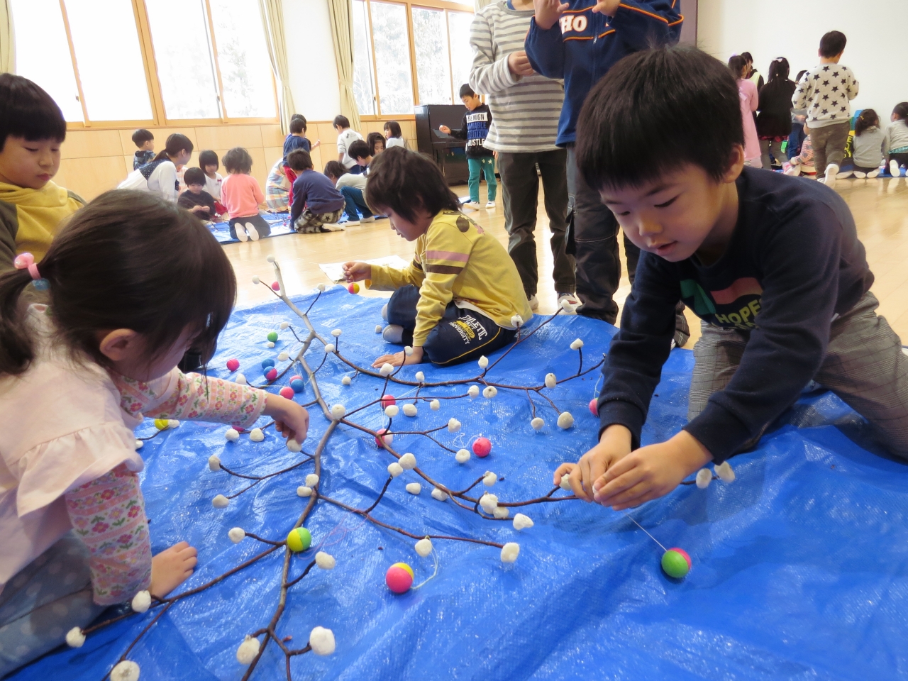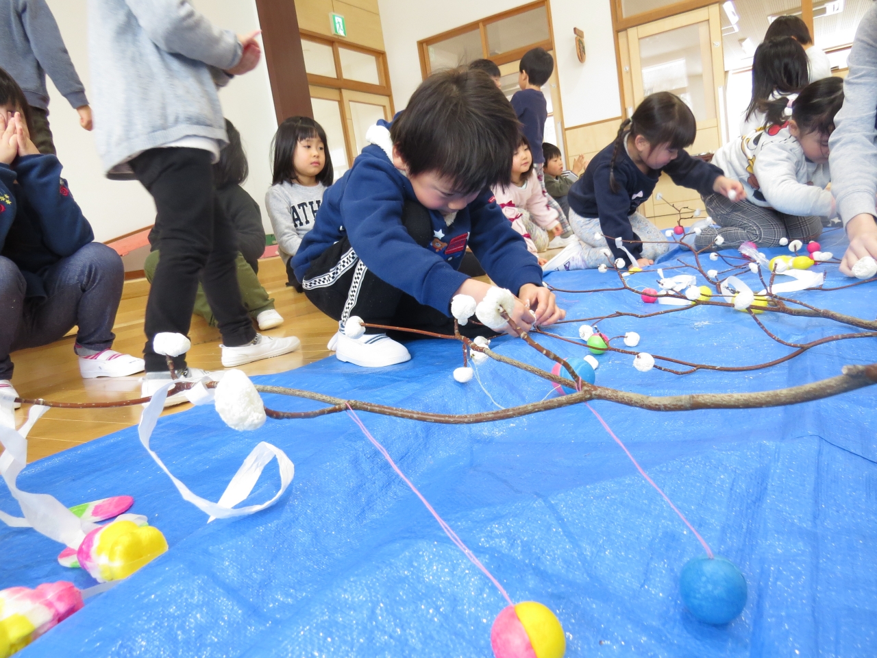 昨日は小正月。昔からある伝統的な行事を子ども達に経験して欲しいという願いから、毎年だんごの木飾りを行っています。