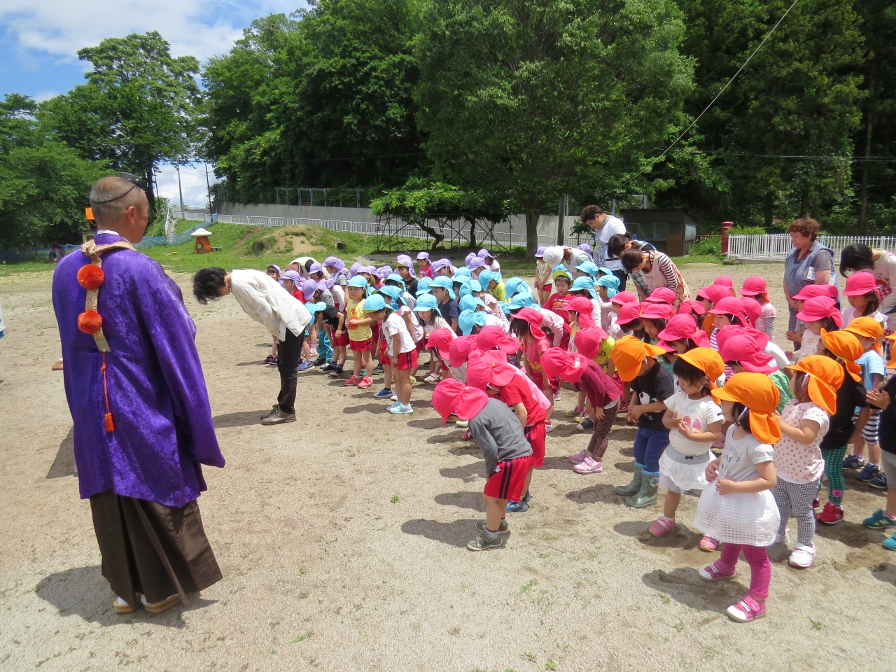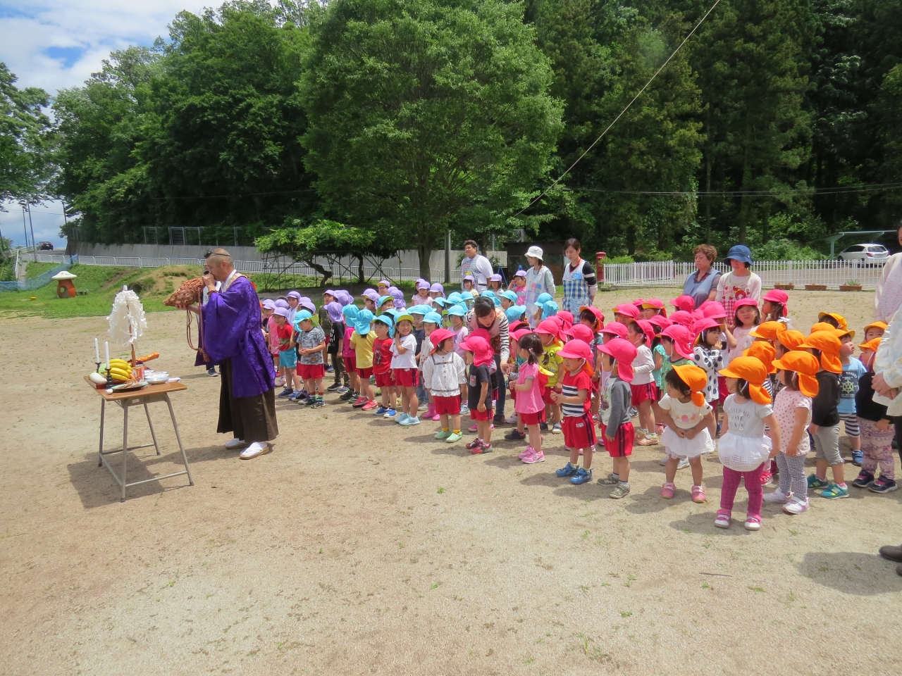 17日(月)には、お天気にも恵まれ2歳~5歳までの子ども達が参加をし、大覚院の住職さんに安全祈願祭をしていただきました。
