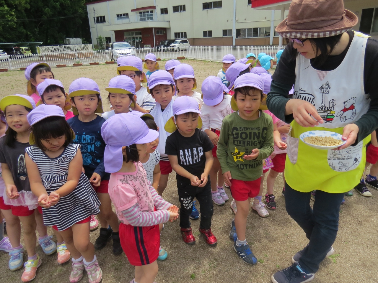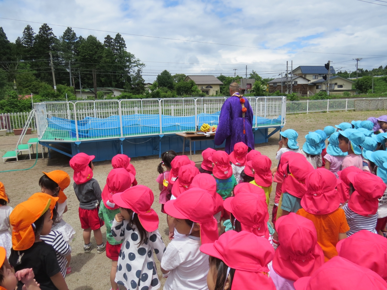 最後にふじ組さん(年長児)が園の代表として、プールの周りに、お米や豆などをまいてくれ安全を祈願しました。