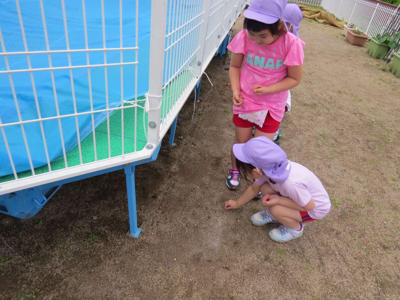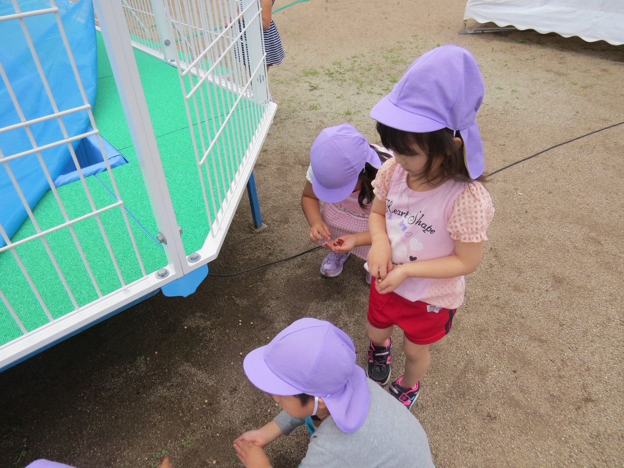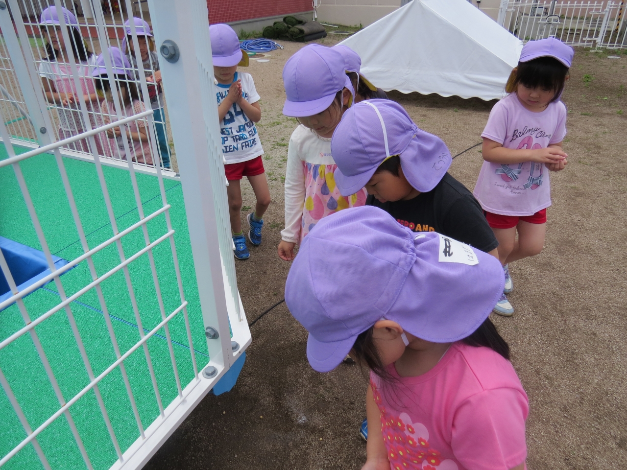 6月14日、役員のお父さん方に園庭にプールを設営していただきました。
