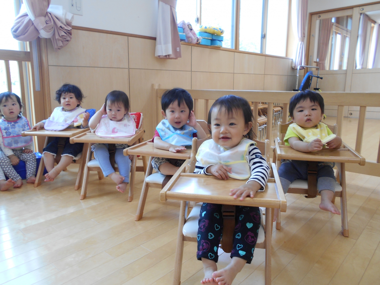りす組(1歳児)も園生活に慣れ、朝のお集まりの時には、上手に座って待っていられるようになりました。