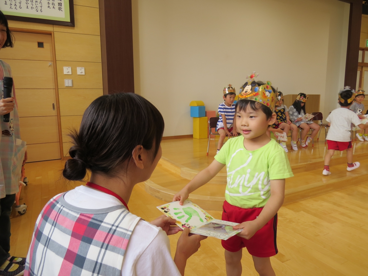 いつもは、乳児組と幼児組に分かれ、それぞれお誕生会をしていましたが、今回は幼児組の誕生会にはめてもらいました。