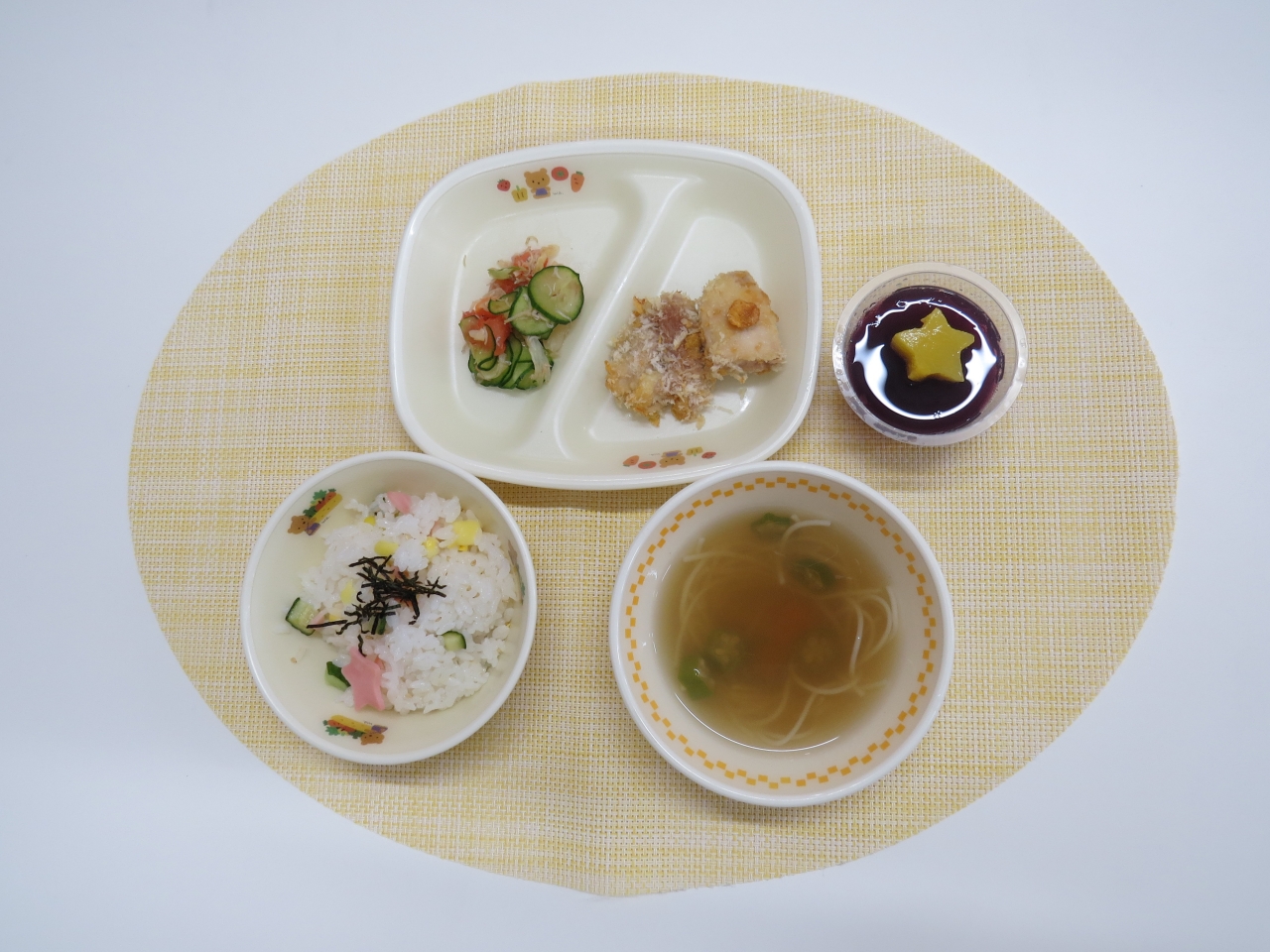 そして、この日の給食はお誕生会メニュー。メニューは洋風ちらし寿司・コーンフレーク焼き・トマトとじゃこのサラダ・天の川のすまし汁・星空ゼリーでした。美味しかったね!