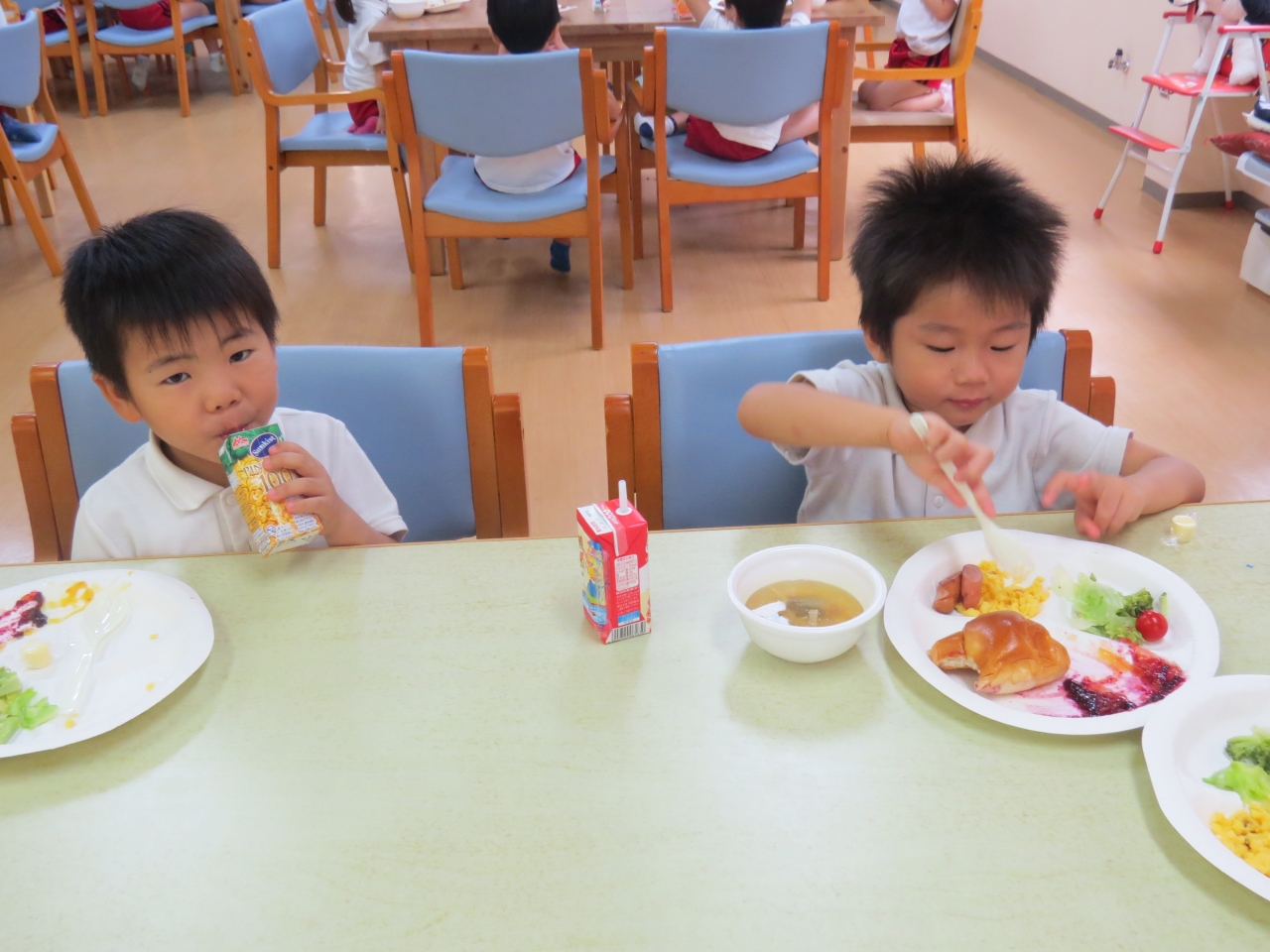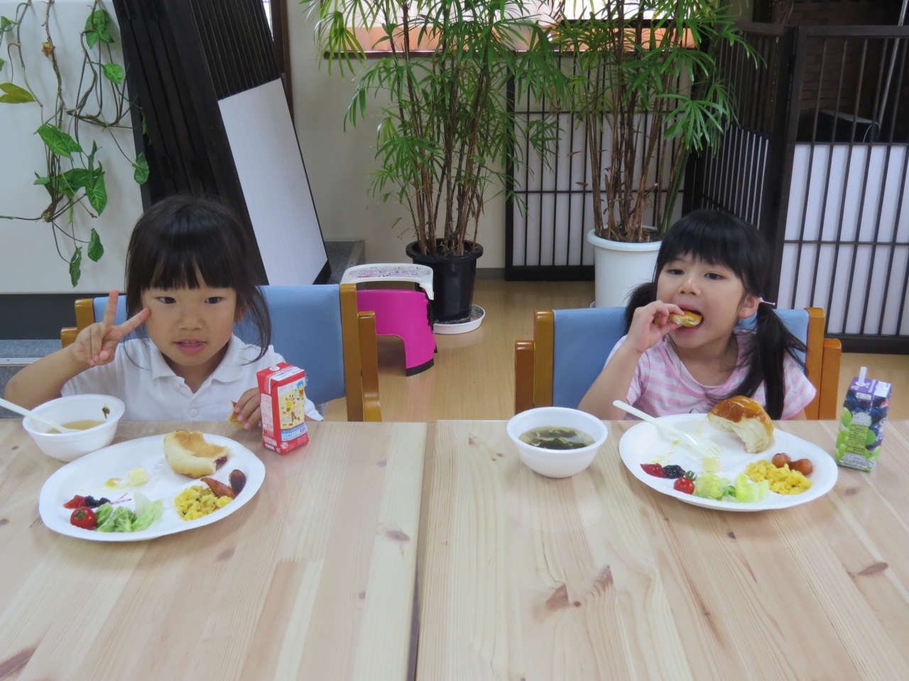 とっても美味しい朝ごはんを先生達が作ってくれました。朝ごはんを食べて元気いっぱい!後片付けや掃除、荷物整理をしてお世話になったやまぼうしをあとにしました。