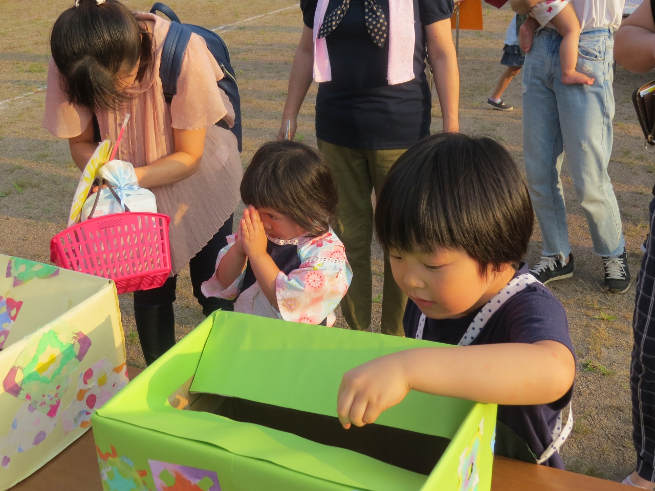 園庭には出店がたくさん並んでいたり、みんなで作ったおみこしやお宮もあり、いつもと違う雰囲気に子ども達もドキドキワクワクしていましたね。