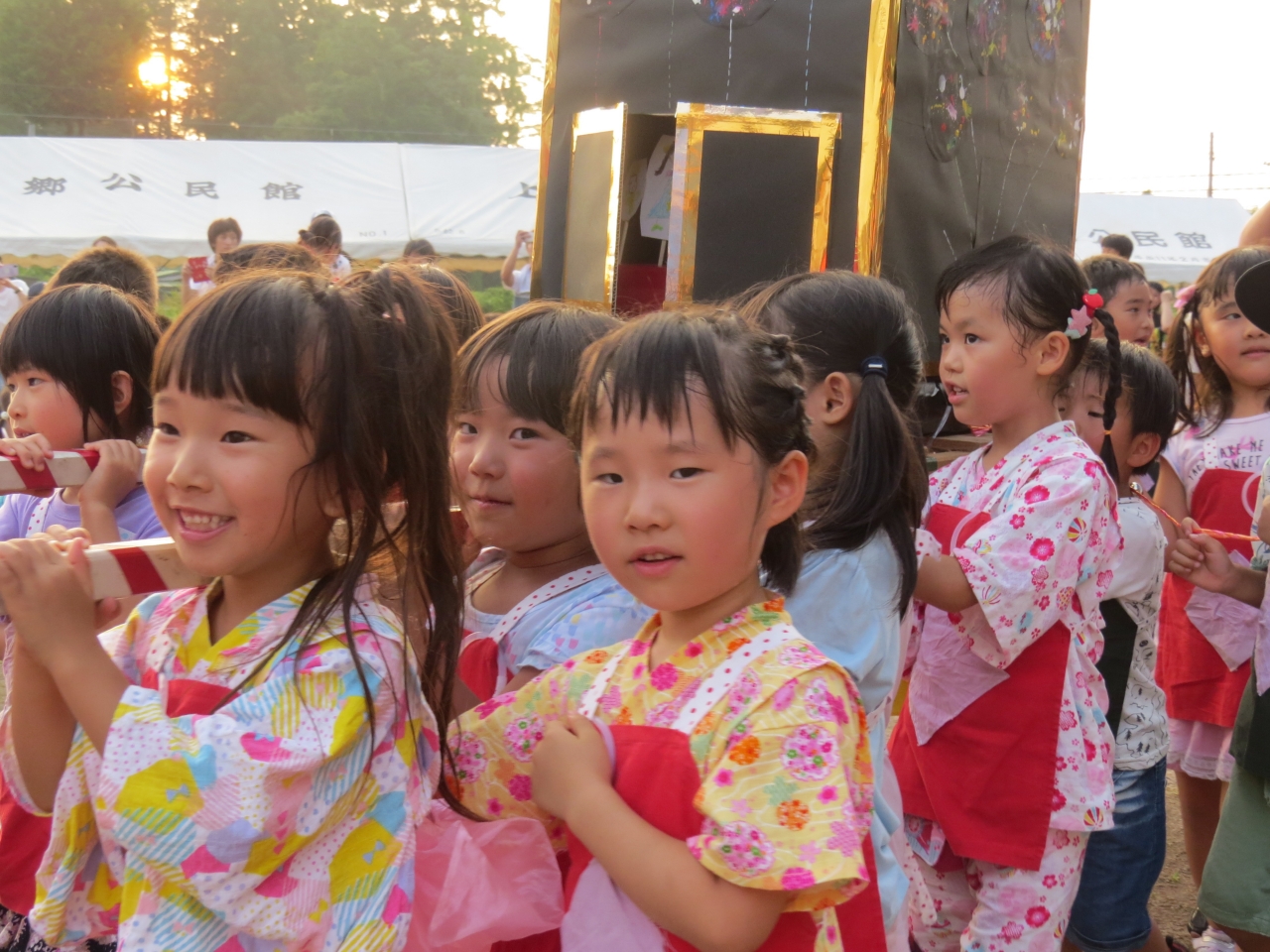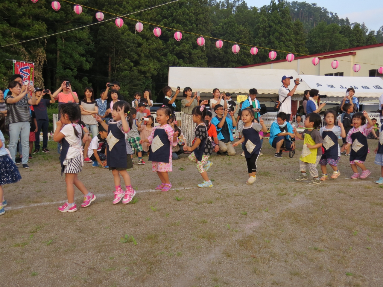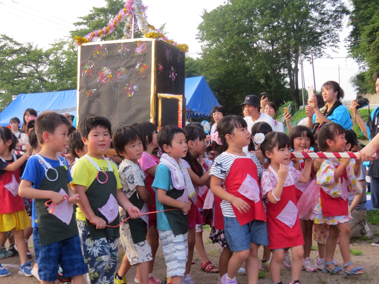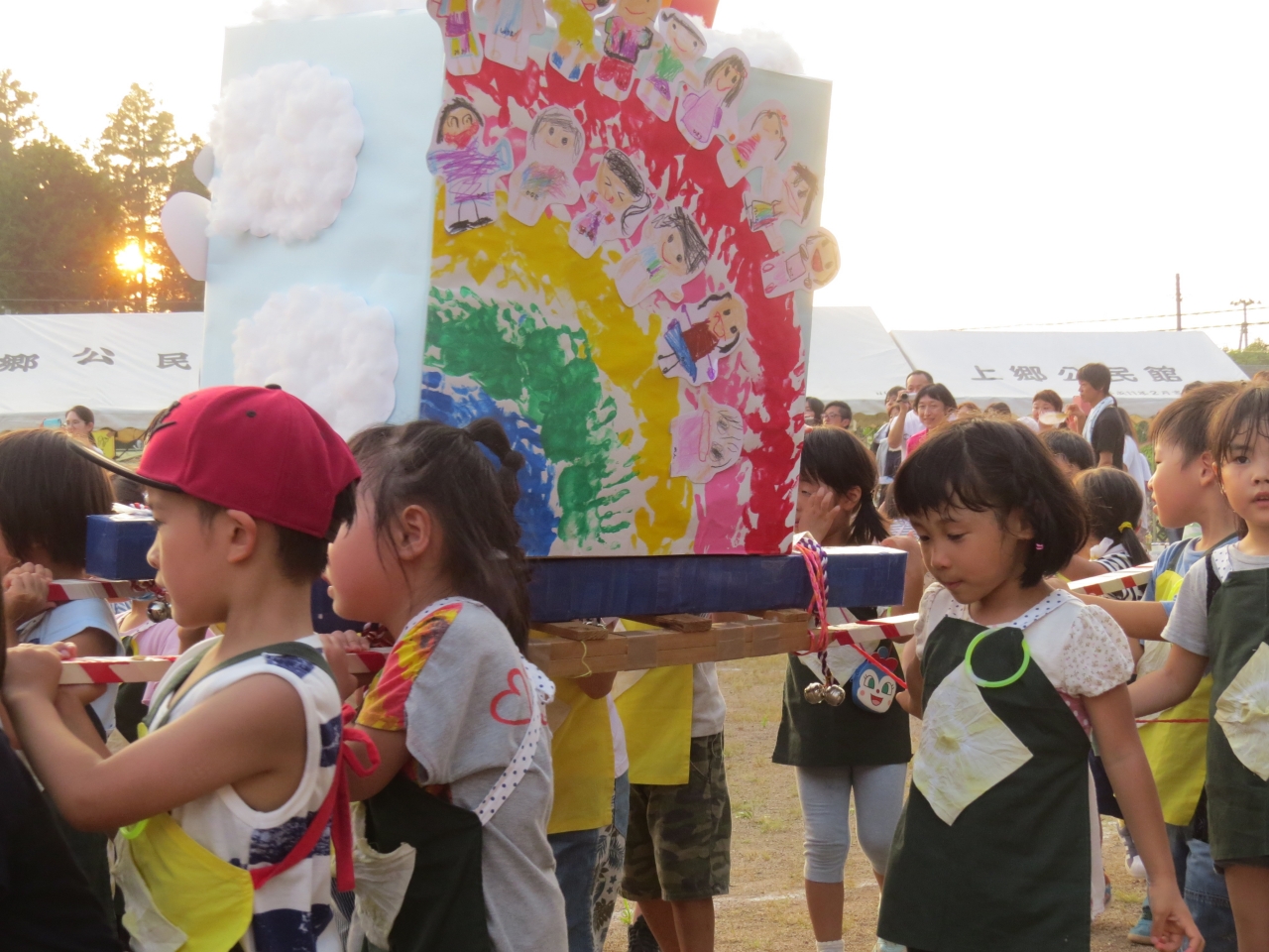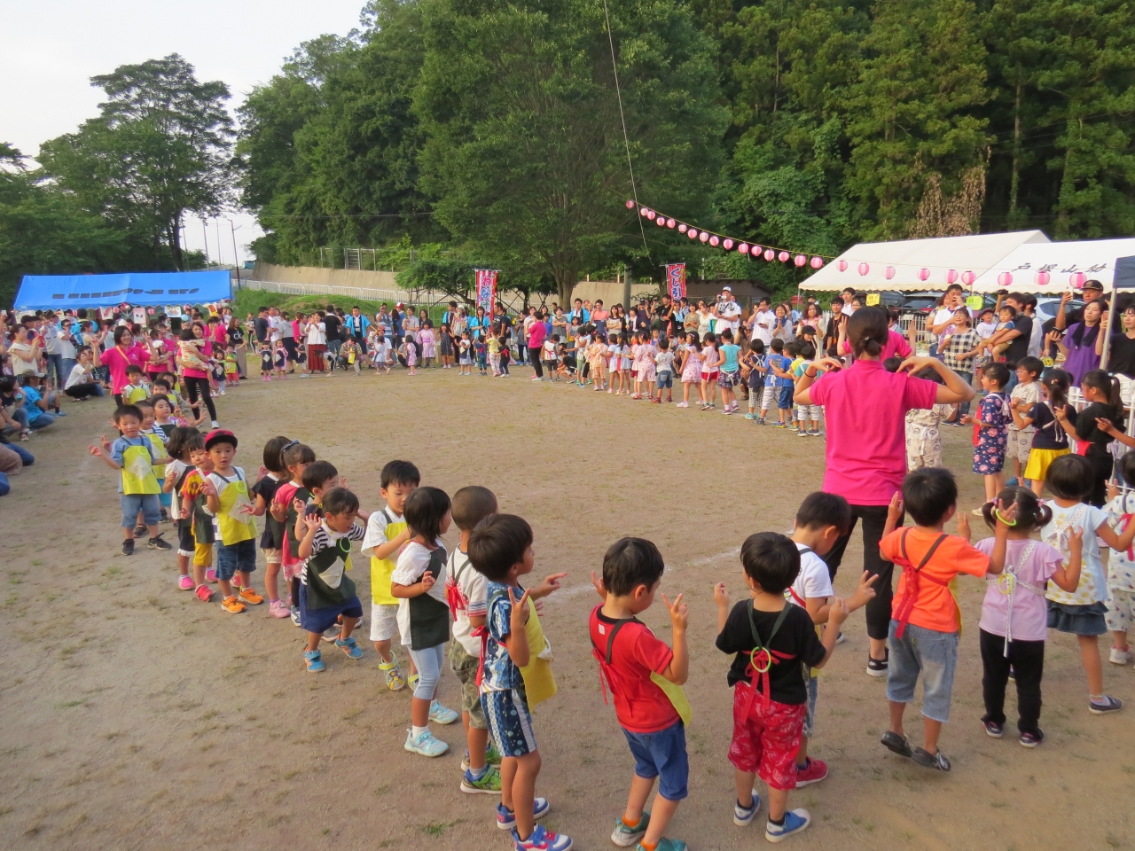 ふじ組(年長児)さんとすみれ組(年中児)さん、おみこしをかついで「ワッショイ!ワッショイ!」頑張りました。さくら組(年少さん)や乳児組さんも周りで応援をたくさんしてくれましたね。エビカニクス音頭もとっても上手に踊れていました。