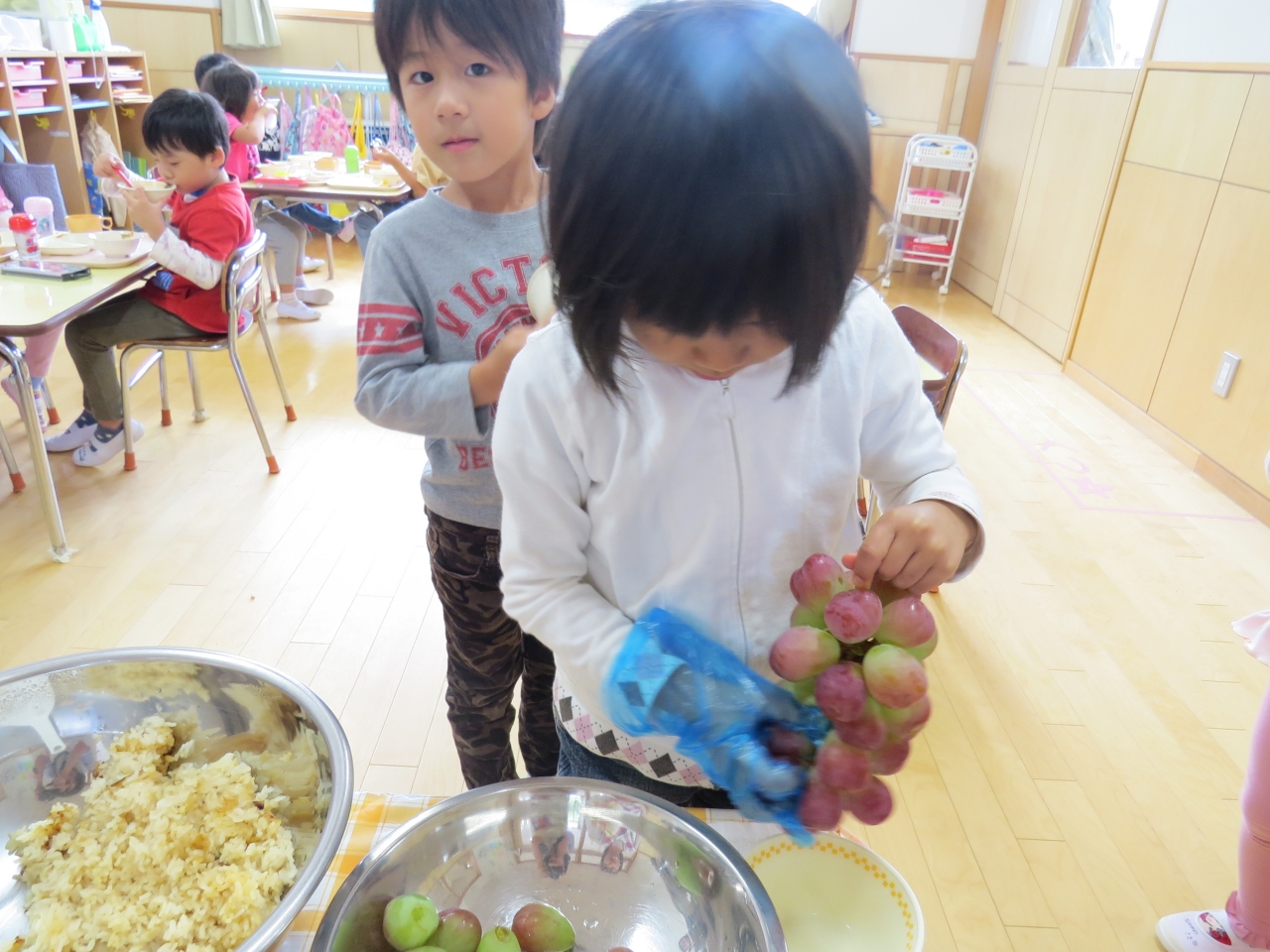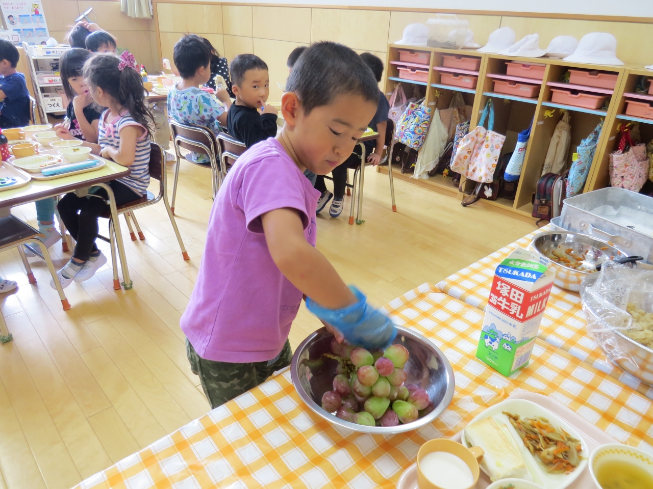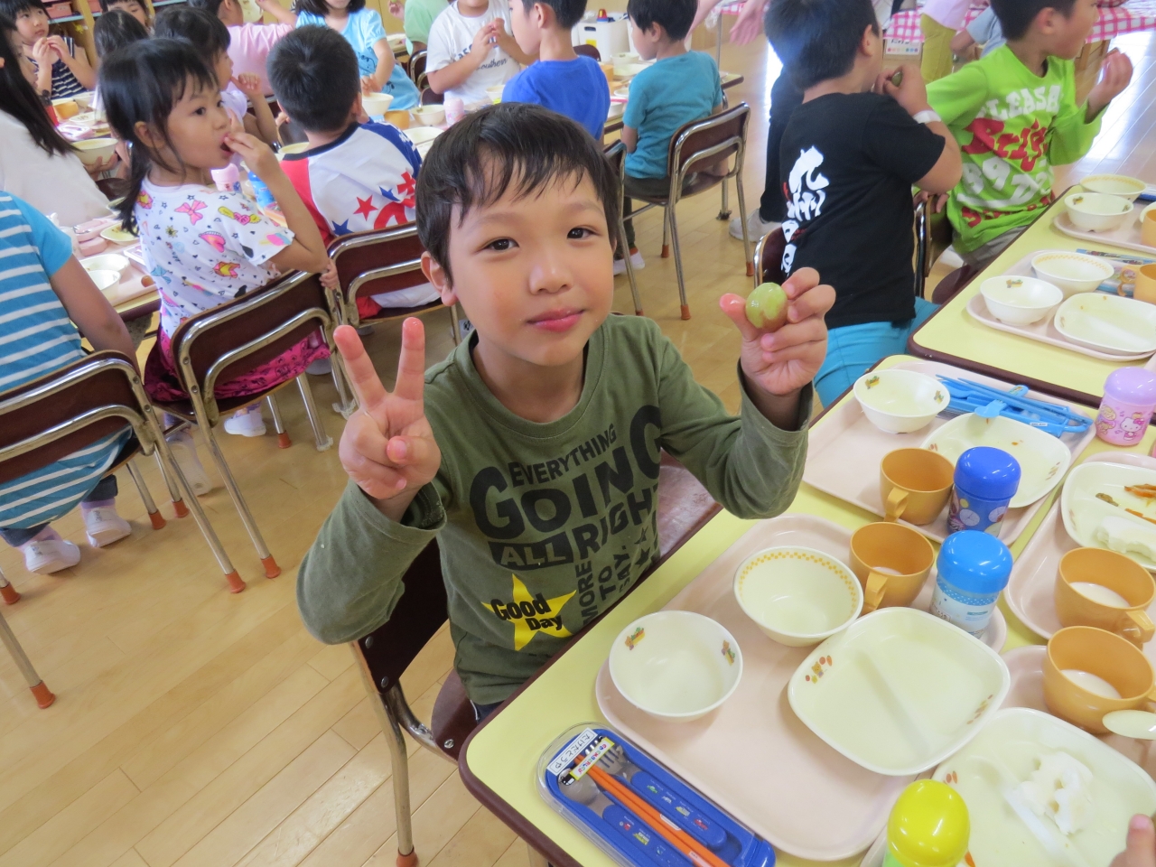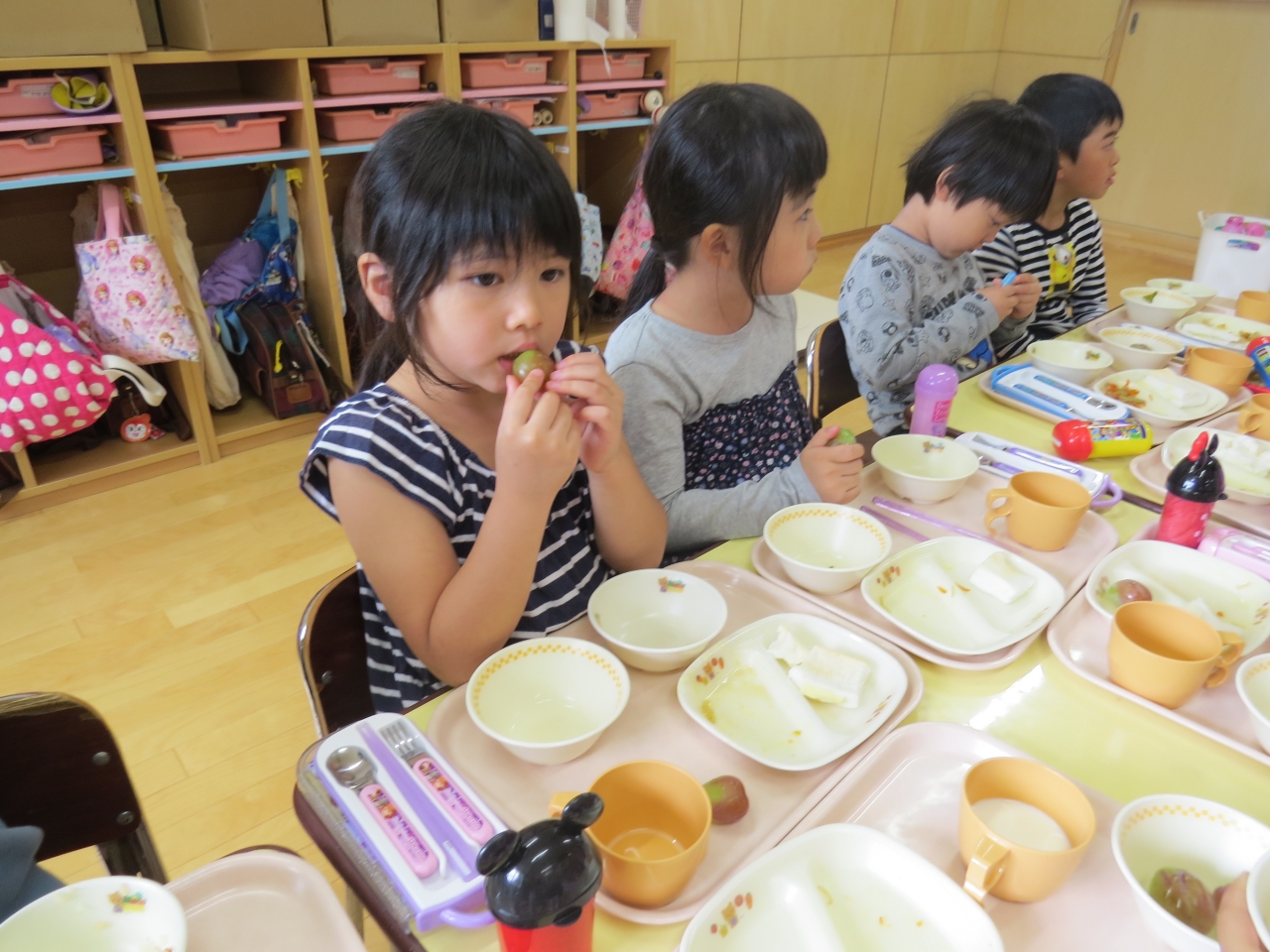 大きな粒のぶどうで食べ応えもあります。幼児組さんは、一房のぶどうから自分の食べる分をもいで食べました。