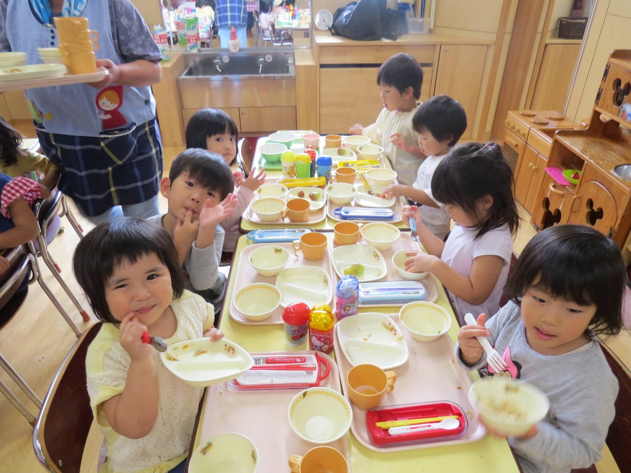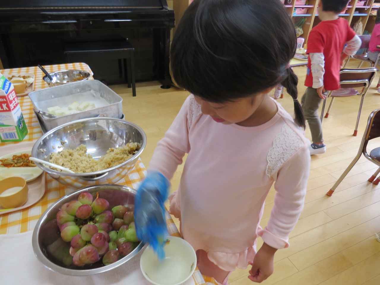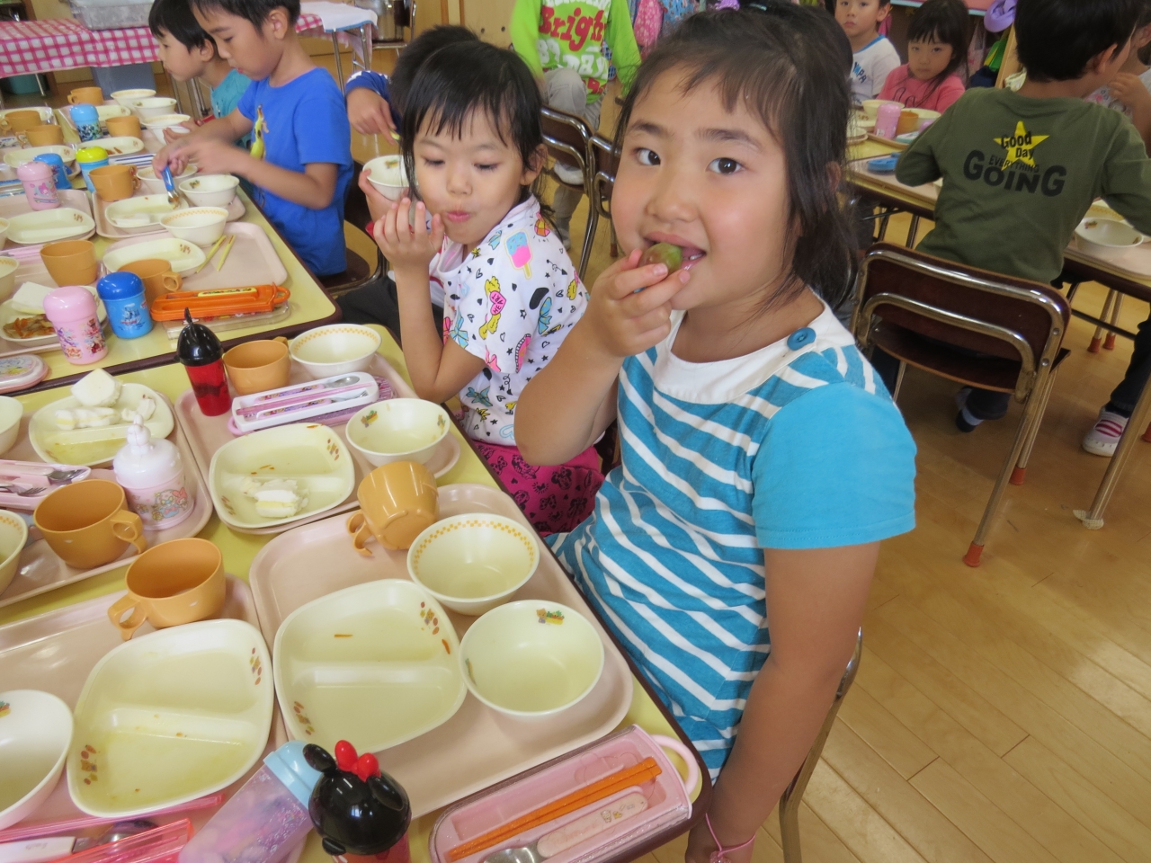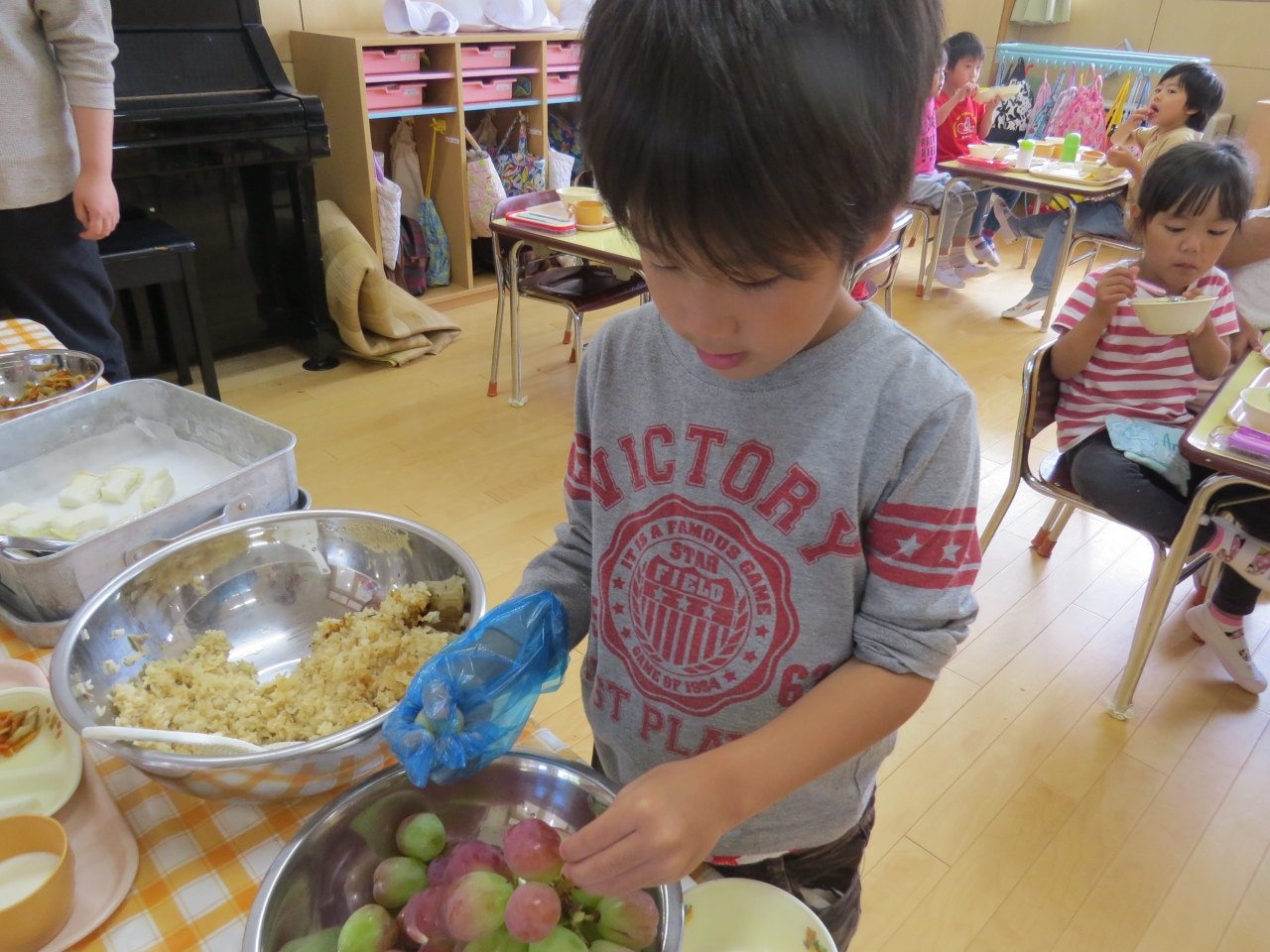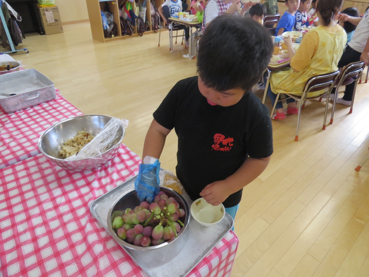 大きな粒のぶどうで食べ応えもあります。幼児組さんは、一房のぶどうから自分の食べる分をもいで食べました。