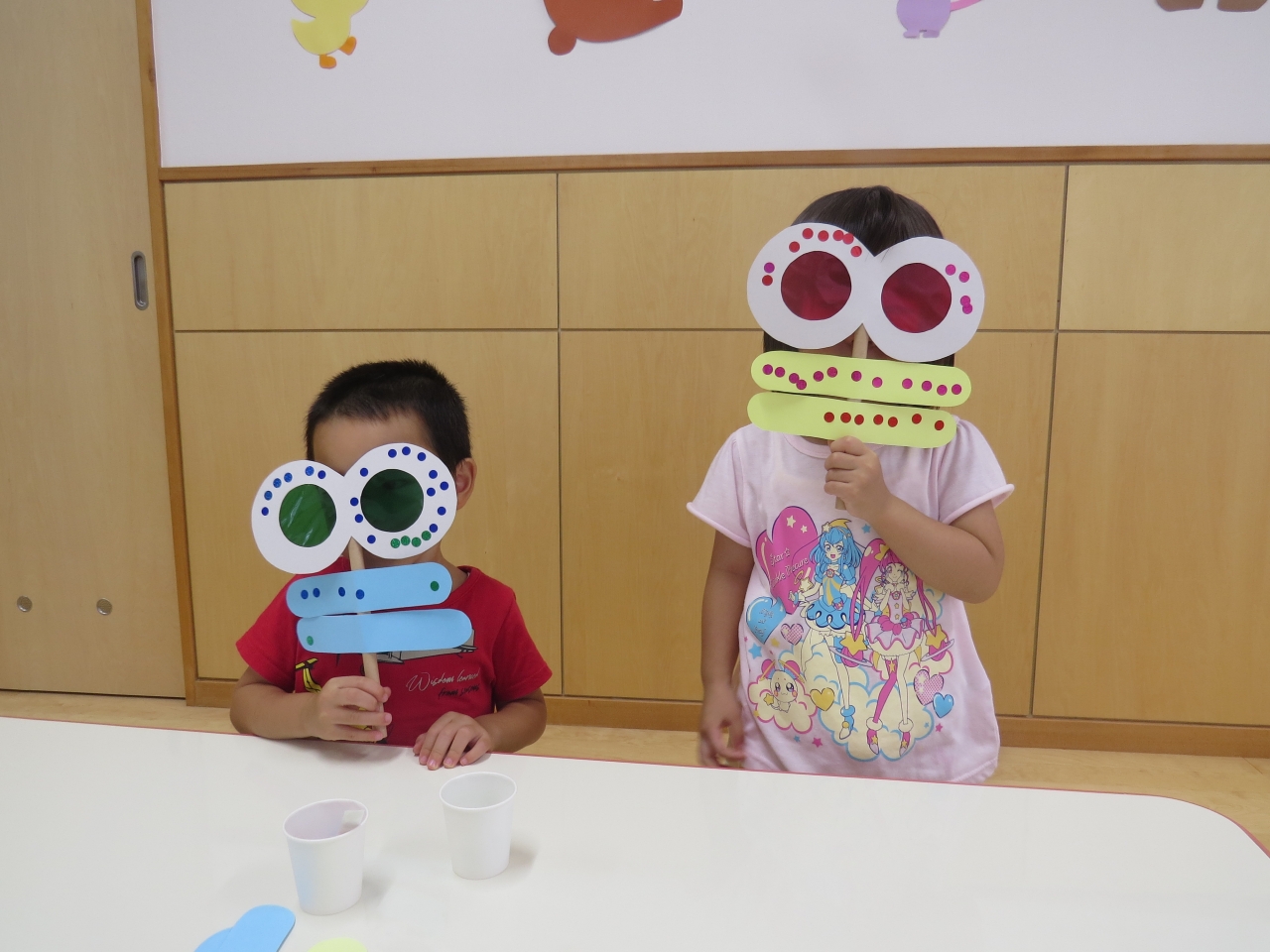 今回は読み聞かせの活動を行いました。「とんぼのあかねちゃん」という絵本を見てから、とんぼのめがねを作りました。