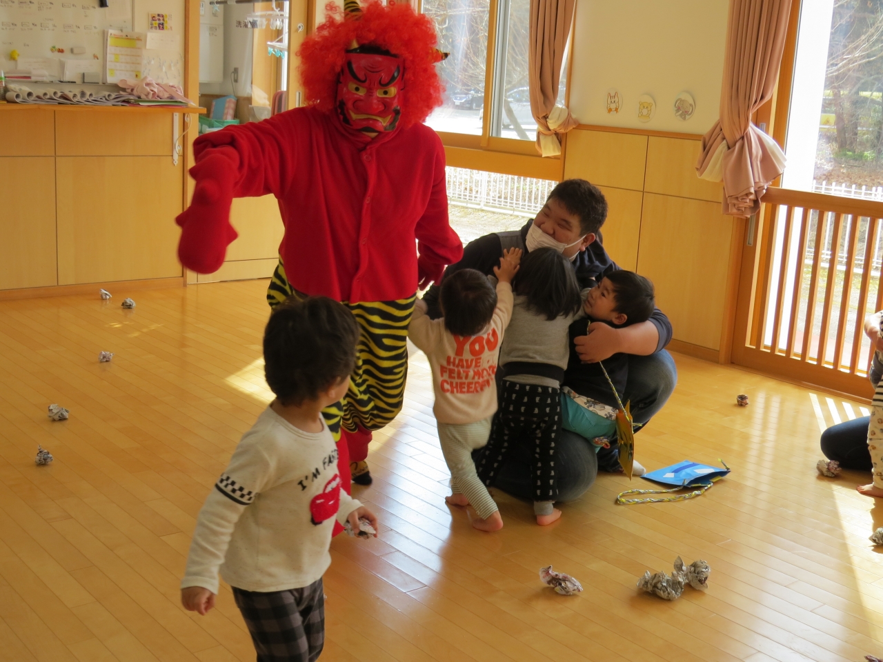 恐かったけど、みんな「オニはそと~!ふくはうち~!」頑張りました!鬼さん達も「まいった!まいった!」と疲れ果ててお山に帰っていきました。
