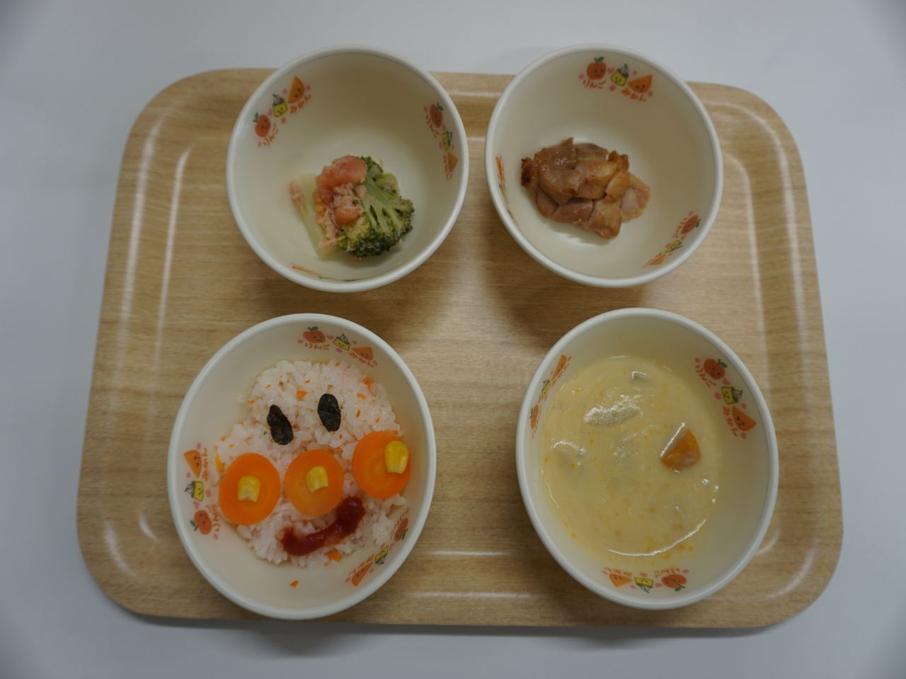 メニューは、キャロットライス・鶏肉の照り焼き・ブロッコリーのサラダ・かぼちゃと豆乳のスープ・りんご・牛乳でした。