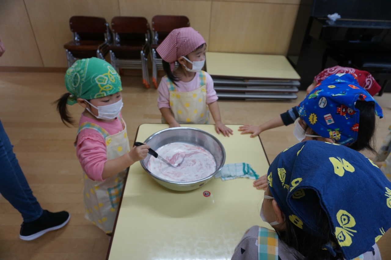 ぱんだ組さん(2歳児)はフルーチェの素と牛乳をグルグルと混ぜ、できたフルーチェにフルーツをトッピング!!
