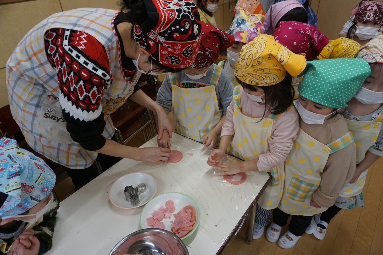 さくら組さん(年少児)はサンドウィッチに入れるハムの型抜きやブロッコリーを小房にちぎったりし頑張ってお料理をしました。
