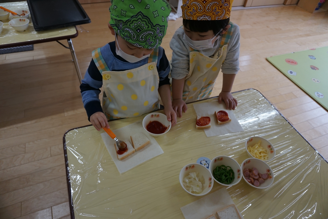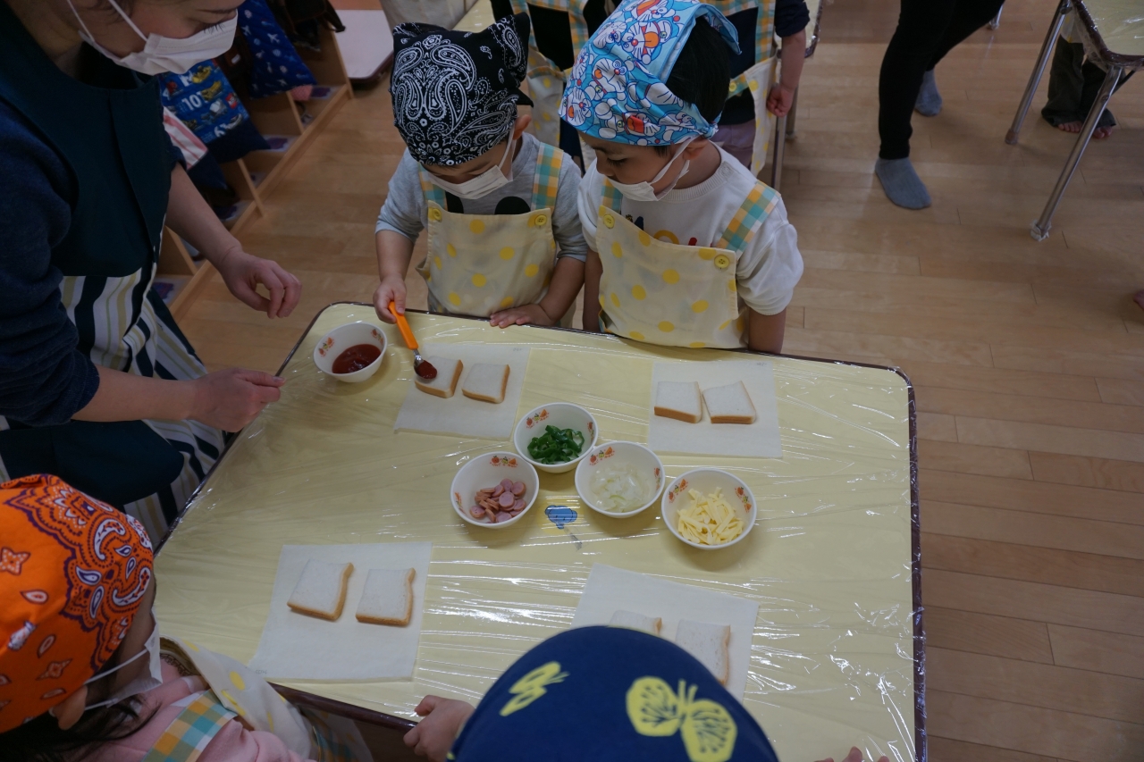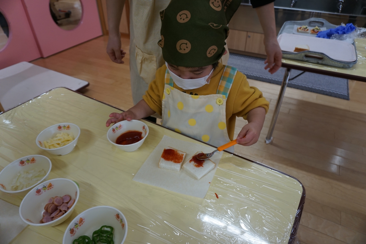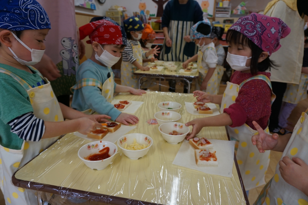3月5日(木)にぱんだ組さんがピザトースト作りを行いました。