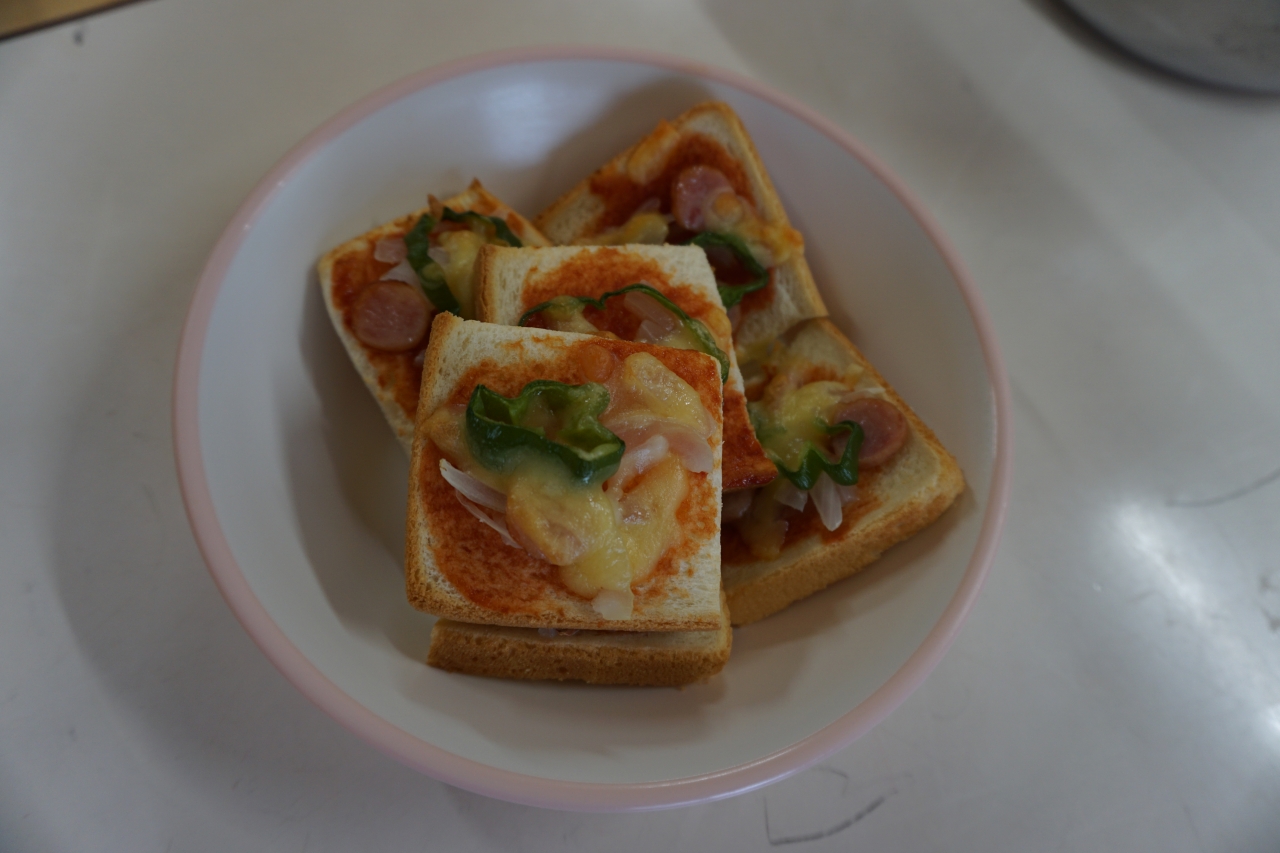 トマトケチャップを食パンに塗り、具材をトッピングし完成。子ども達は、真剣な表情で集中して作っていました。出来たものを給食の先生にオーブンで焼いてもらいました。