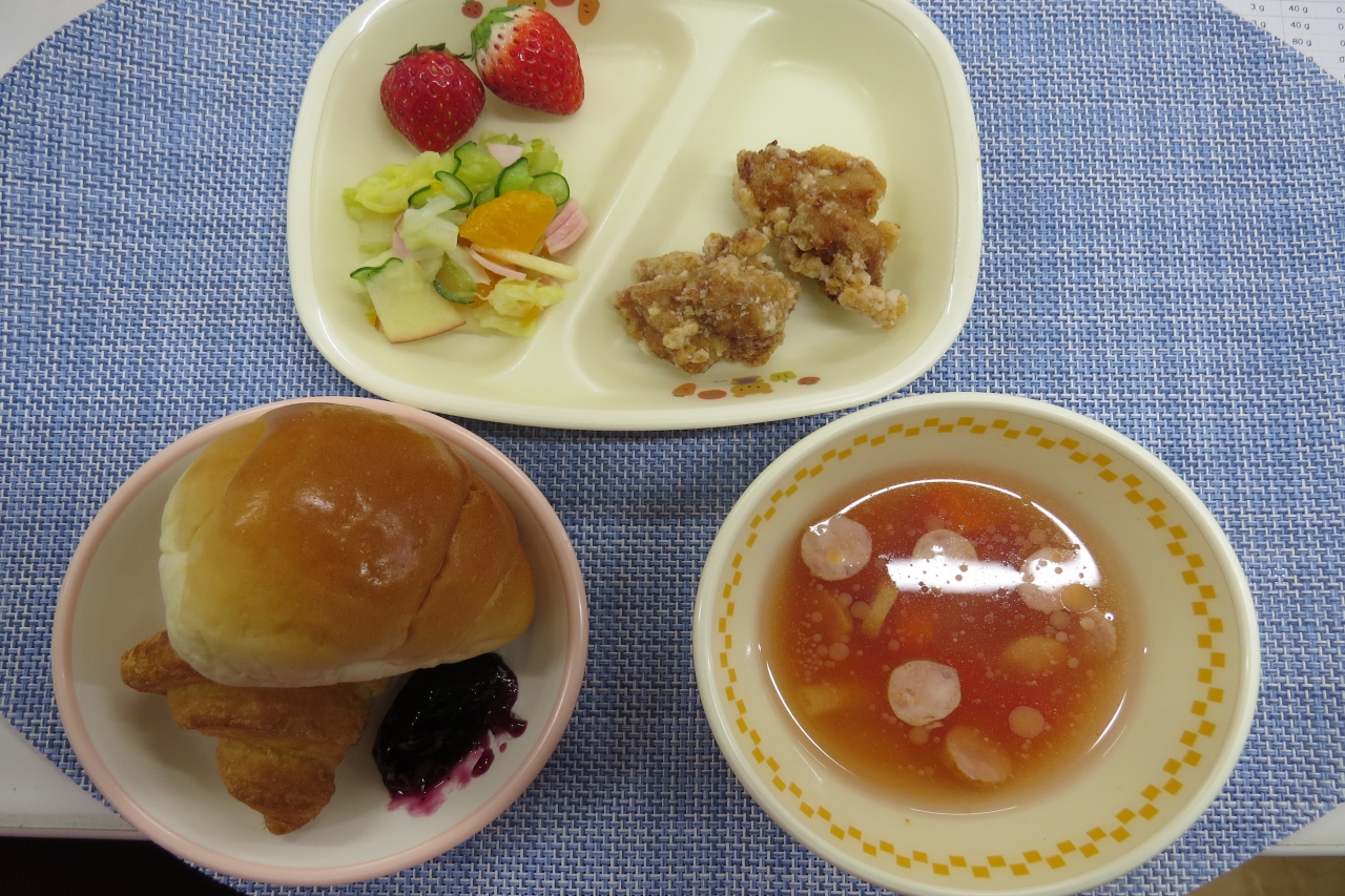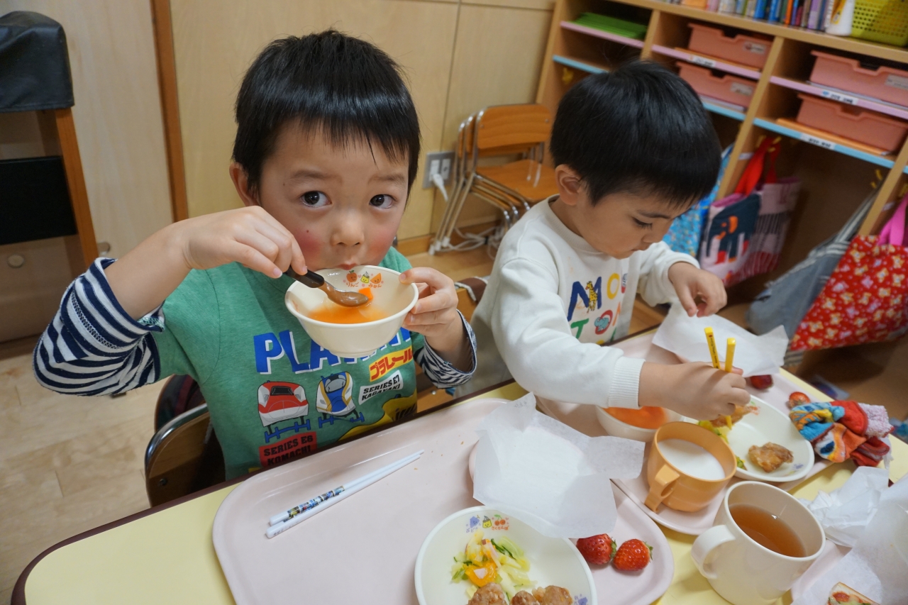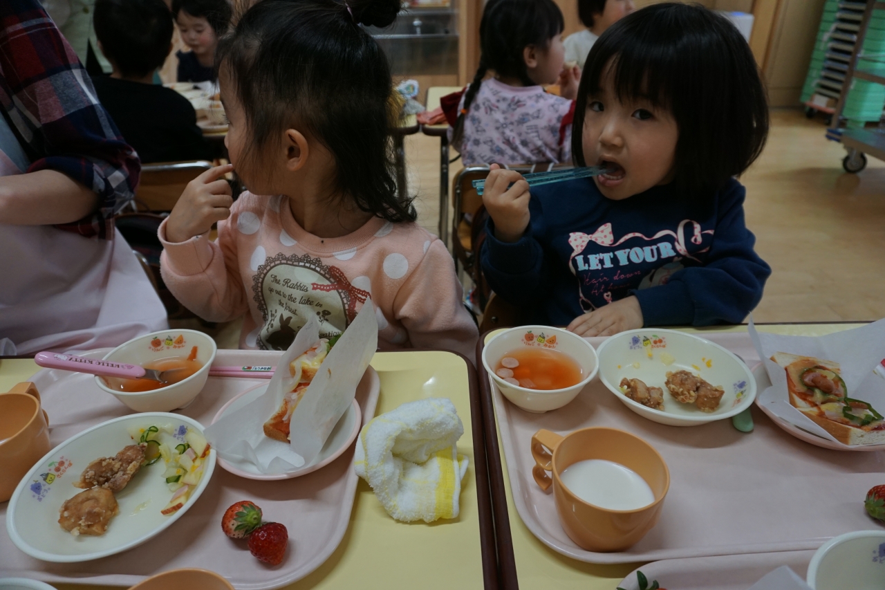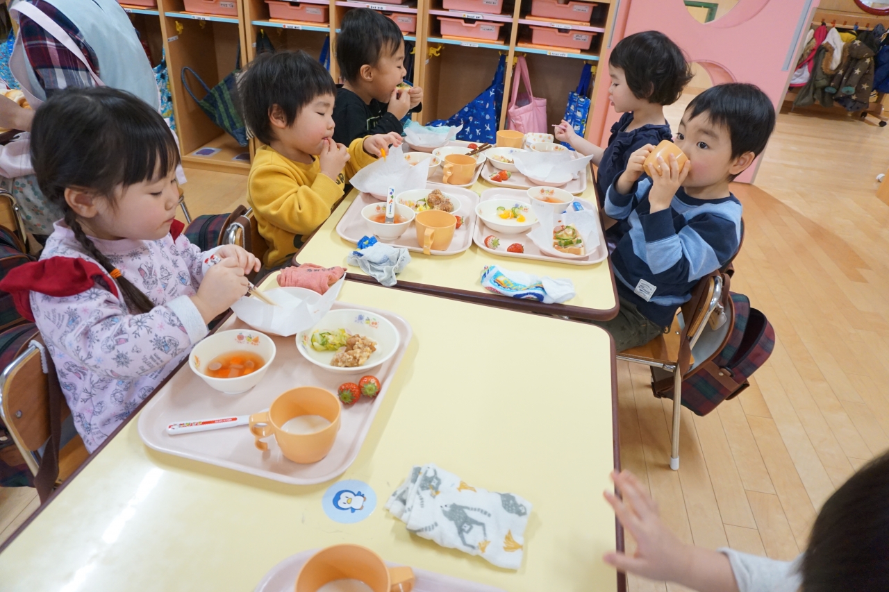 この日は、ふじ組さんのリクエストメニューでしたが、ぱんだ組さんだけ特別にピザ―トーストも食べました。自分達で作ったピザトーストはとっても美味しく、ピーマンが苦手なお友だちもこの日は食べることができていました!