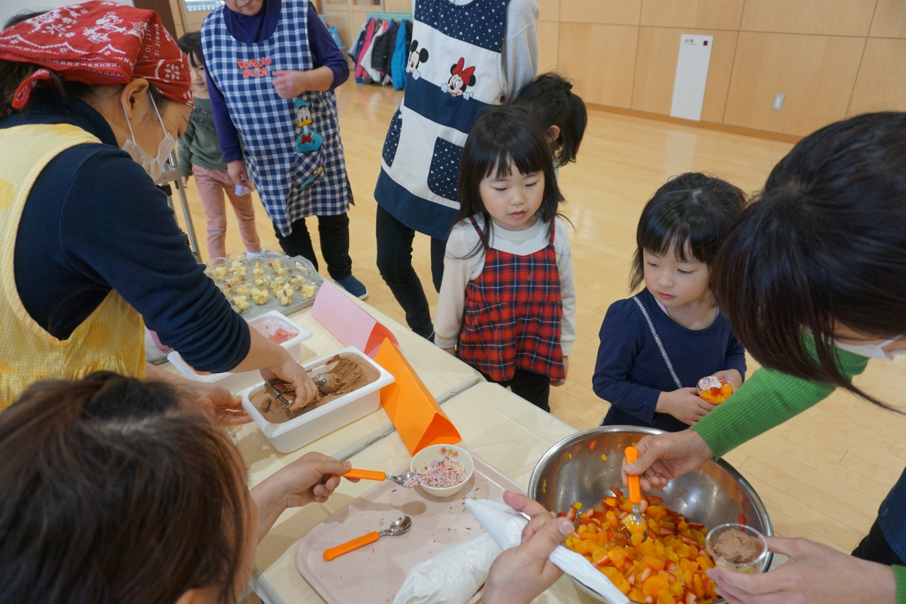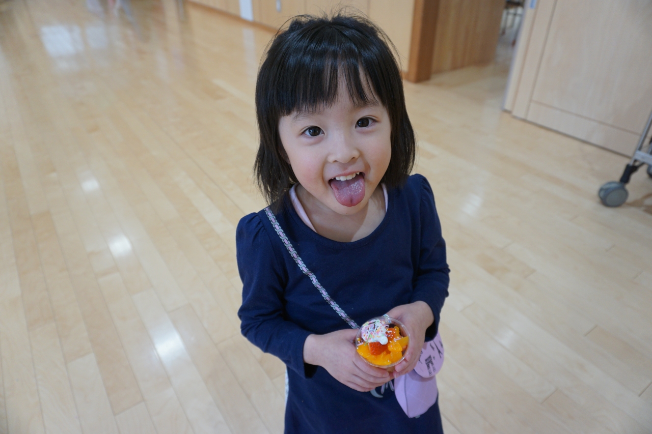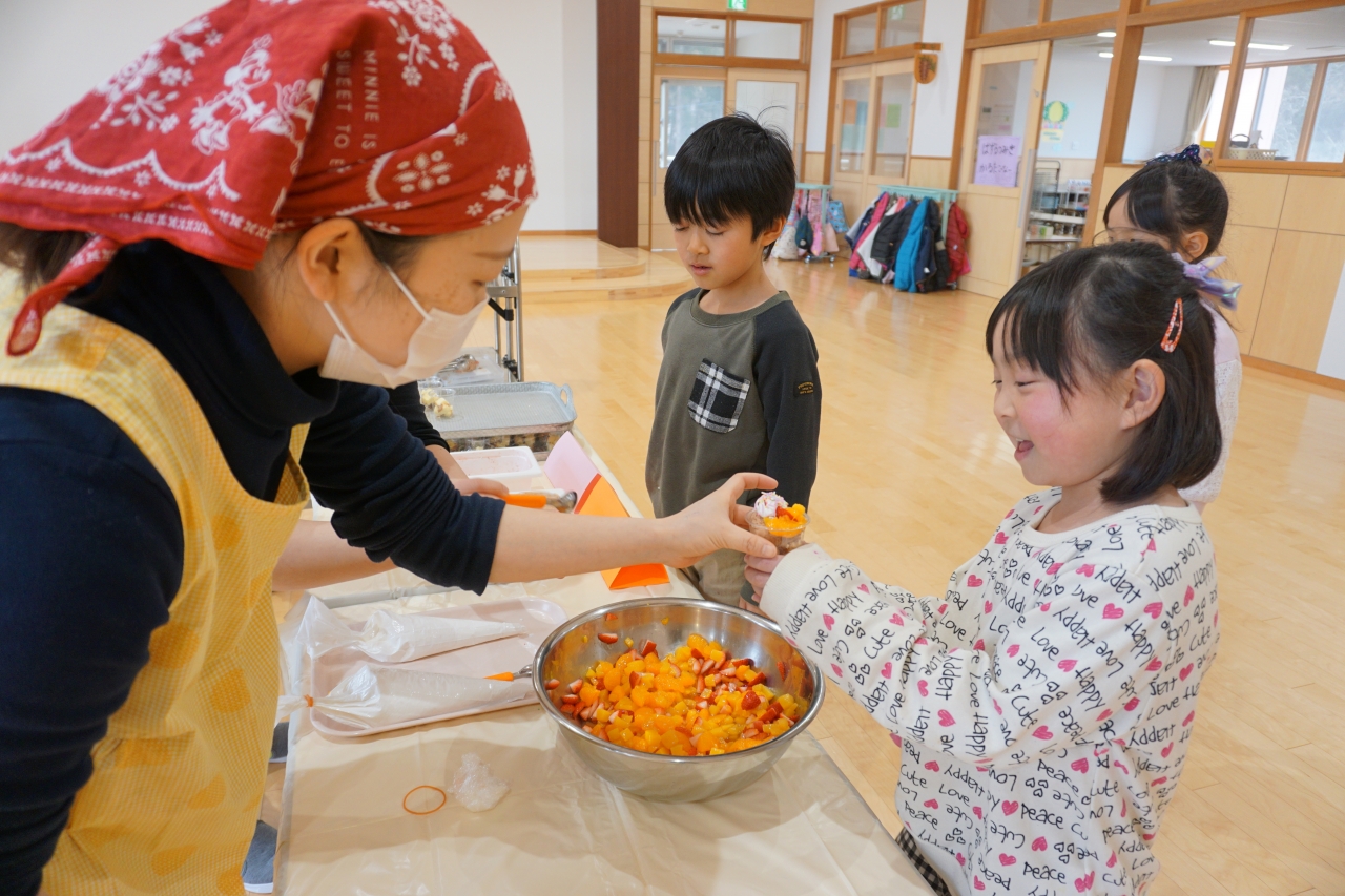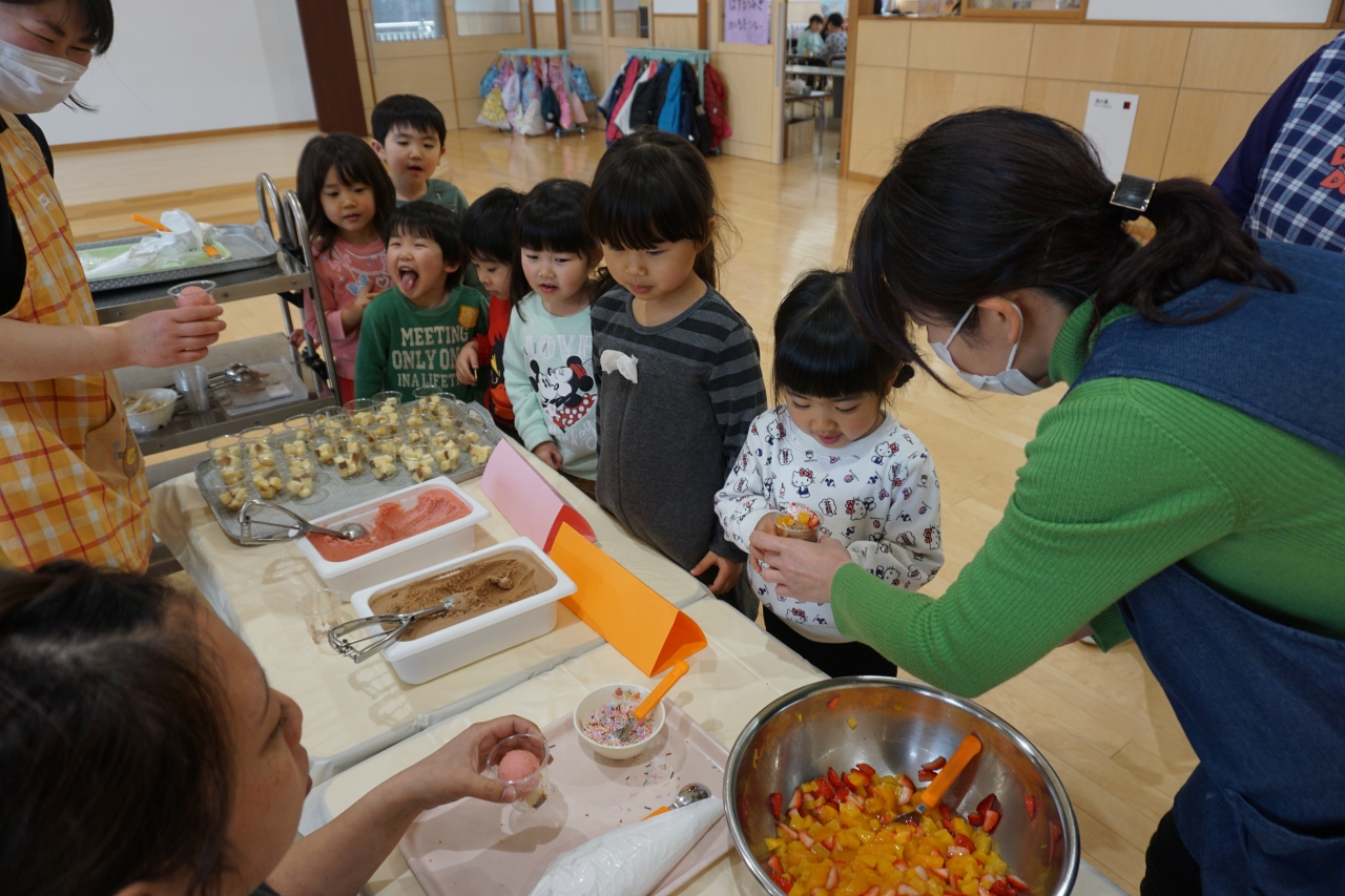 幼児組さんは、お遊戯室にアイス屋さんをオープンして、フルーツなどをトッピングしてオリジナルのパフェを作って食べました!