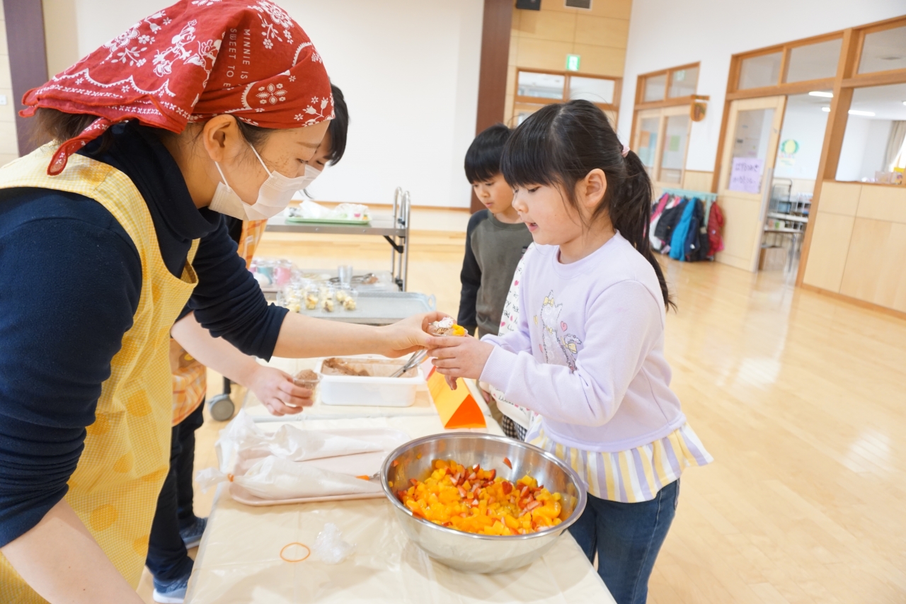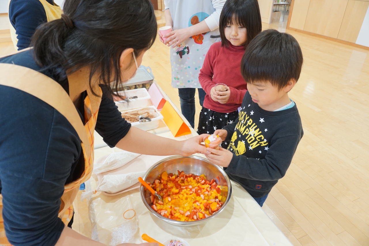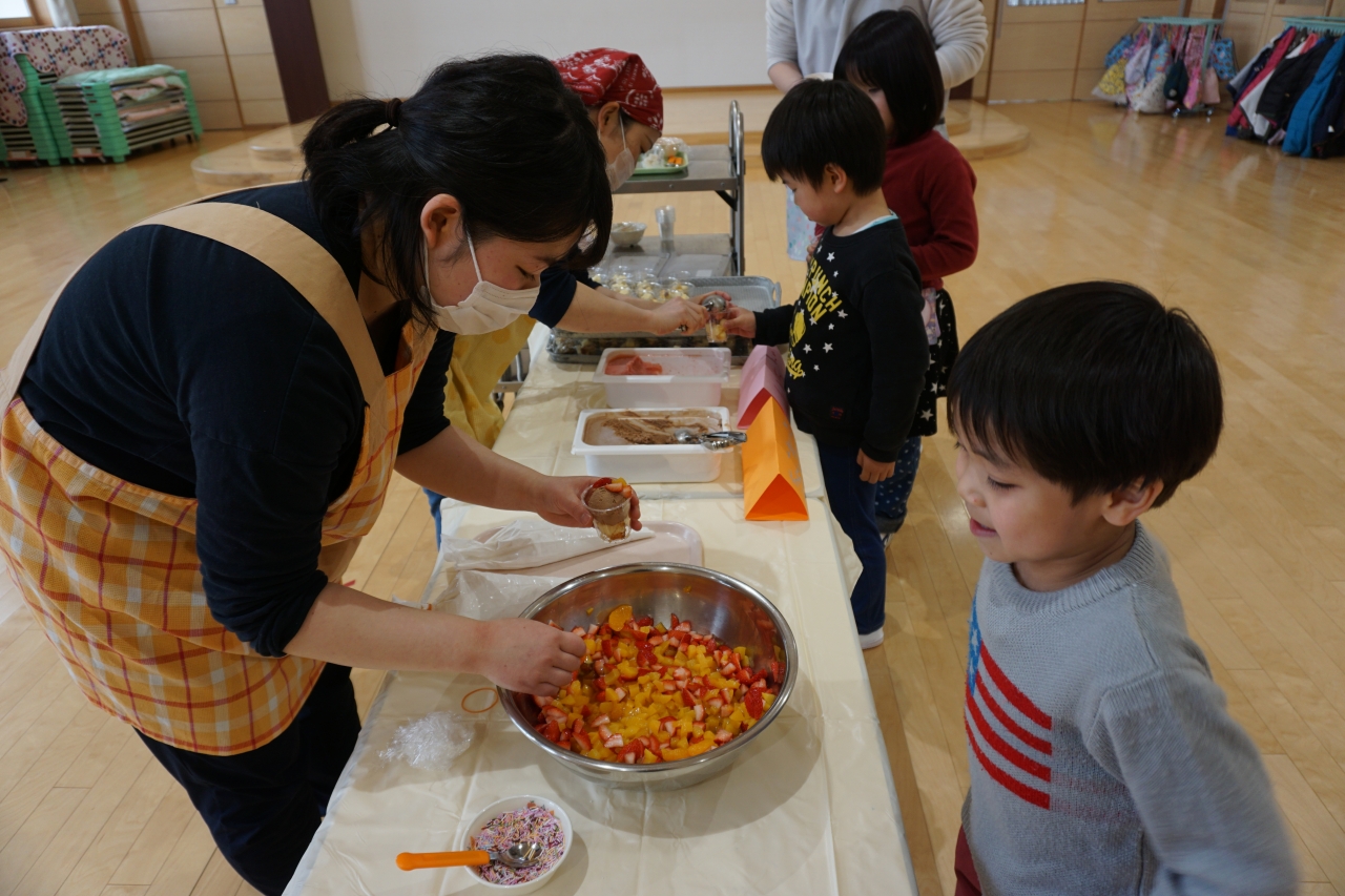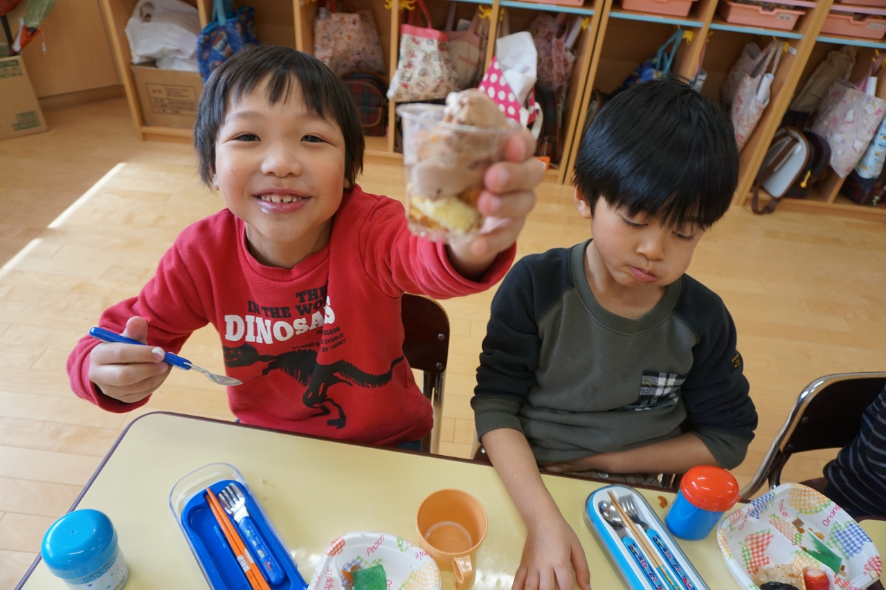 幼児組さんは、お遊戯室にアイス屋さんをオープンして、フルーツなどをトッピングしてオリジナルのパフェを作って食べました!