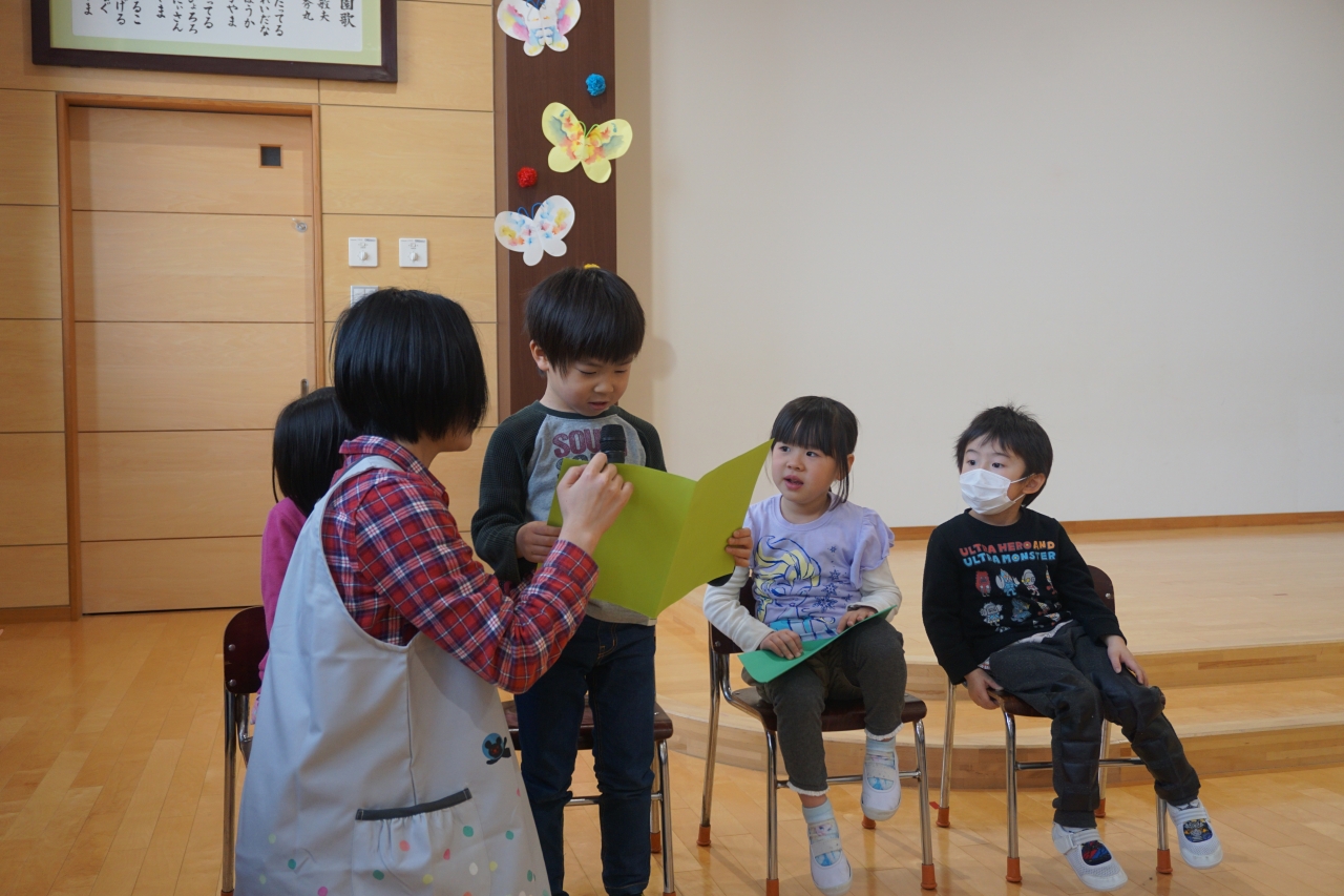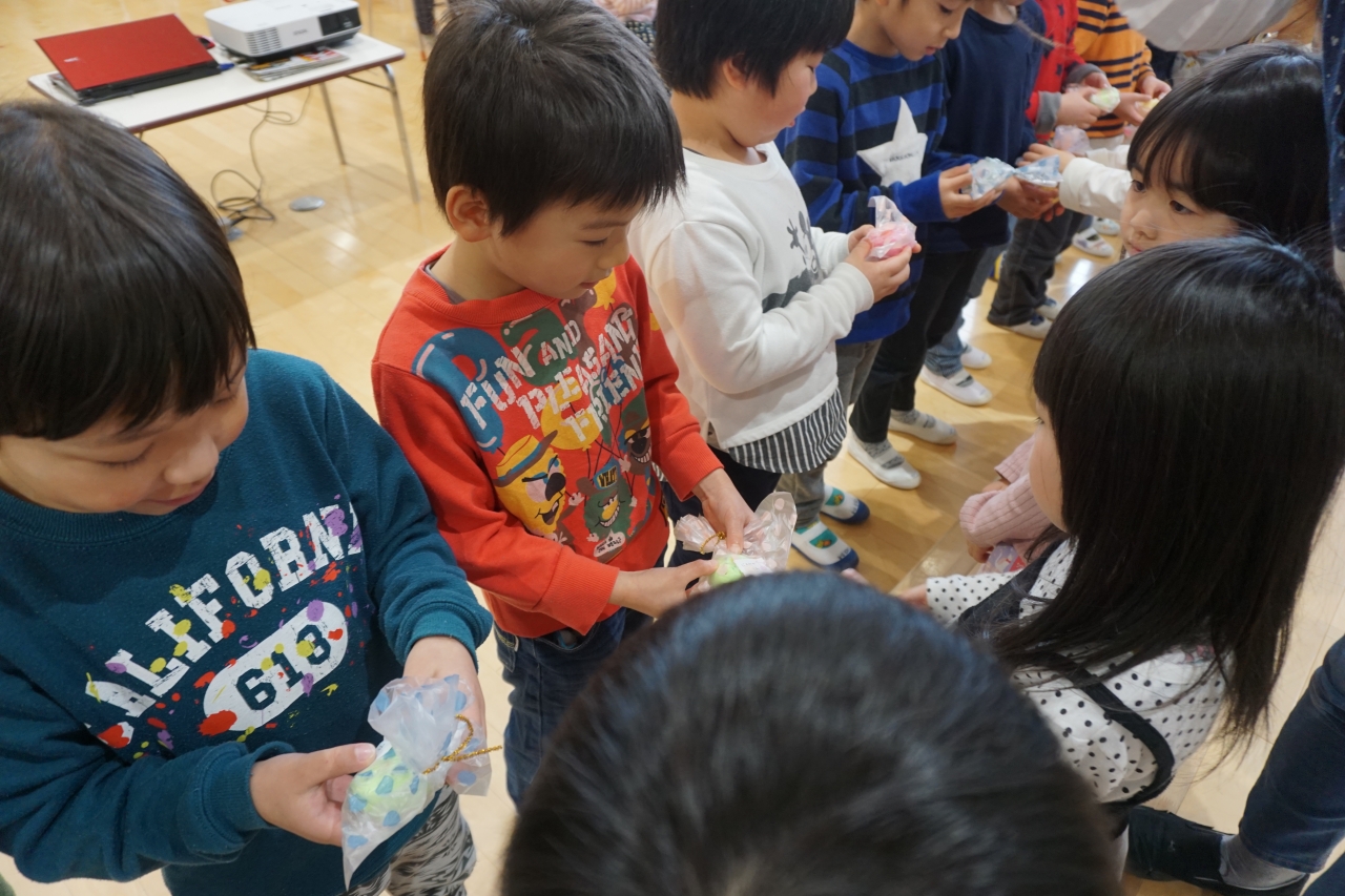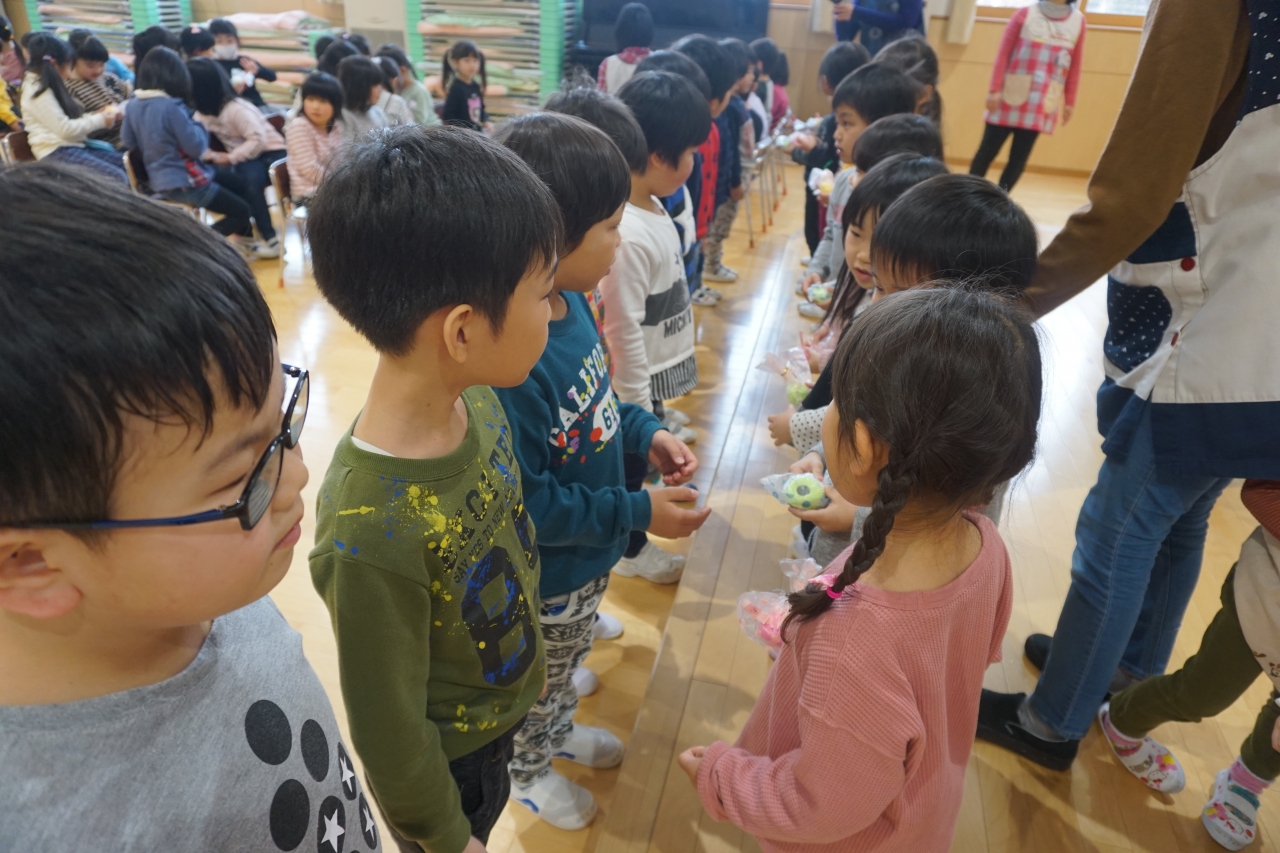 その中で、この回を進め中心となったのが年中さんでした。会の進行や劇のプレゼントなどを年長さんには内緒で頑張って練習してくれていました。年少さんは、歌のプレゼントと手作りのマグネットをプレゼントし、乳児組さんは元気な踊りのプレゼントを贈りました。
