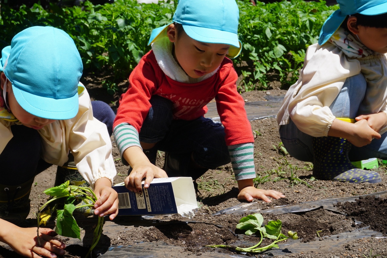 乳児組さんは園庭の砂場や遊具で遊んだり、幼児組さんは野菜の苗植えやお散歩、ザリガニとりなど戸塚山の自然を満喫しています!