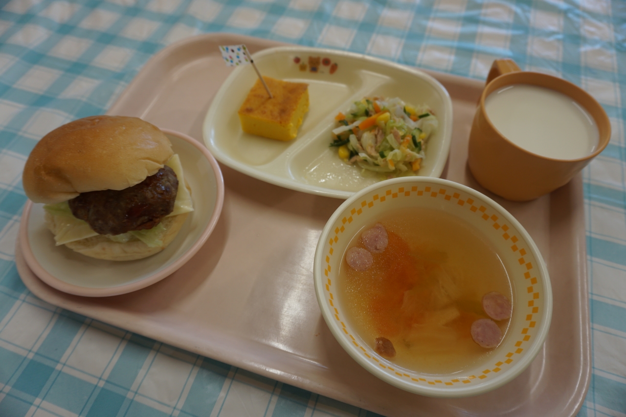 今日の給食も特別メニュー❤大きなハンバーガーに大喜びでした。
