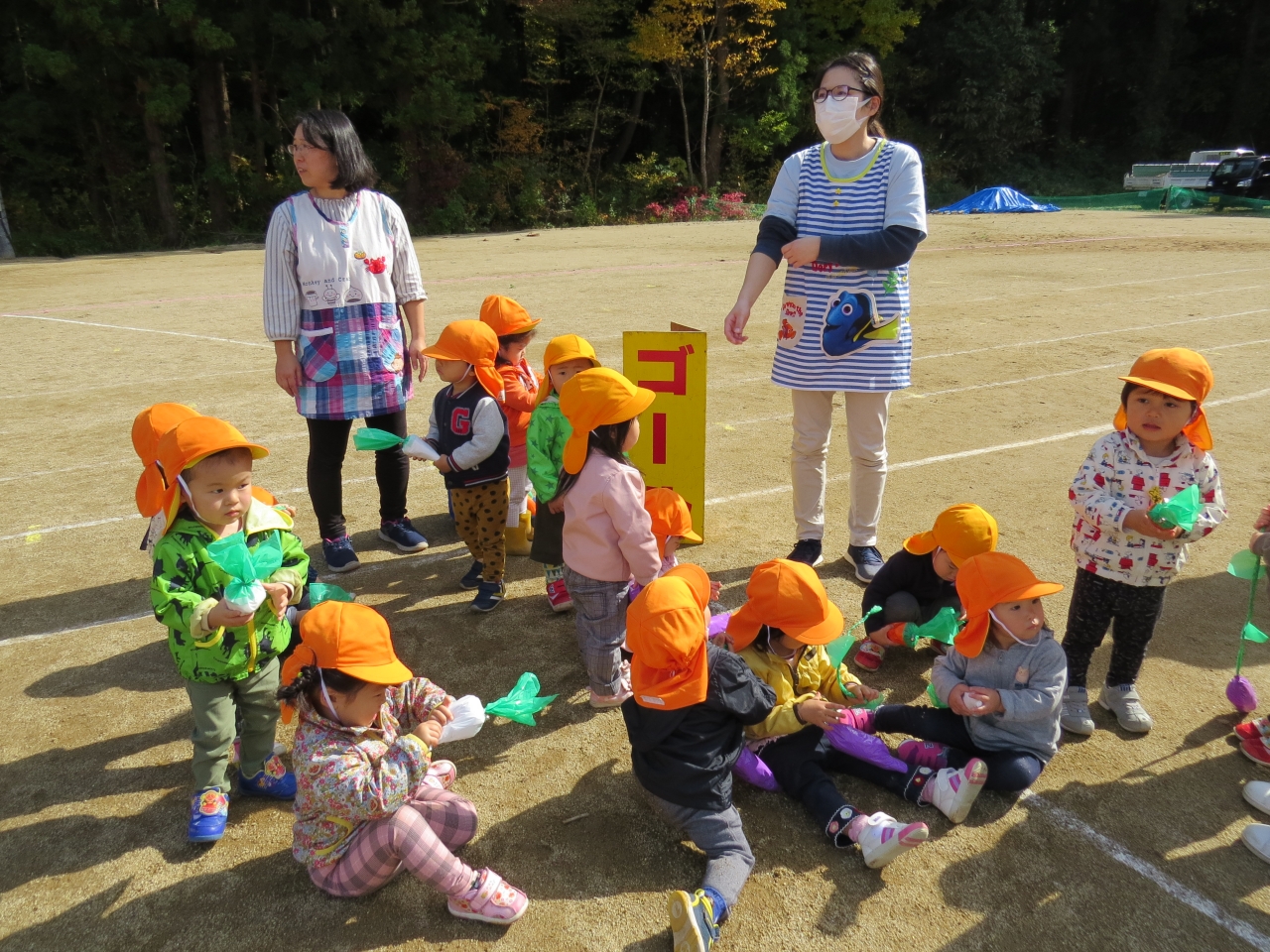 運動会は残念ながら中止となってしまいましたが、27日(火)にひよこ組さん・りす組さんでミニ運動会をしました!!