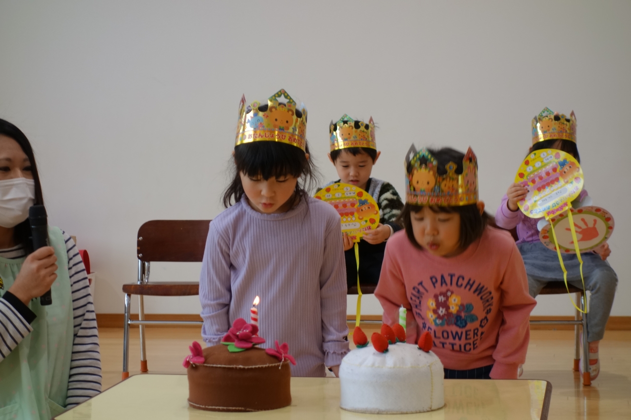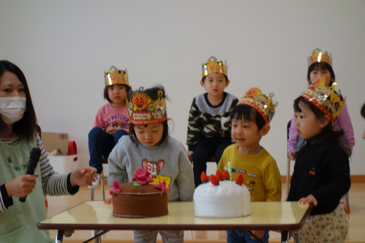 今日は1月生まれのお友だちのお誕生会。今月から2歳児さんも幼児組さんと一緒に参加してにぎやかなお誕生会となりました。