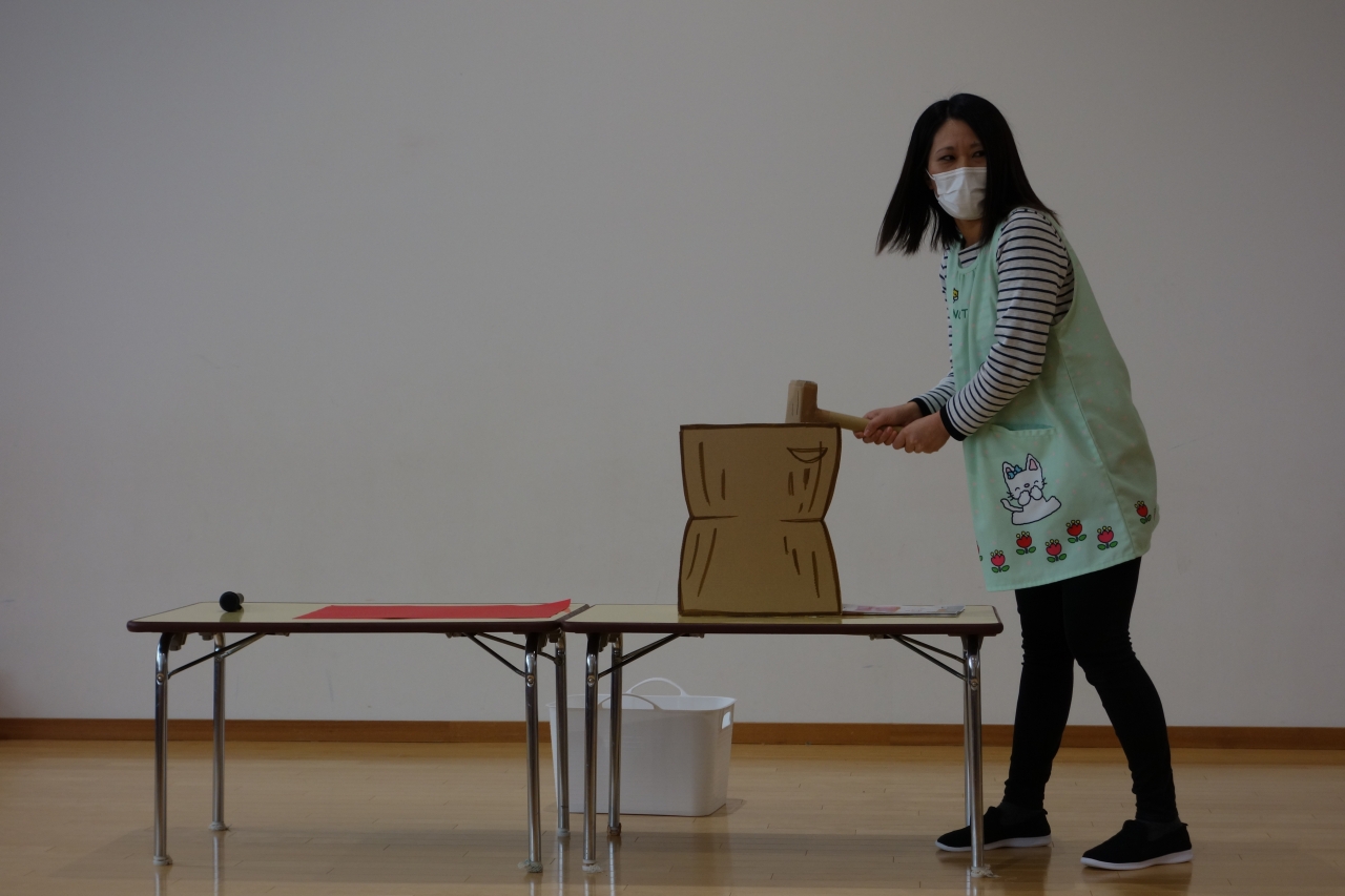 うすの中からおもち(トイレットペーパー)が伸びてくると、本物のおもちみたいで子どもたちもびっくりしていました。