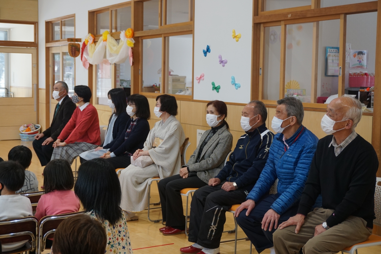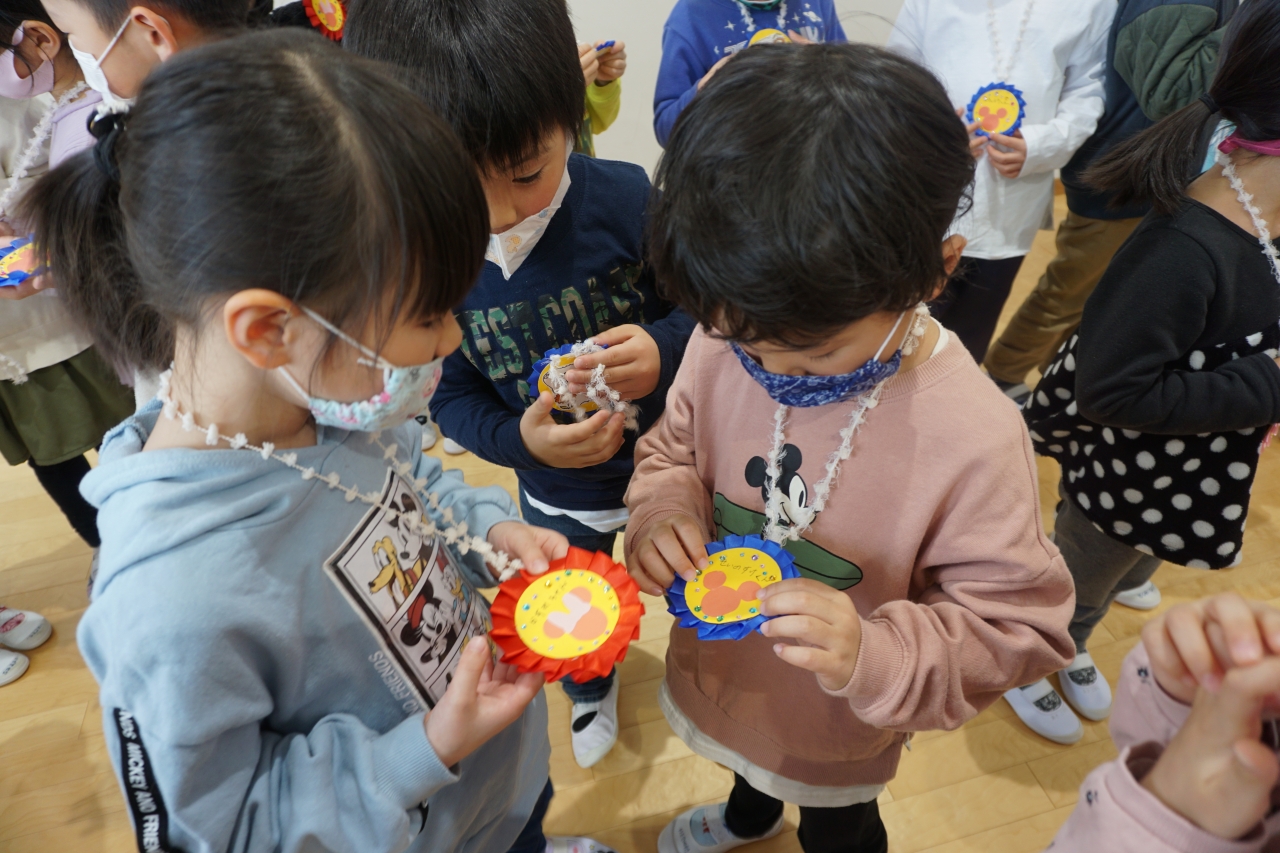乳児組さんからは踊りのプレゼント。年少、年中組さんからは歌や鉛筆立て、メダルのプレゼントを贈りました。